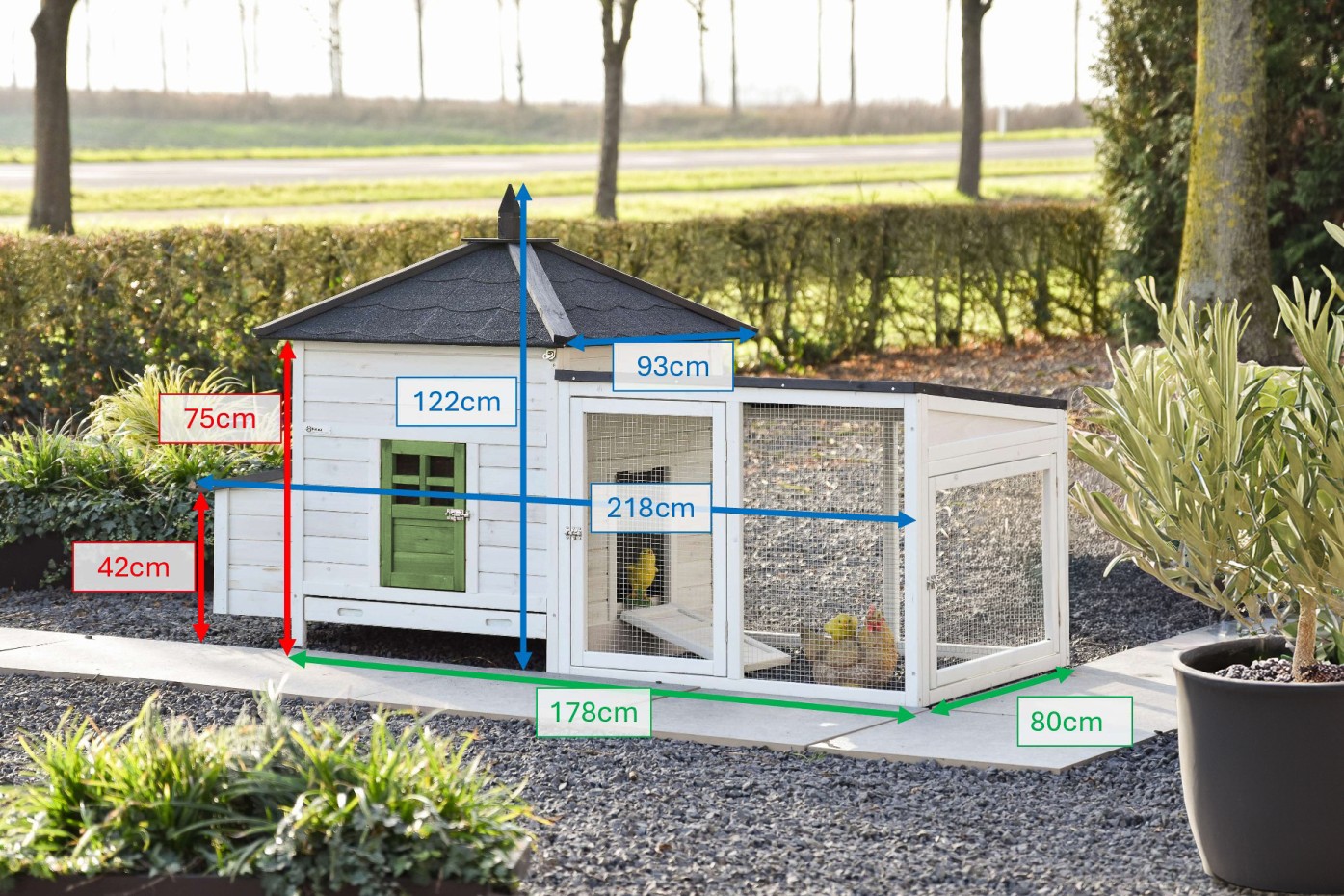 | Outer dimensions incl. roof and nest box (WxDxH) | 218x93x122cm |