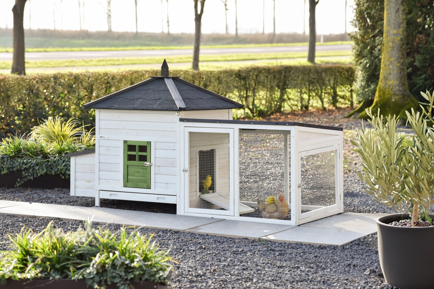 This splendid chickencoop Ambiance Large is impeccably finished down to the last detail! It features a convenient, extendable droppings tray and a removable roof. The hutch for your chickens Ambiance Large boasts beautiful and practical details, along with a useful run that can be endlessly expanded. This module can be fitted into most gardens. The night coop is suitable for a maximum of 4-6 chickens, depending on breed size.