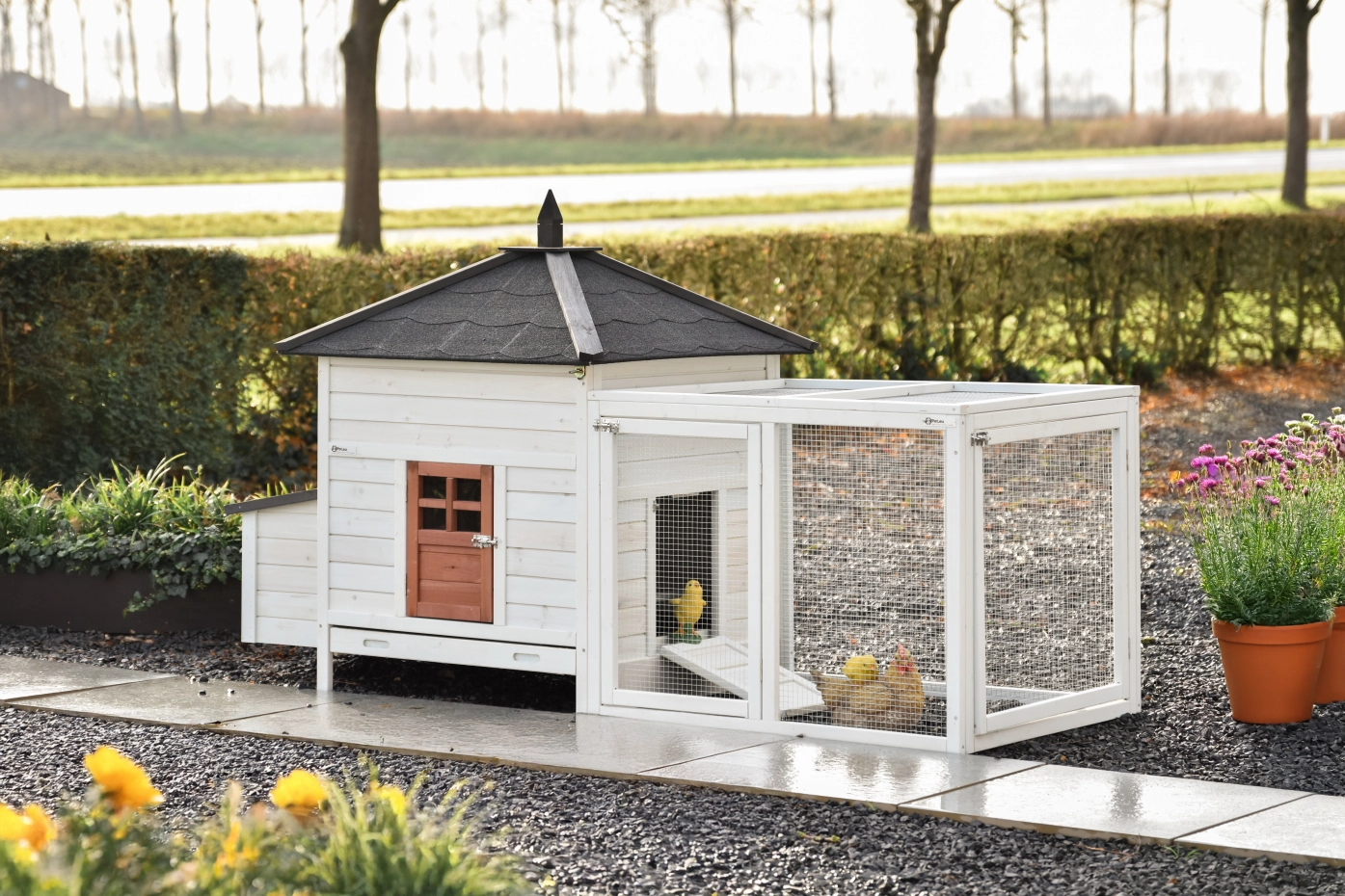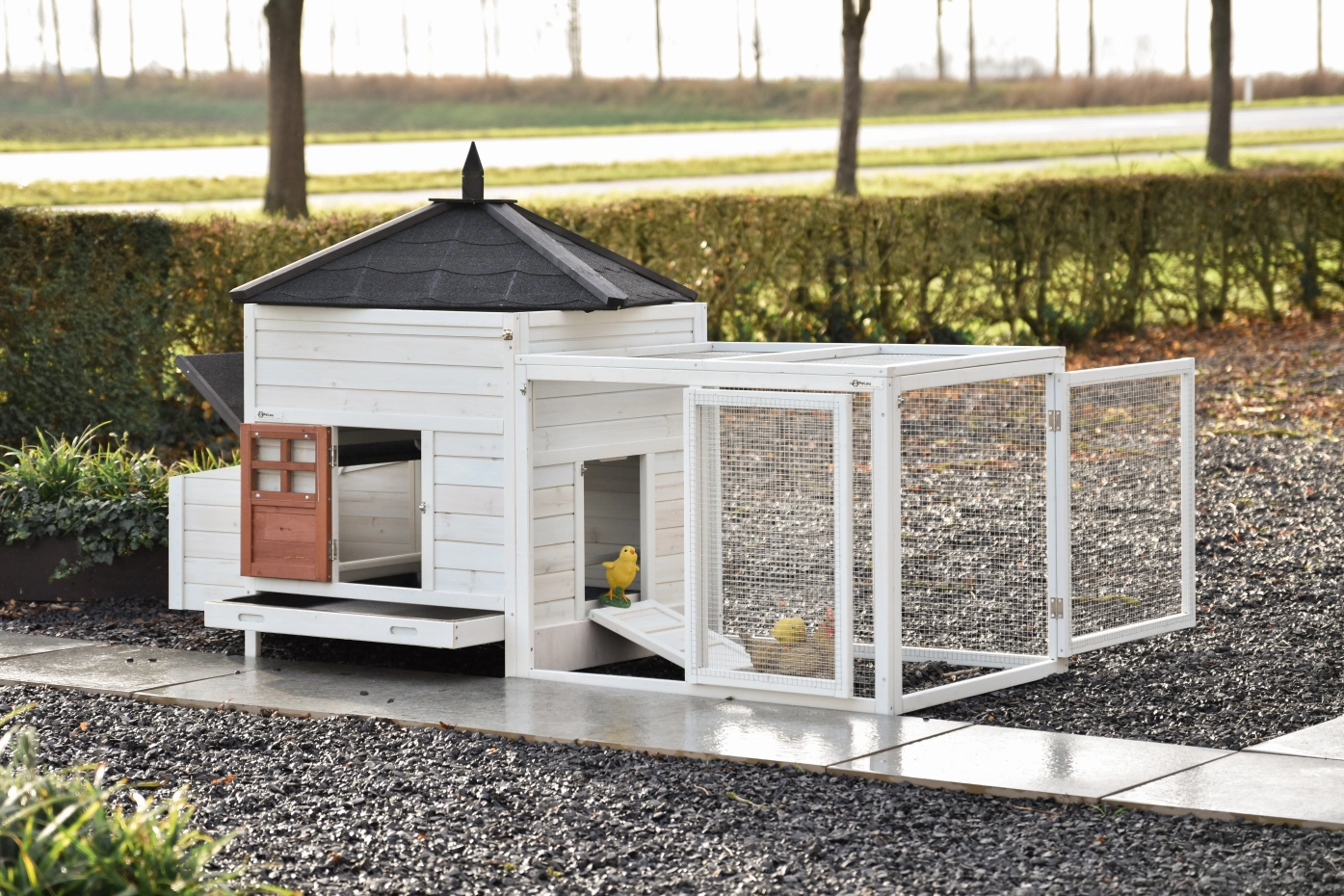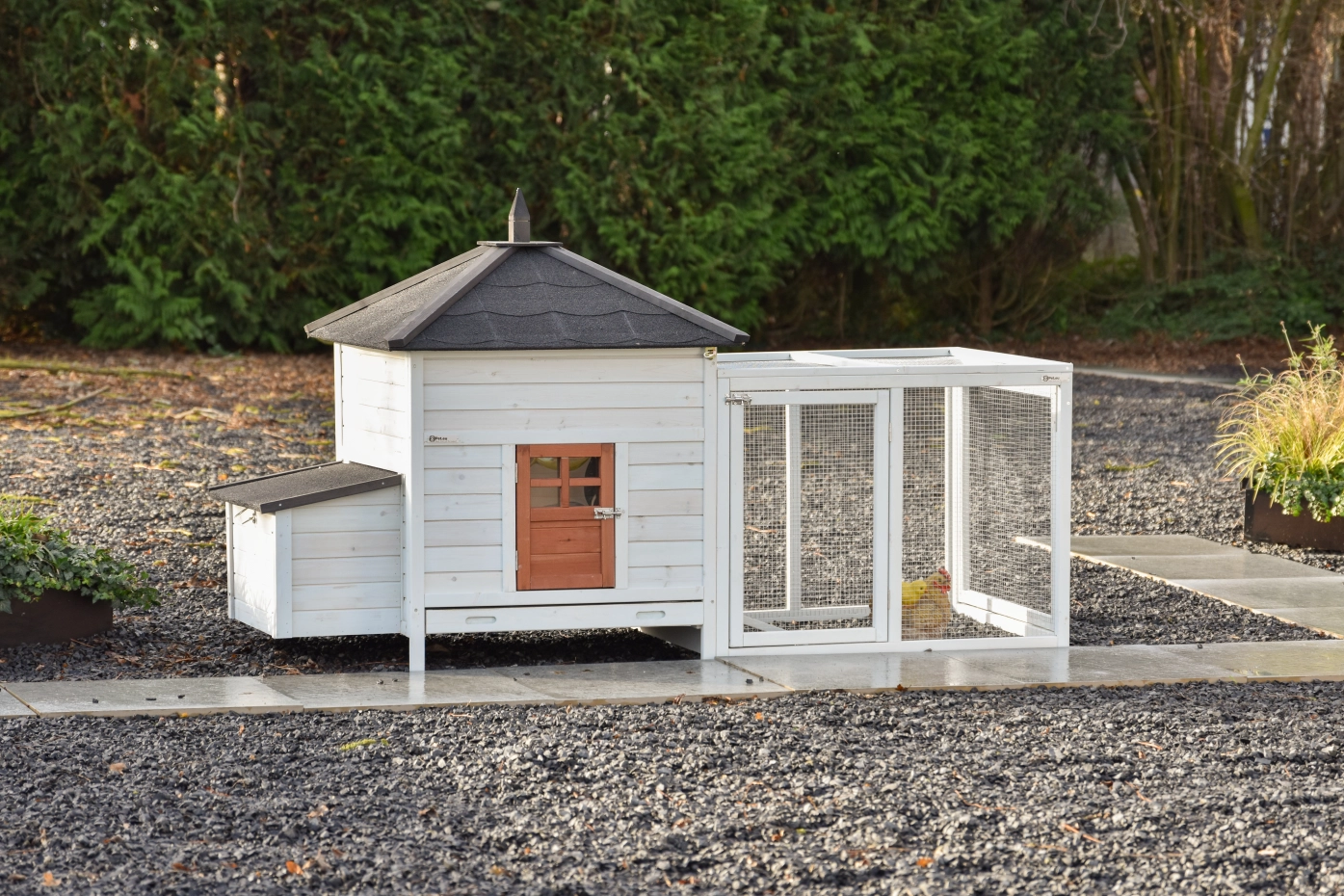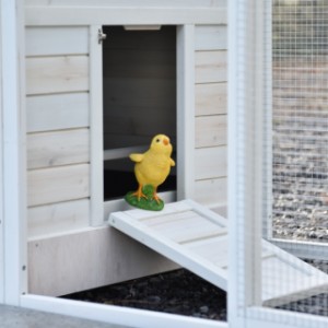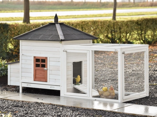 This splendid chickencoop Ambiance Large is impeccably finished down to the last detail! It features a convenient, extendable droppings tray and a removable roof. The hutch for your chickens Ambiance Large boasts beautiful and practical details, along with a useful run that can be endlessly expanded. This module can be fitted into most gardens. The night coop is suitable for a maximum of 4-6 chickens, depending on breed size.