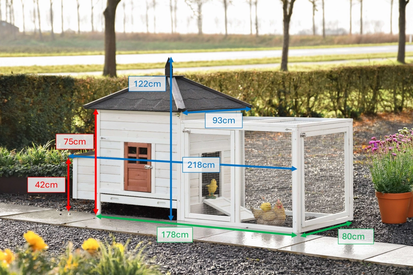 | Outer dimensions incl. roof and nest box (WxDxH) | 218x93x122cm |