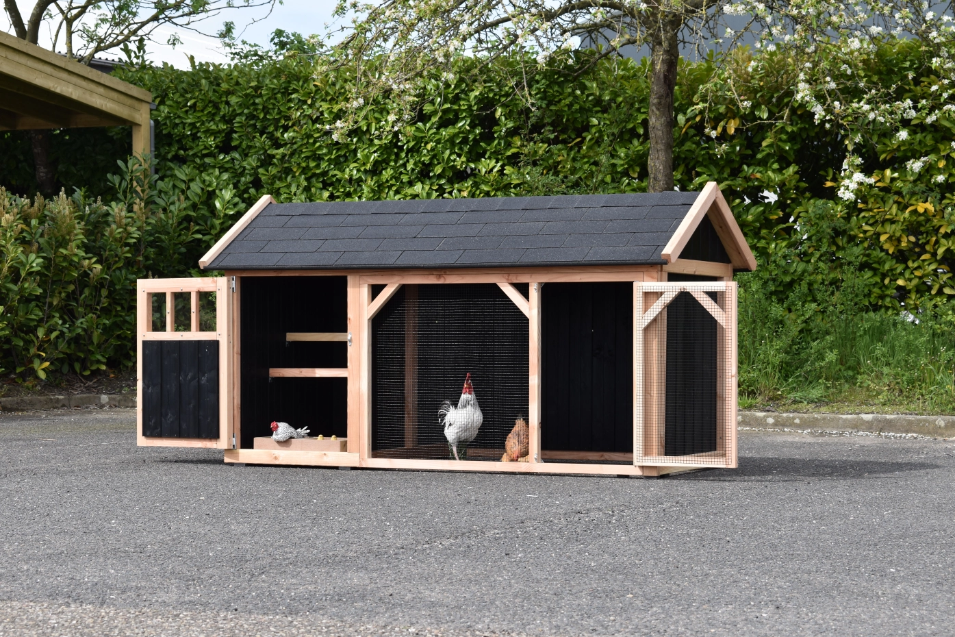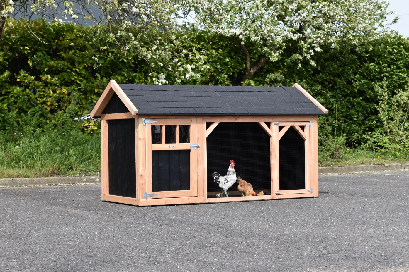 Chickencoop Belle 1 avec a pointed roof is a beautiful hutch with a covered run. The sleeping compartment is provided with a laying box, perches and a floor of Douglas wood. We make this chickencooop by ourselves in our shop. Because we use high-quality materials, this hutch is almost free from maintenance.