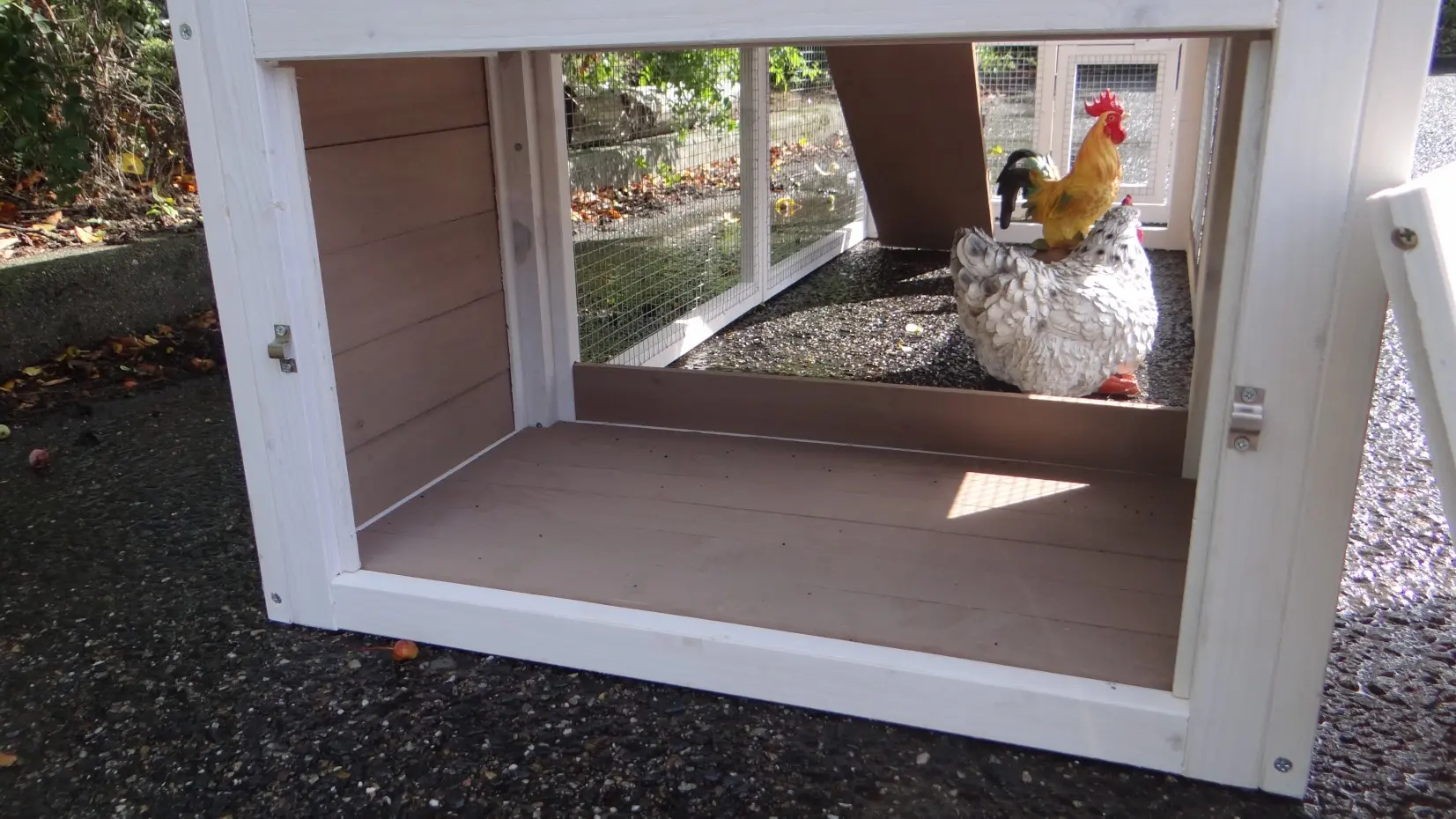 The beautiful chickencoop Leah with an additional chicken run is a nice, versatile coop for 2 to 4 chickens. This chicken coop has a lockable sleeping area with 2 perches of 56cm each. In the covered chicken run, there is a third perch. To the left of the sleeping area, there is a nesting box. Chicken coop Leah also comes with a convenient, pull-out cleaning tray and a covered run with a spacious door. The extra extension run Ambiance Small has a mesh roof. The run is slightly deeper than the coop. For small chickens, this gap should be closed.