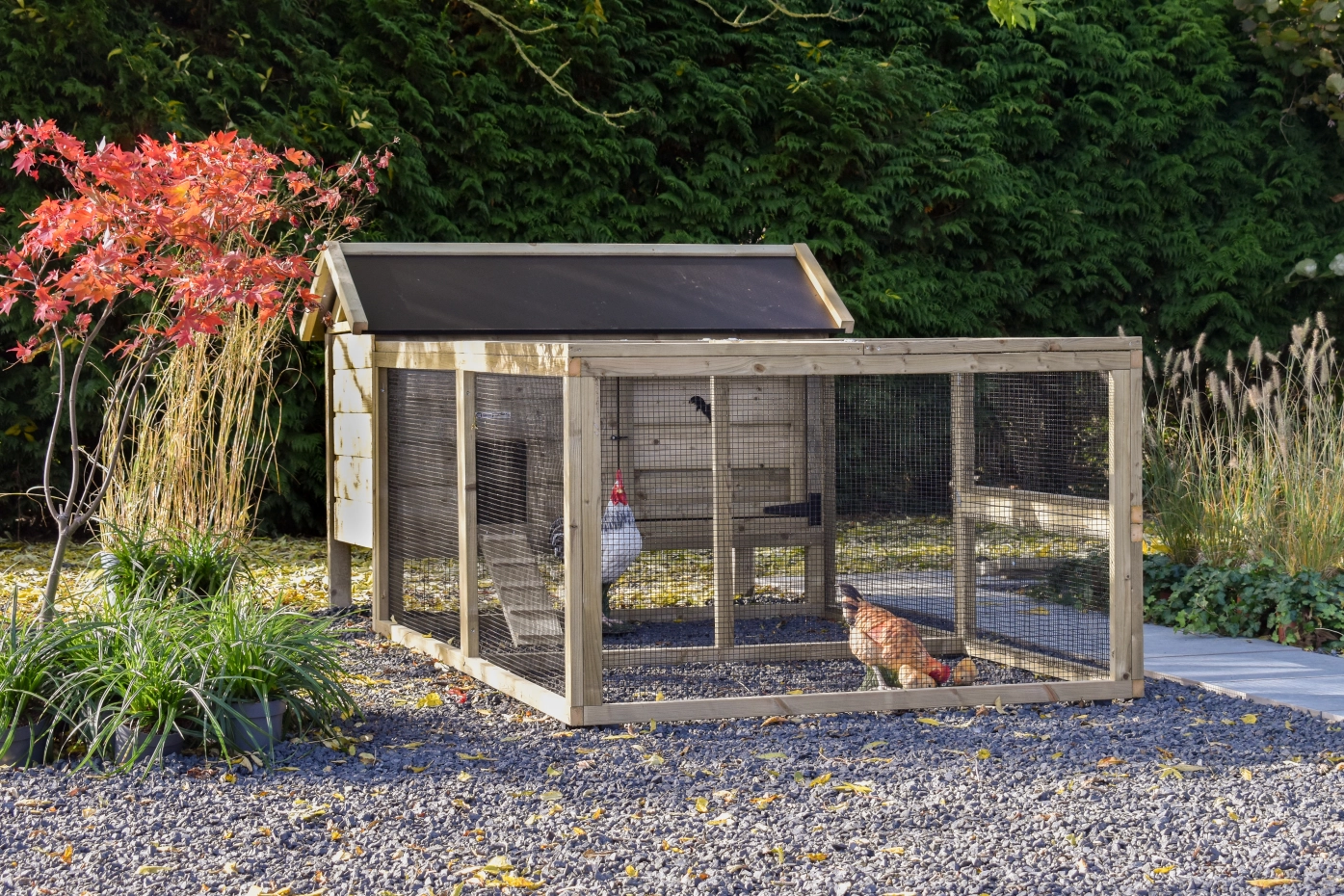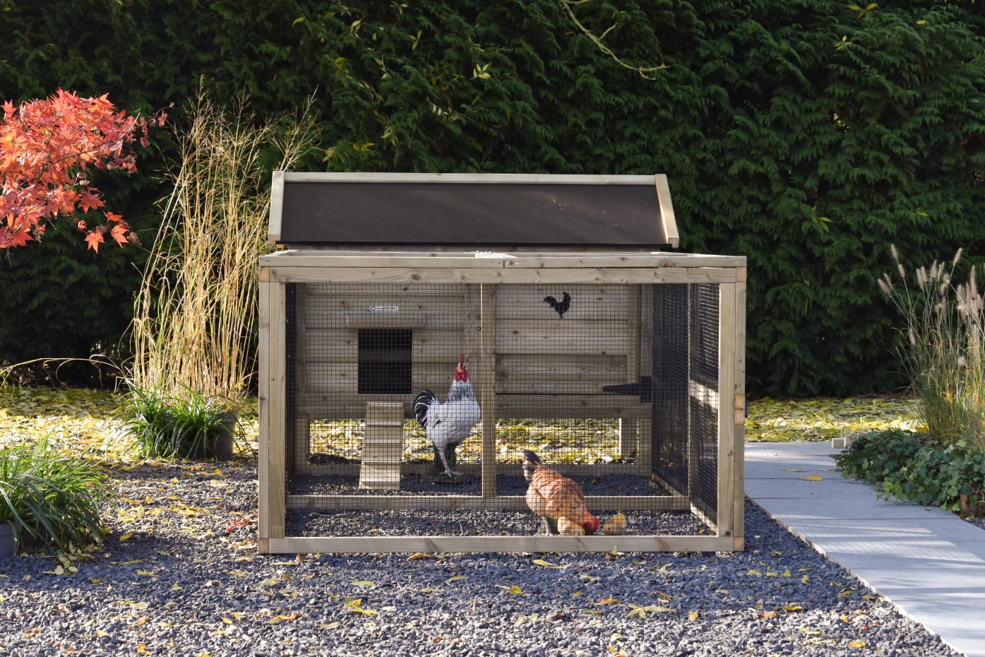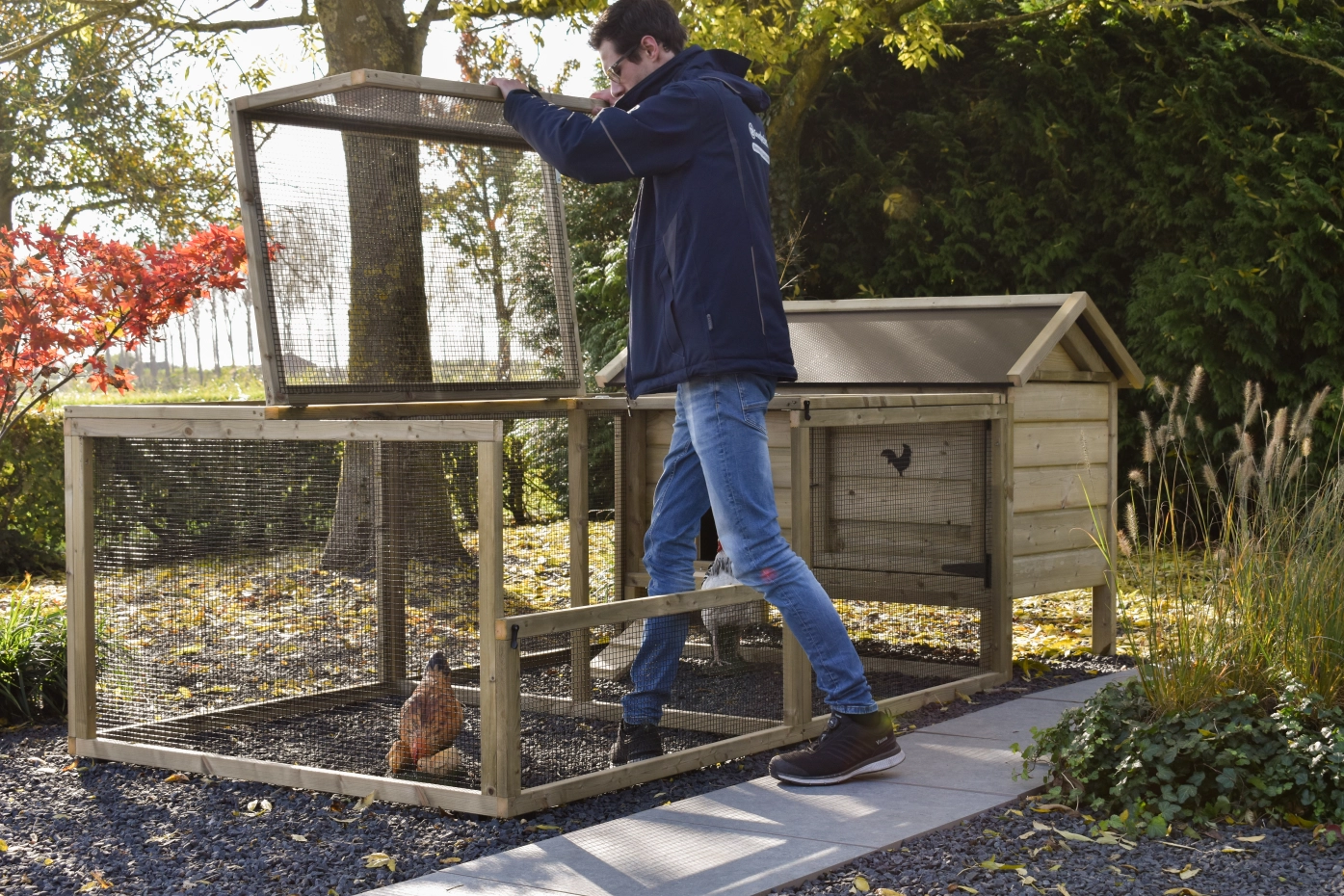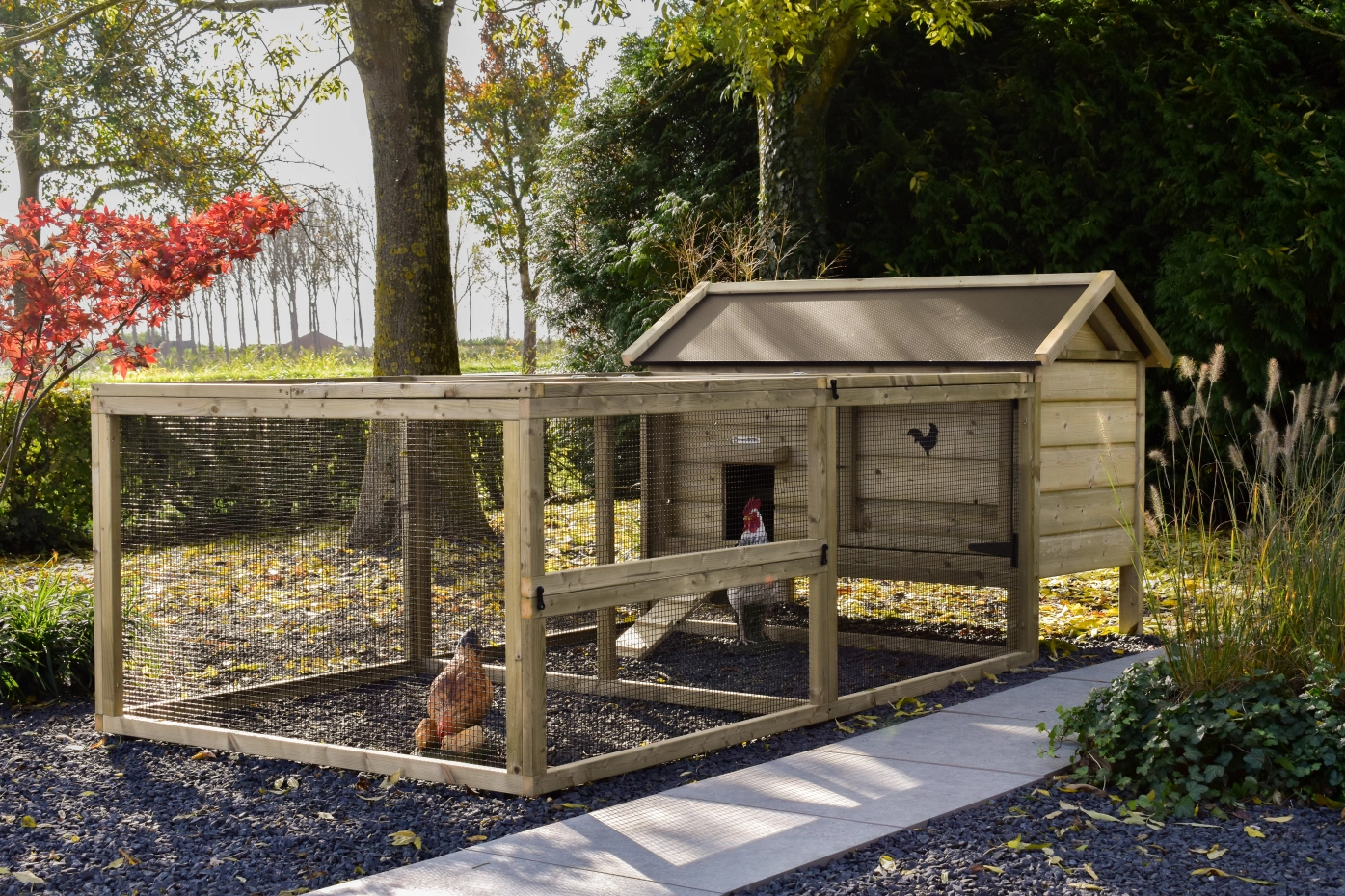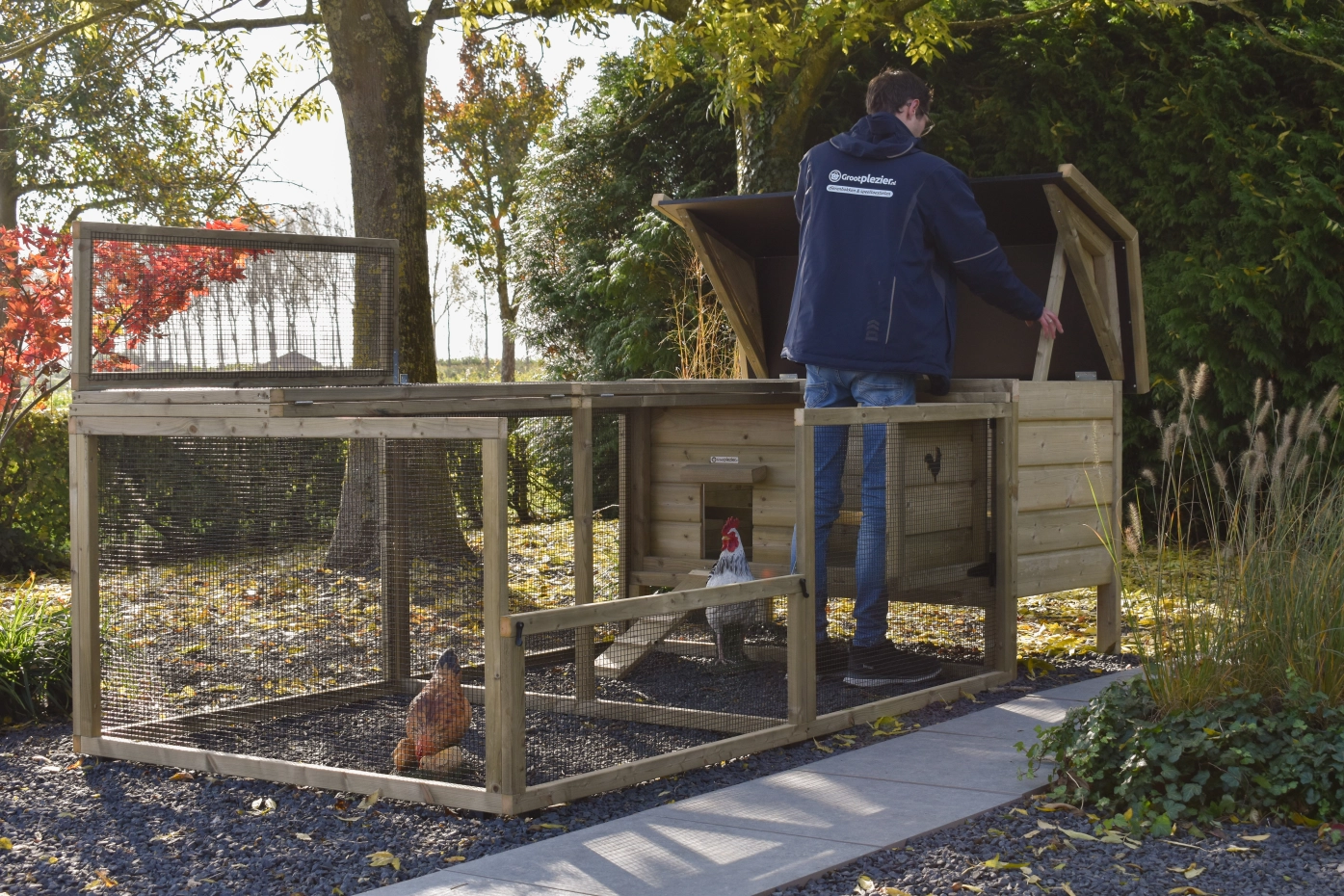 This low model, including a spacious run, offers your chickens plenty of room to scratch and stay active. The coop and run are easy to clean thanks to the hinged roof and the handy front door of the coop. For a lovely detail on the door, you can order a cute wooden animal. This gives the coop an extra charming look!