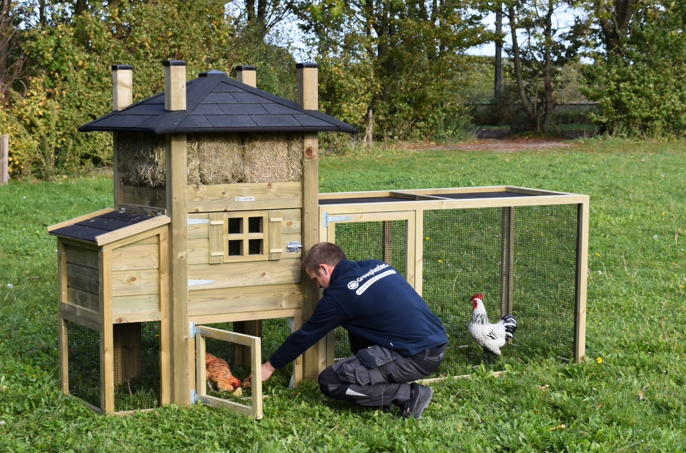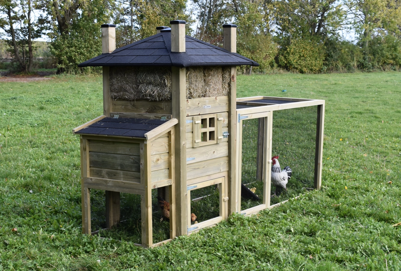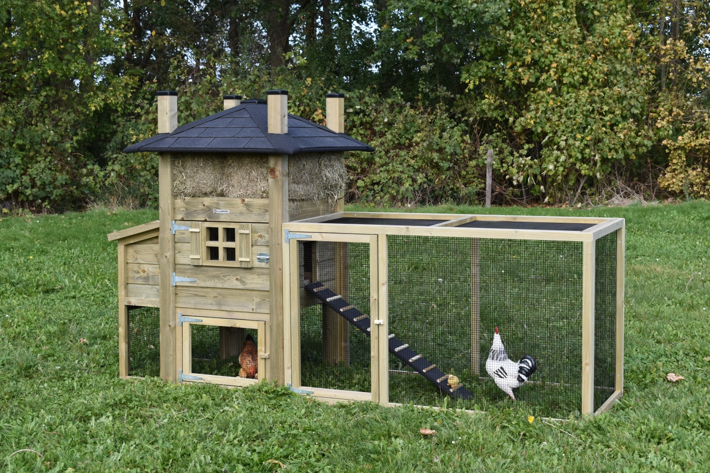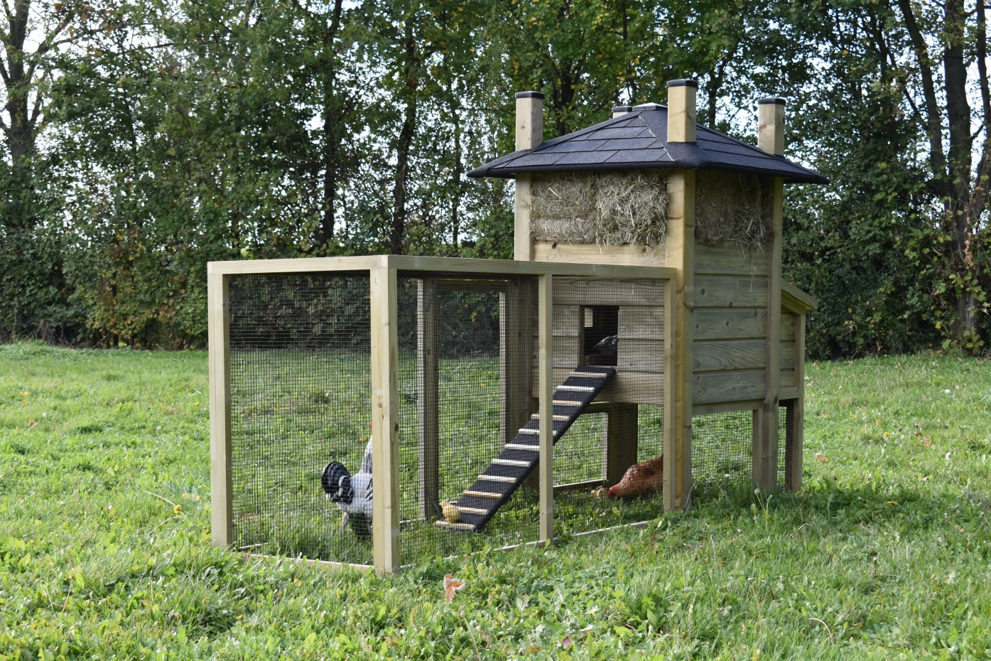 The chickencoop haystack Rosa is an acquisition for your yard. The hutch is extended with a run with mesh roof and a laying nest, to offer your chickens a lot of space. The sleeping compartment has a large door, so that it can be cleaned very easily.