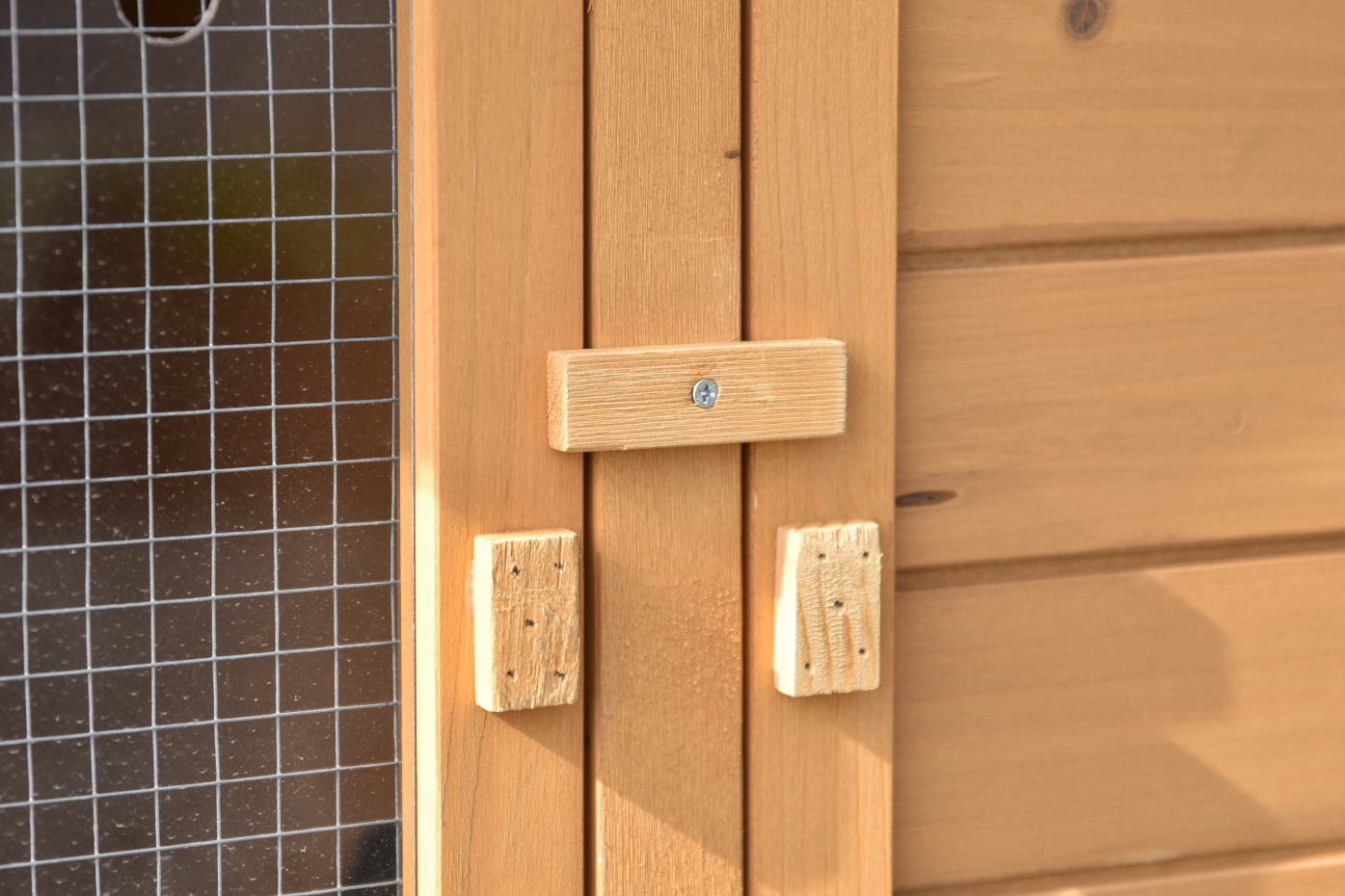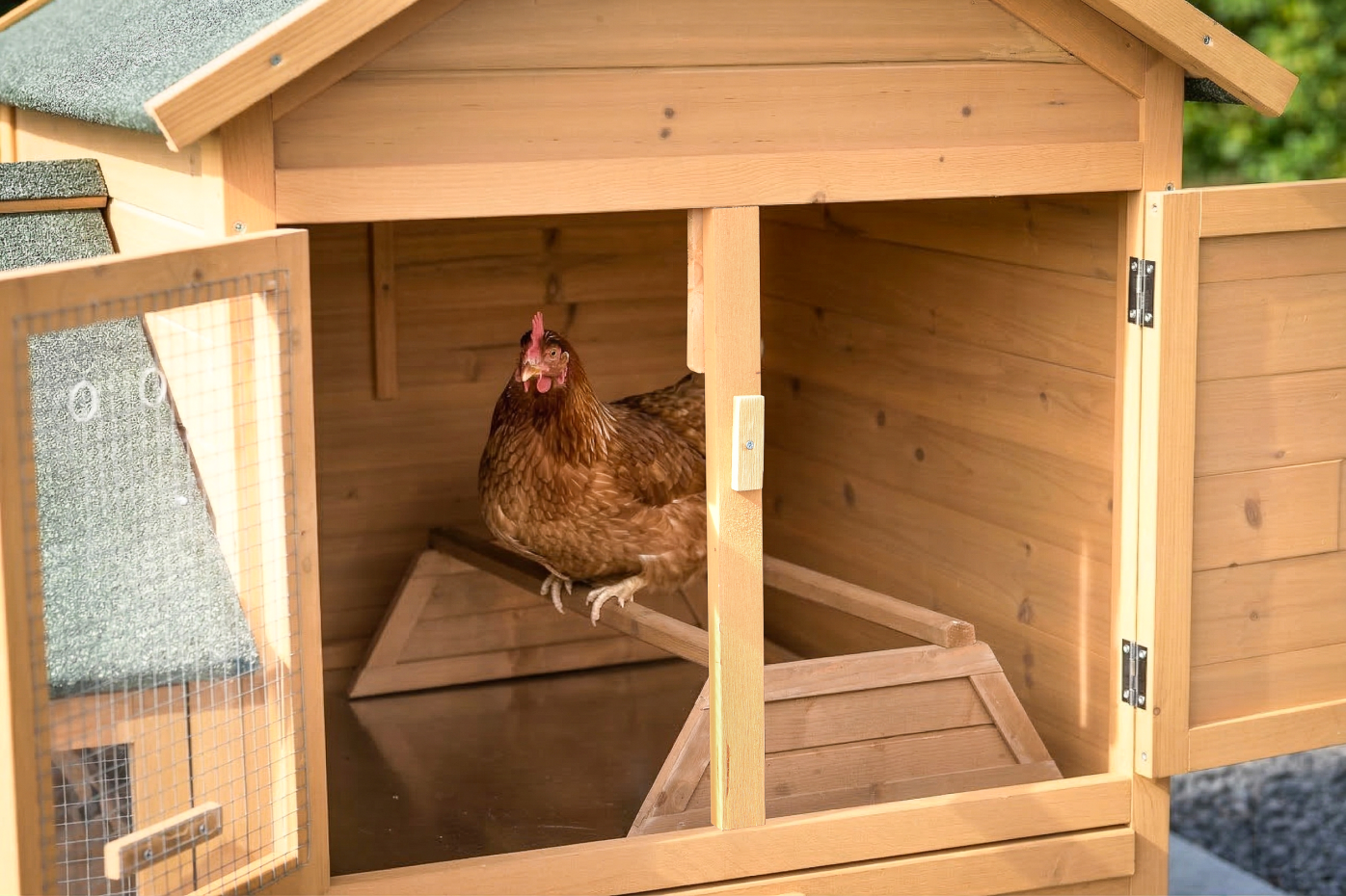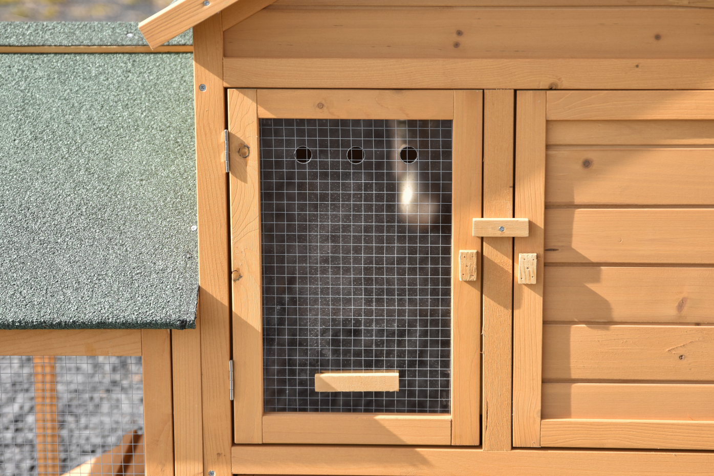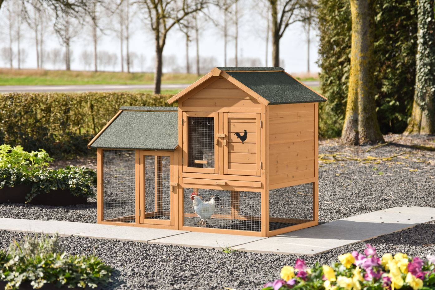 The roof is finished with roofing felt for extra protection against rain. The mesh door has a plexiglass panel that offers additional shelter. The wooden door with a black chicken as decoration also gives the coop a playful and recognizable detail