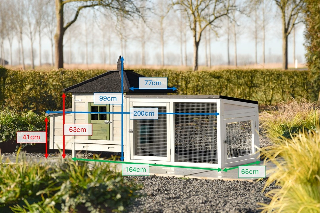 | Outer dimensions incl. roof and nest box (WxDxH) | 200x77x99cm |