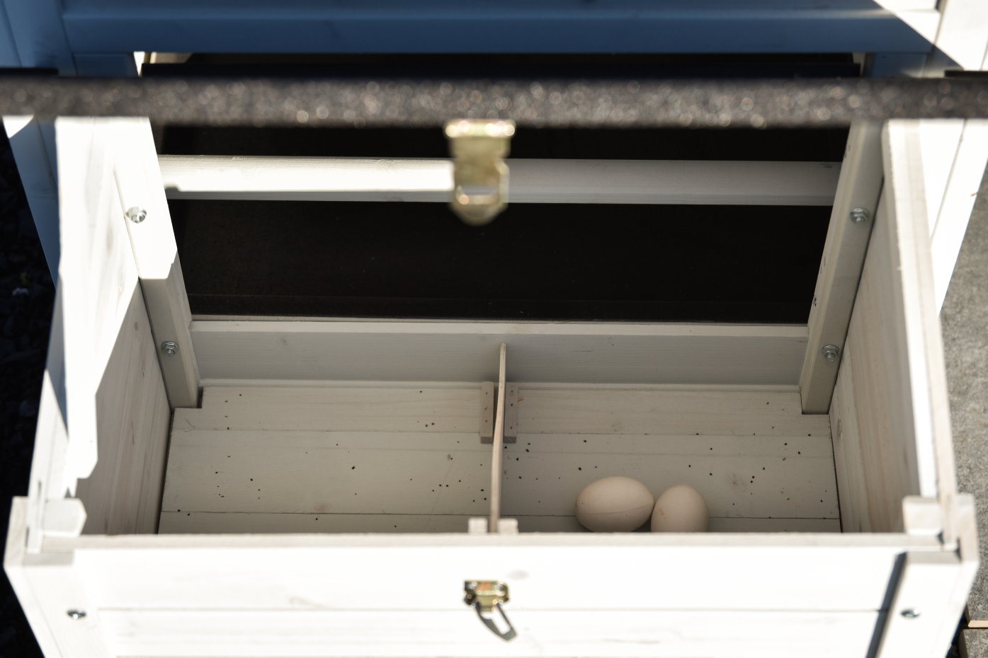 • This chicken coop is equipped with a nest box