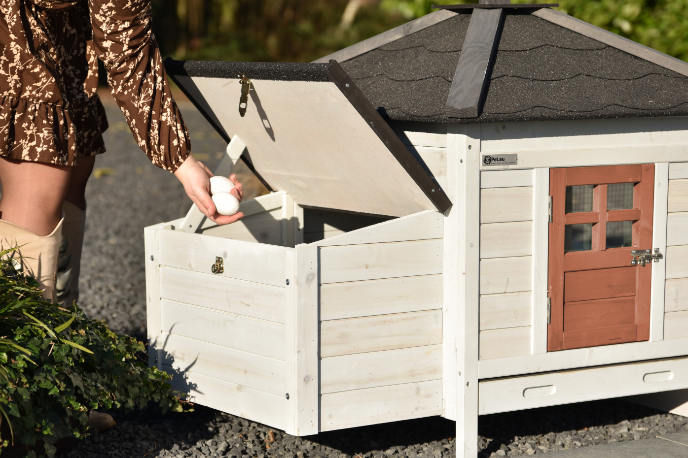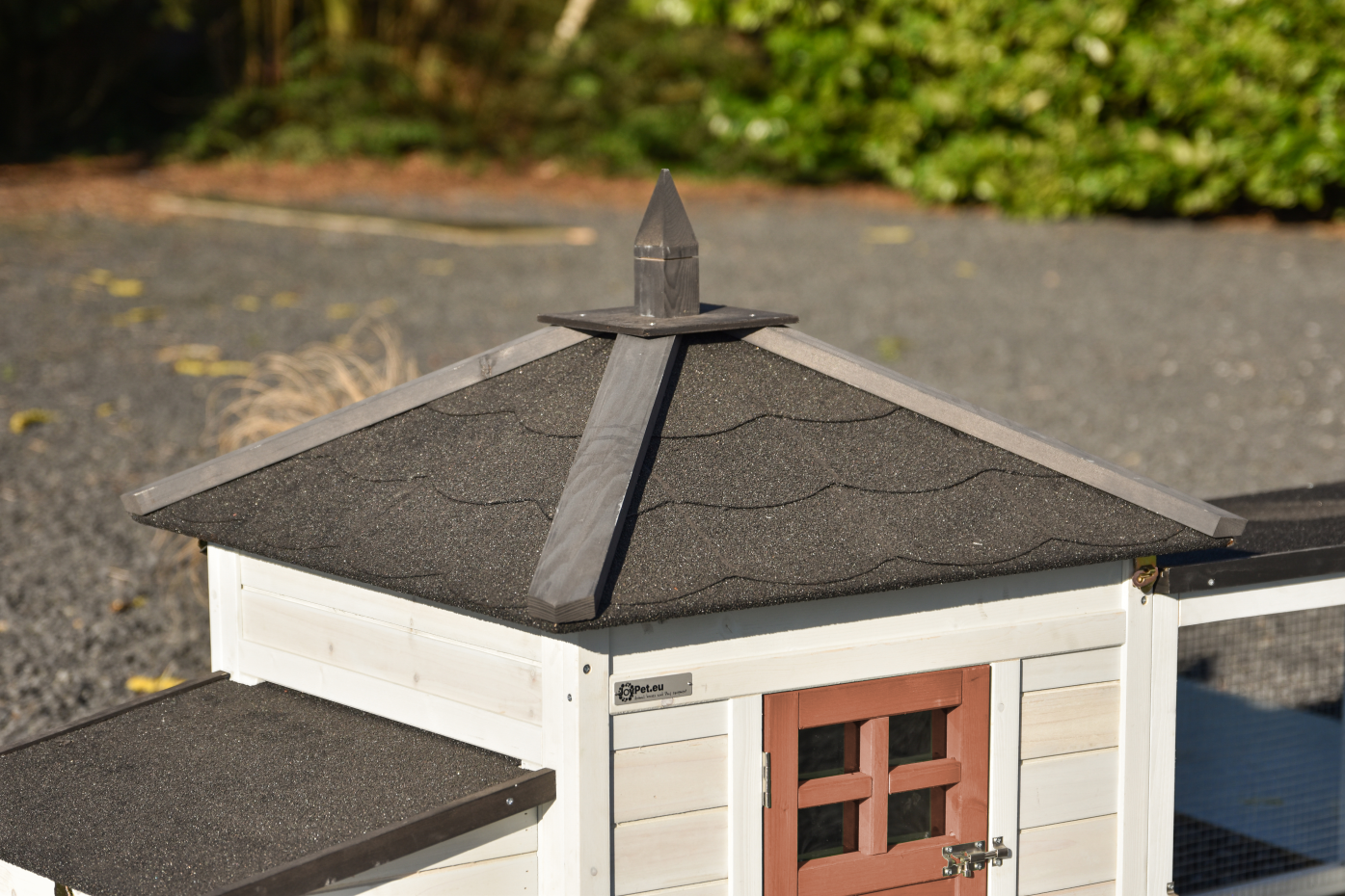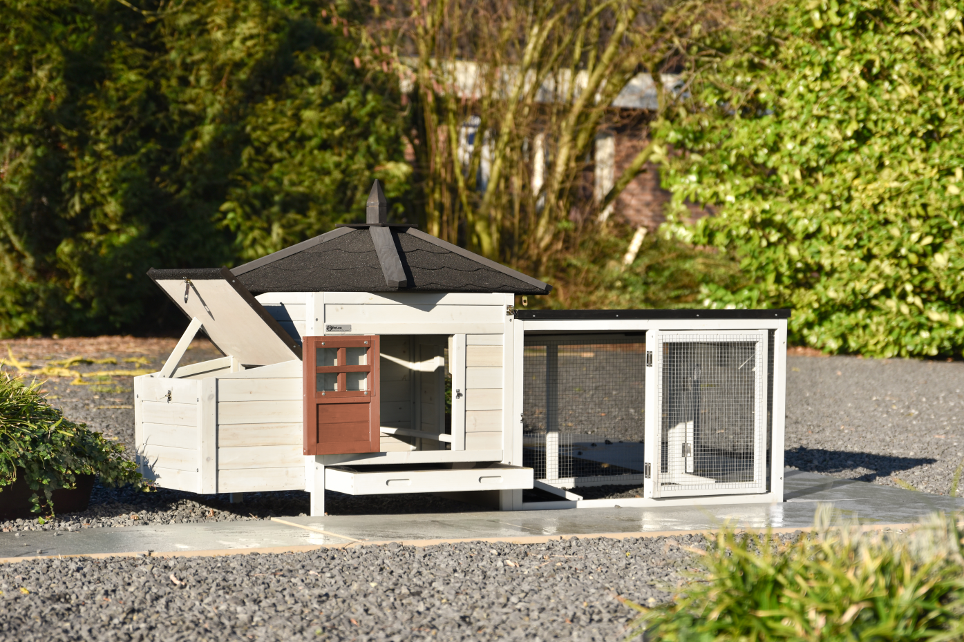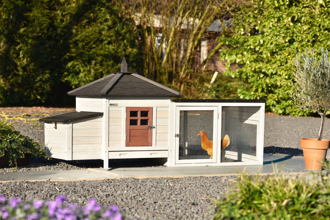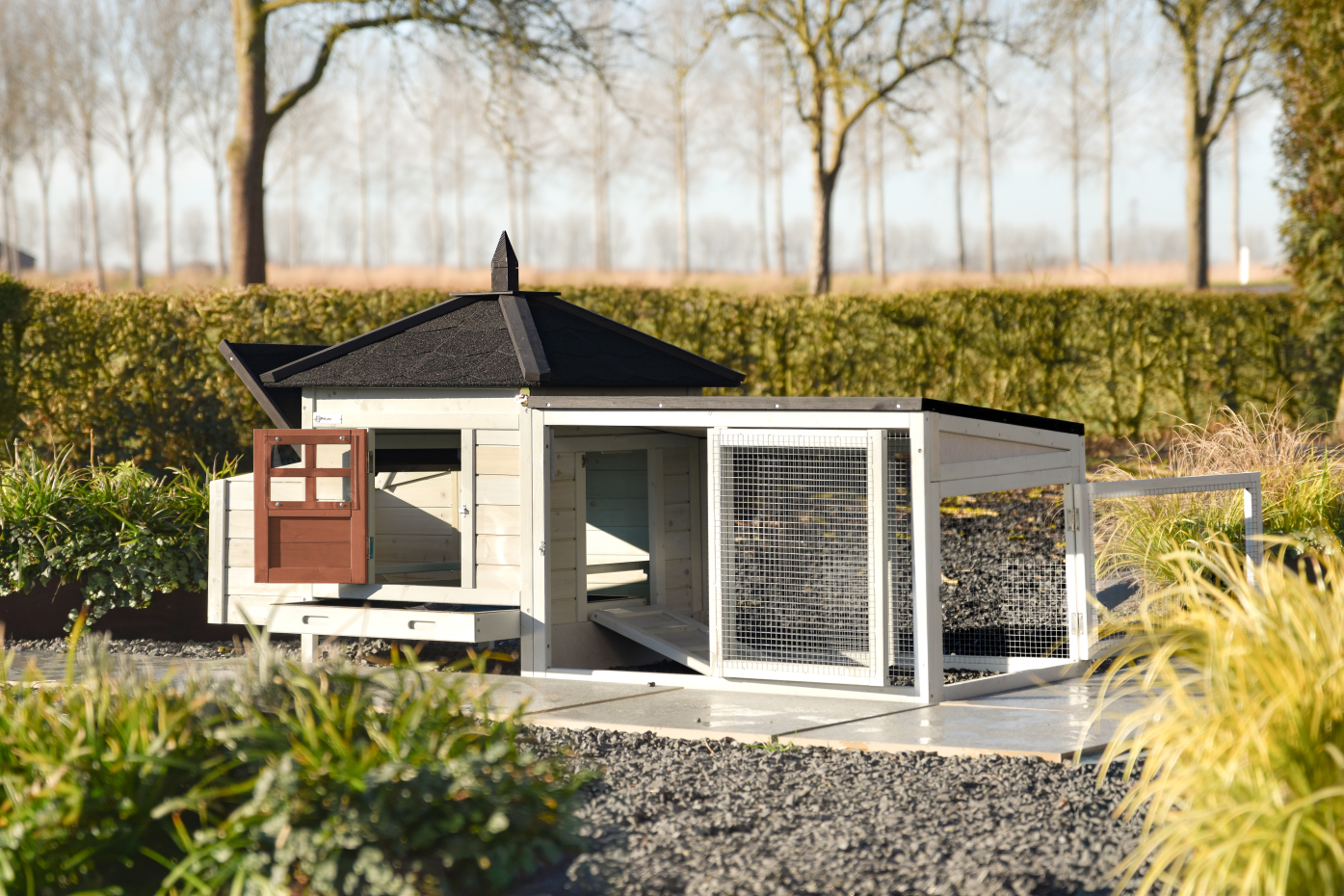 The Ambiance Small chicken coop with run extension in the latest colors is a stunning coop – finished to perfection in every detail! It features a convenient pull-out manure tray and a removable roof. A beautifully designed coop with stylish and practical details.