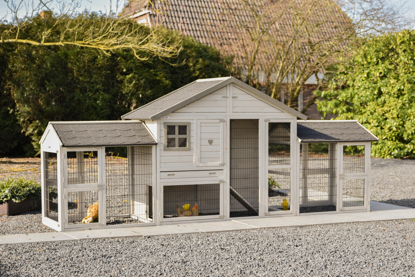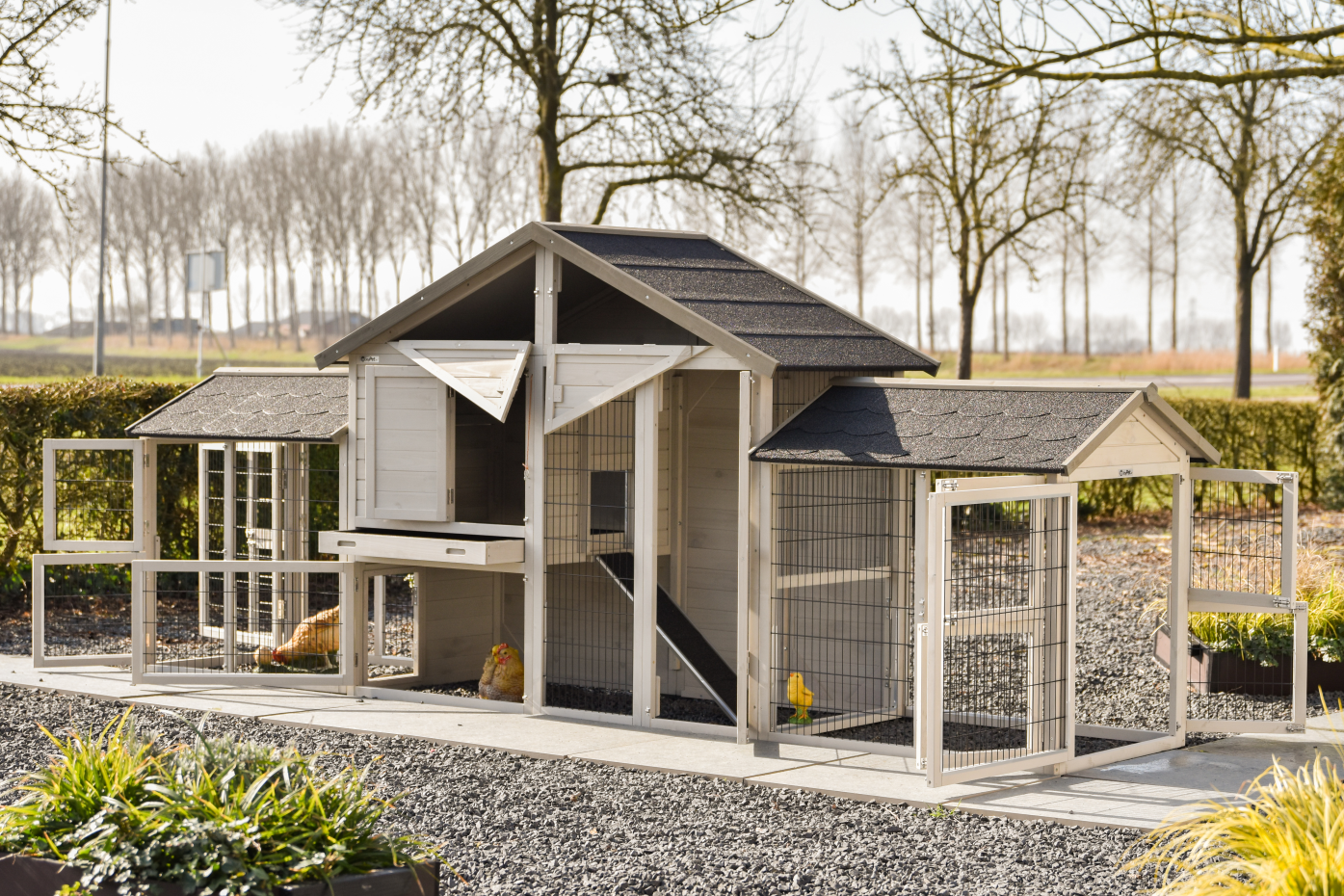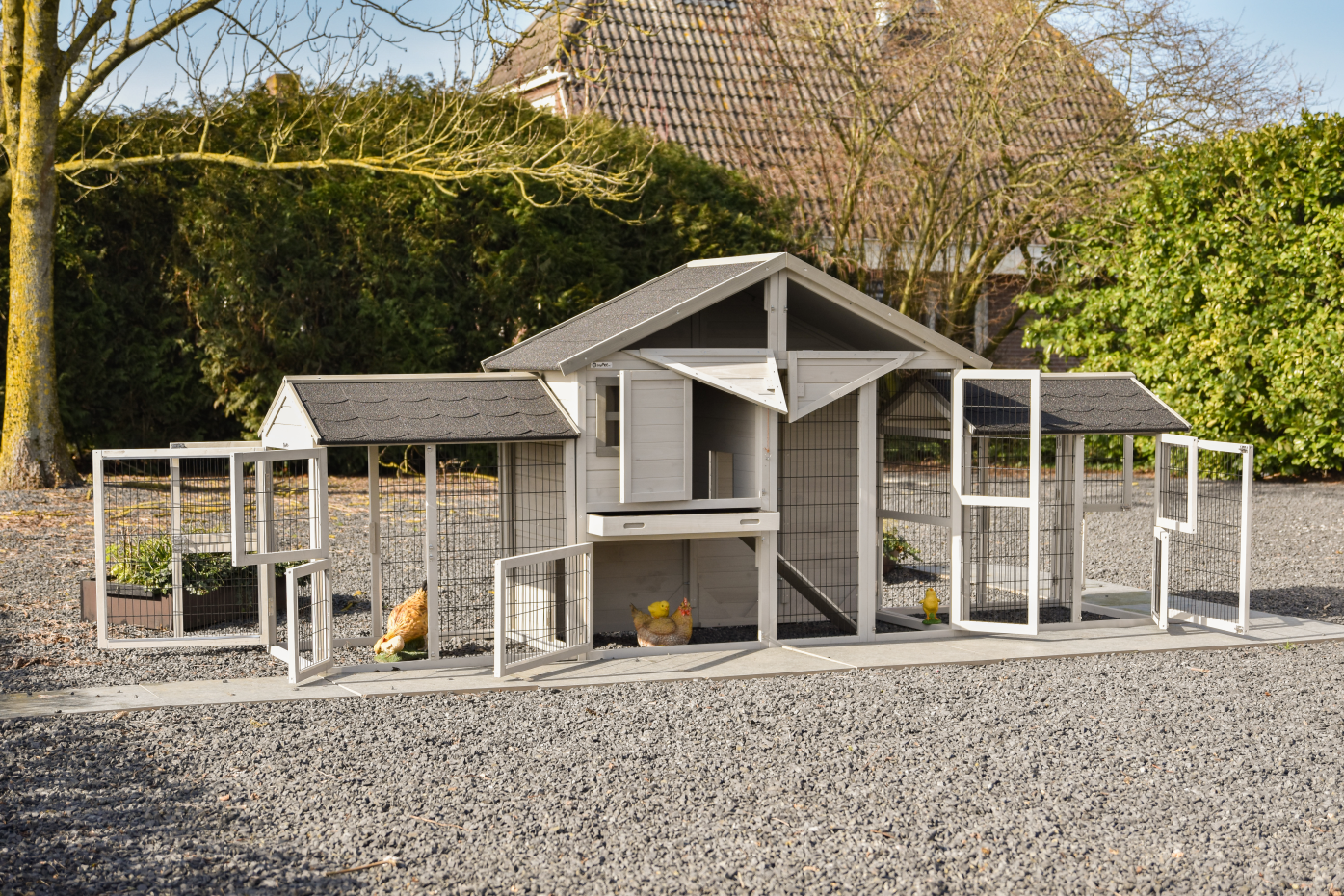 The chicken coop Holiday medium is a spacious and practical enclosure in the colour light-grey with multiple doors, making feeding, cleaning and daily care easy; this mid-sized model from the Holiday series offers chickens comfortable living space, features a convenient storage loft for feed or accessories, includes a double attached run for extra scratching and exercise space and has a plastic pull-out tray in the sleeping area for easy cleaning.