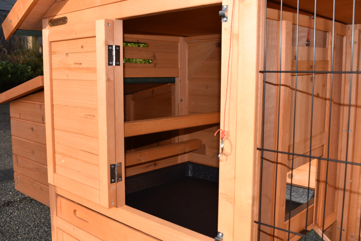 Chickencoop Holiday Small is a very practical chickencoop with sleeping compartment and run. This chickencoop is provided with a laying nest on the left side. This hutch has many large doors and a tray, so that you can clean the hutch very easily. This chickencoop has rubber feet and is suitable for 2 à 4 chickens. You can extend the chickencoop with the run Space Small.