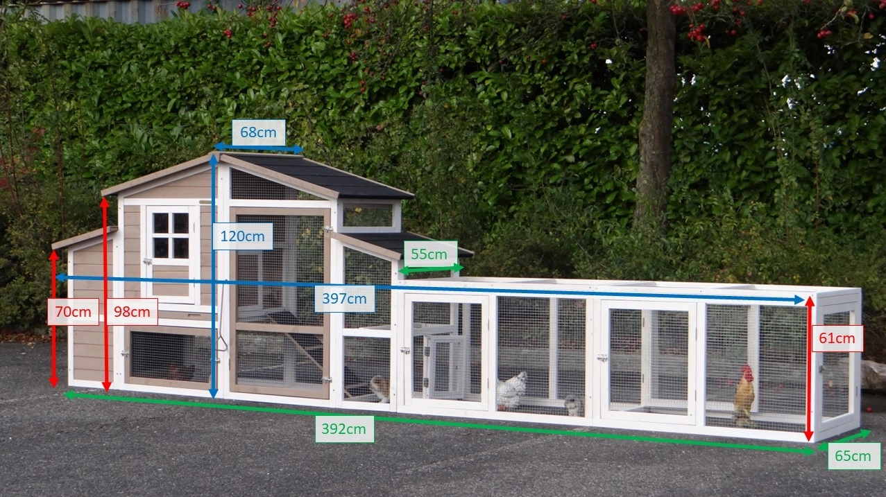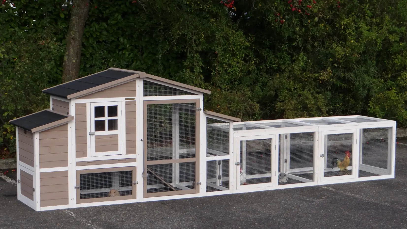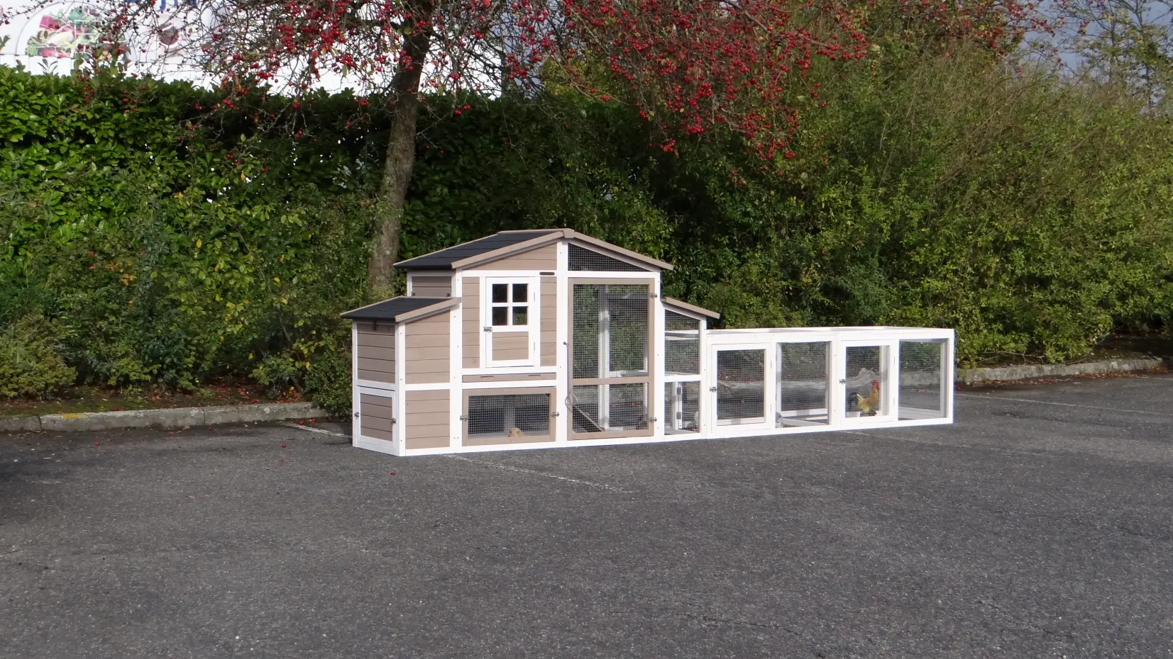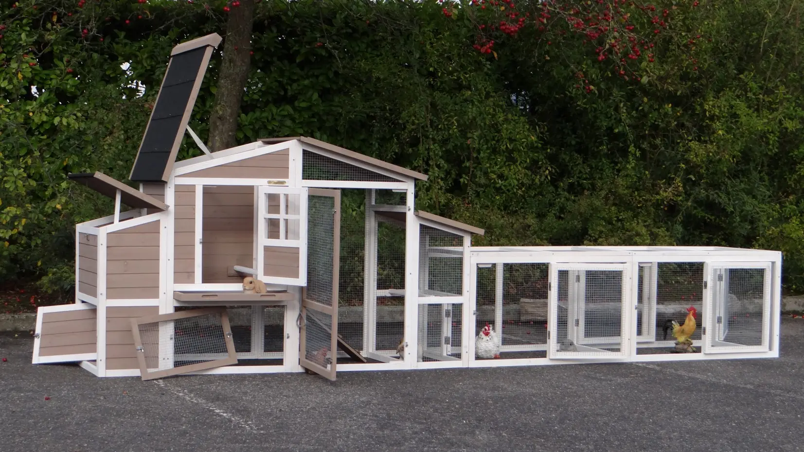 Both the coop and the runs include several doors and openings for easy access. This combination includes the Leah chicken coop and two Ambiance Small extension runs.