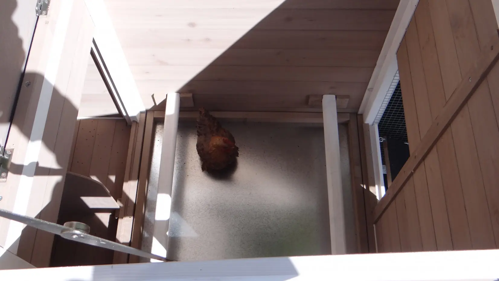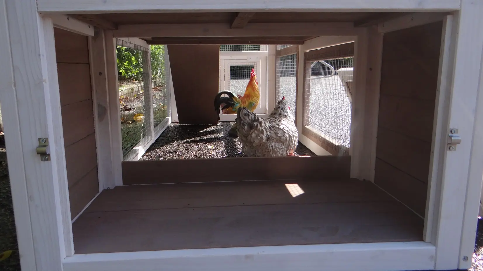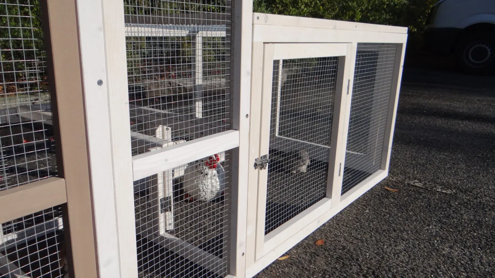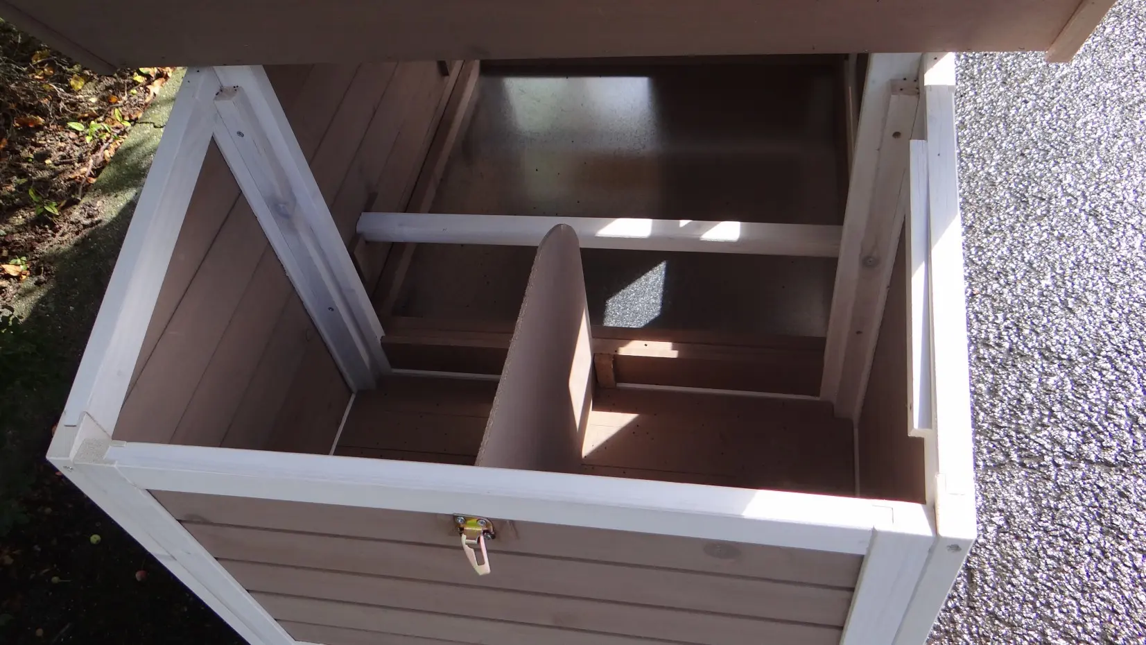 The extension runs are slightly deeper than the main coop, creating a small gap. At the front, there’s a convenient handle that allows you to close the sleeping area from the outside. On the left side, there’s a nesting box, making it easy to collect the eggs.