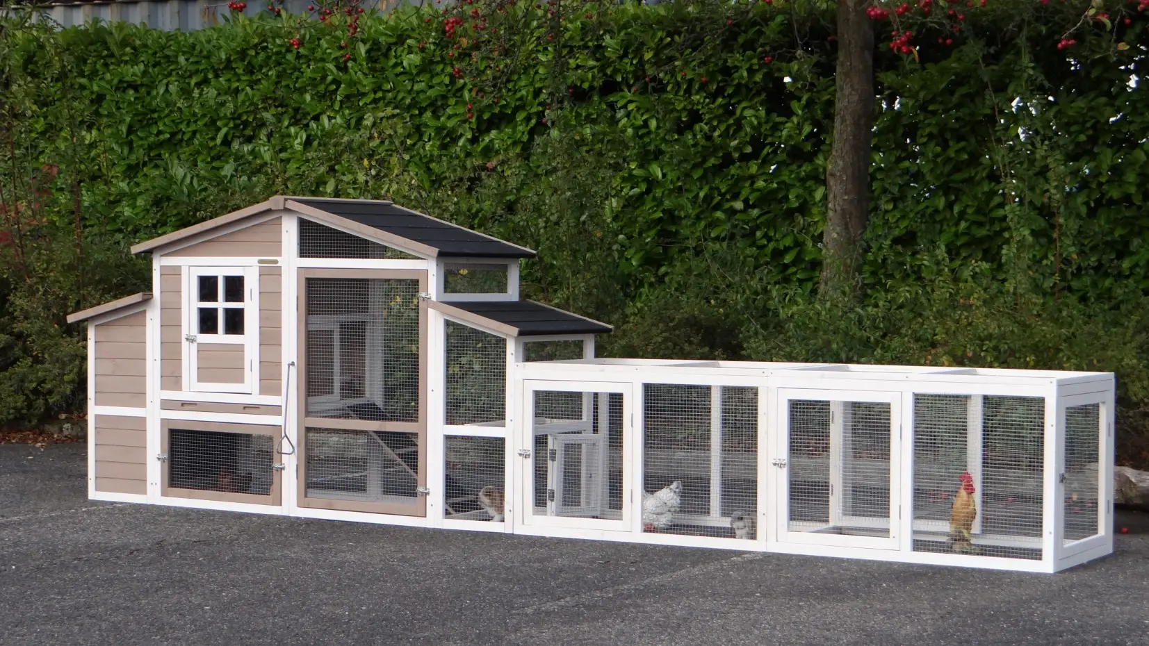 The Leah chicken coop is suitable for 2 to 4 chickens. It’s a practical coop in a stylish white and taupe color combination. The sleeping area features two 56 cm perches, and there’s an additional perch in the covered section of the run.