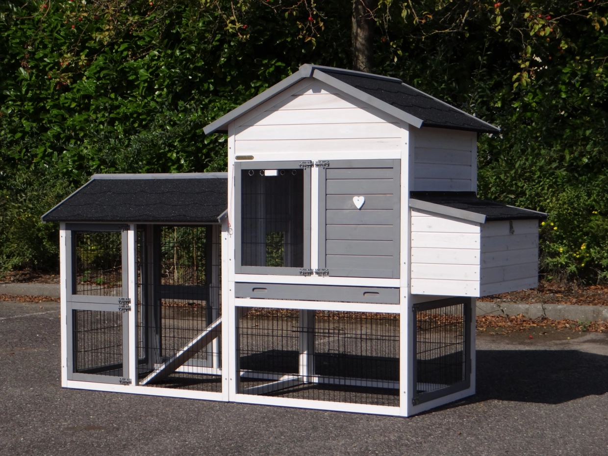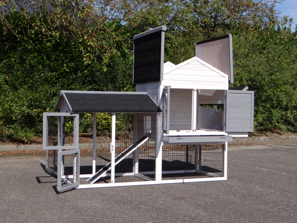 Chicken coop Prestige Medium with run at the left and nest box. Hen house Prestige Medium is a great coop for your chickens. This chicken coop offers detailed workmanship with various spacious doors, a large sleeping compartment with perches and a large run. For optimal protection, this chicken coop is on plastic feet. This makes the hen house Prestige Medium very practical and user-friendly. With small adjustments, you can also easily build this chicken coop with the run at the other side.