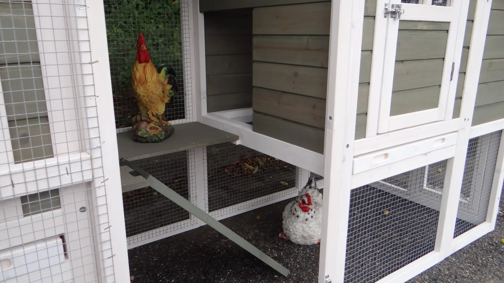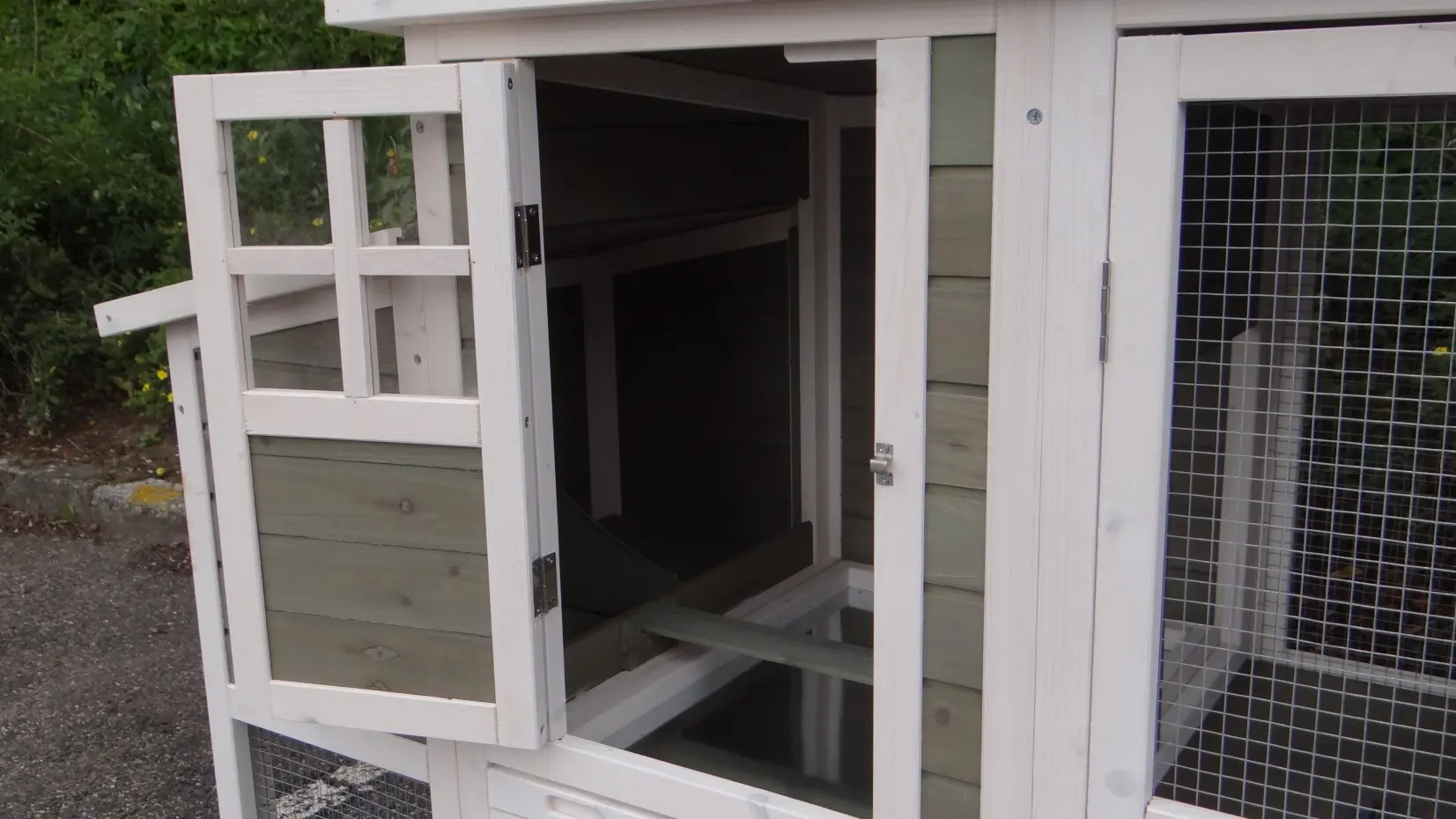 The coop features two nesting boxes, making it easy to collect the eggs.