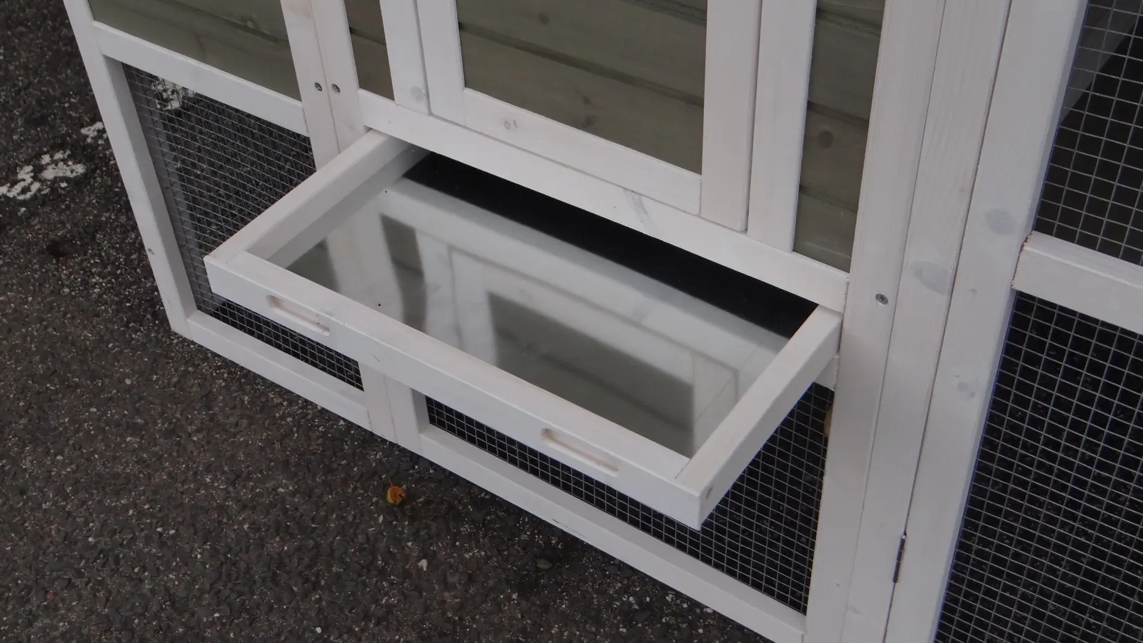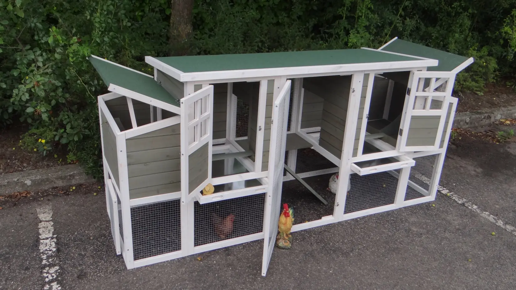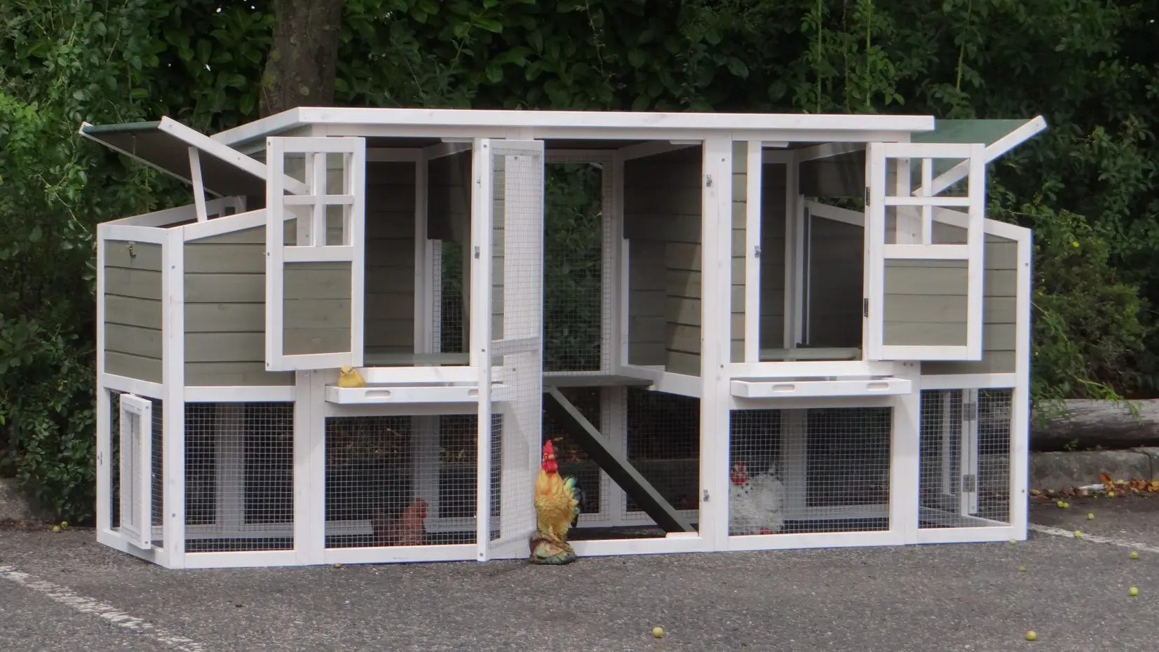 The coop is equipped with pull-out trays, making cleaning quick and effortless.
