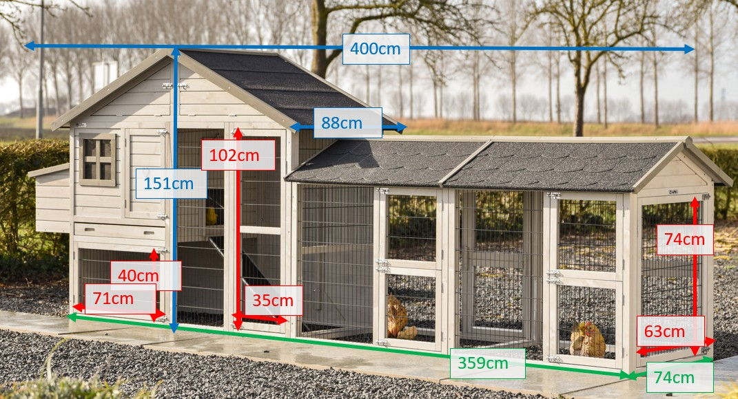 The chicken coop Holiday medium light-grey with nesting box and double attached run is a spacious and well-organized enclosure with multiple access doors, making daily care and cleaning easy; this mid-sized model from the Holiday series offers chickens a comfortable sleeping area with perches, a practical storage loft for feed or supplies and a spacious nesting box where they can lay their eggs in peace.