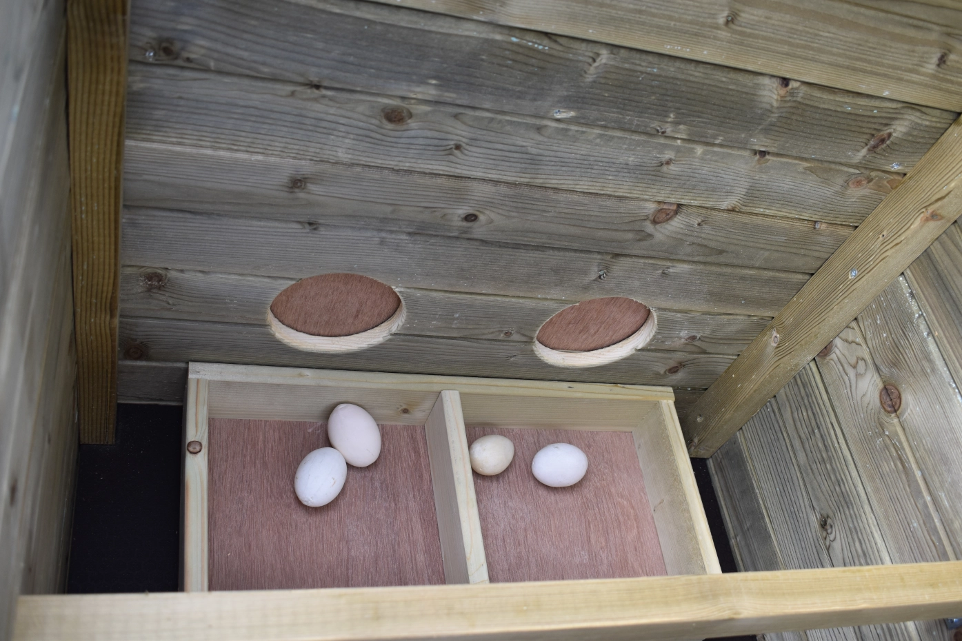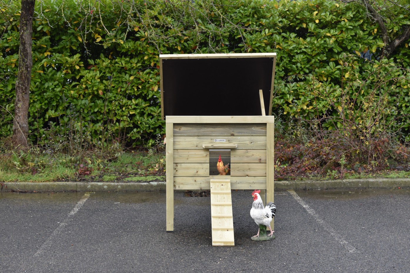 Because the coop stands on high legs, the chickens can shelter underneath, or you can place the feeder there.