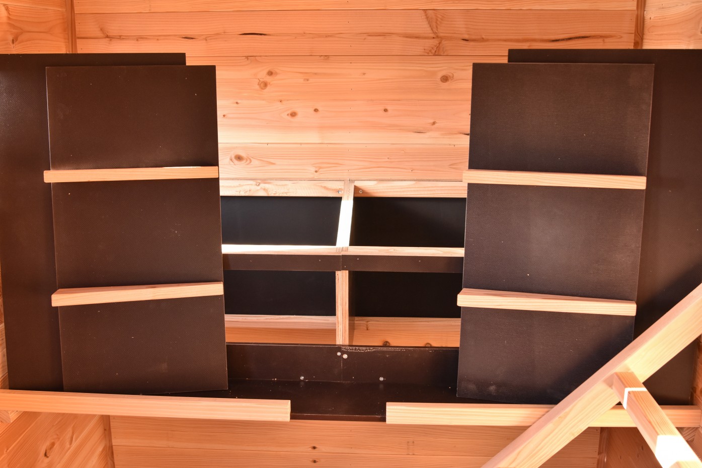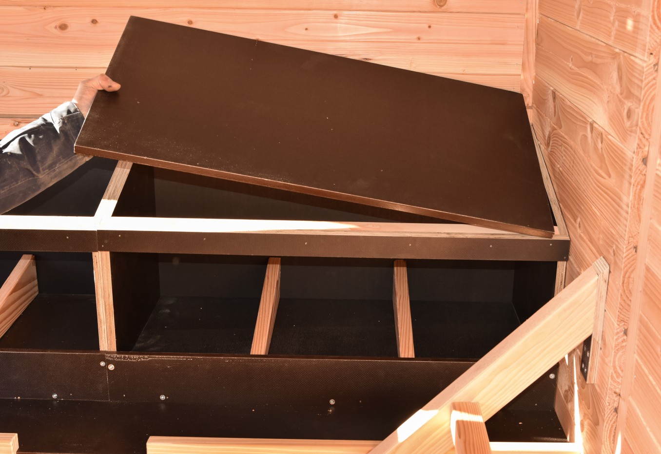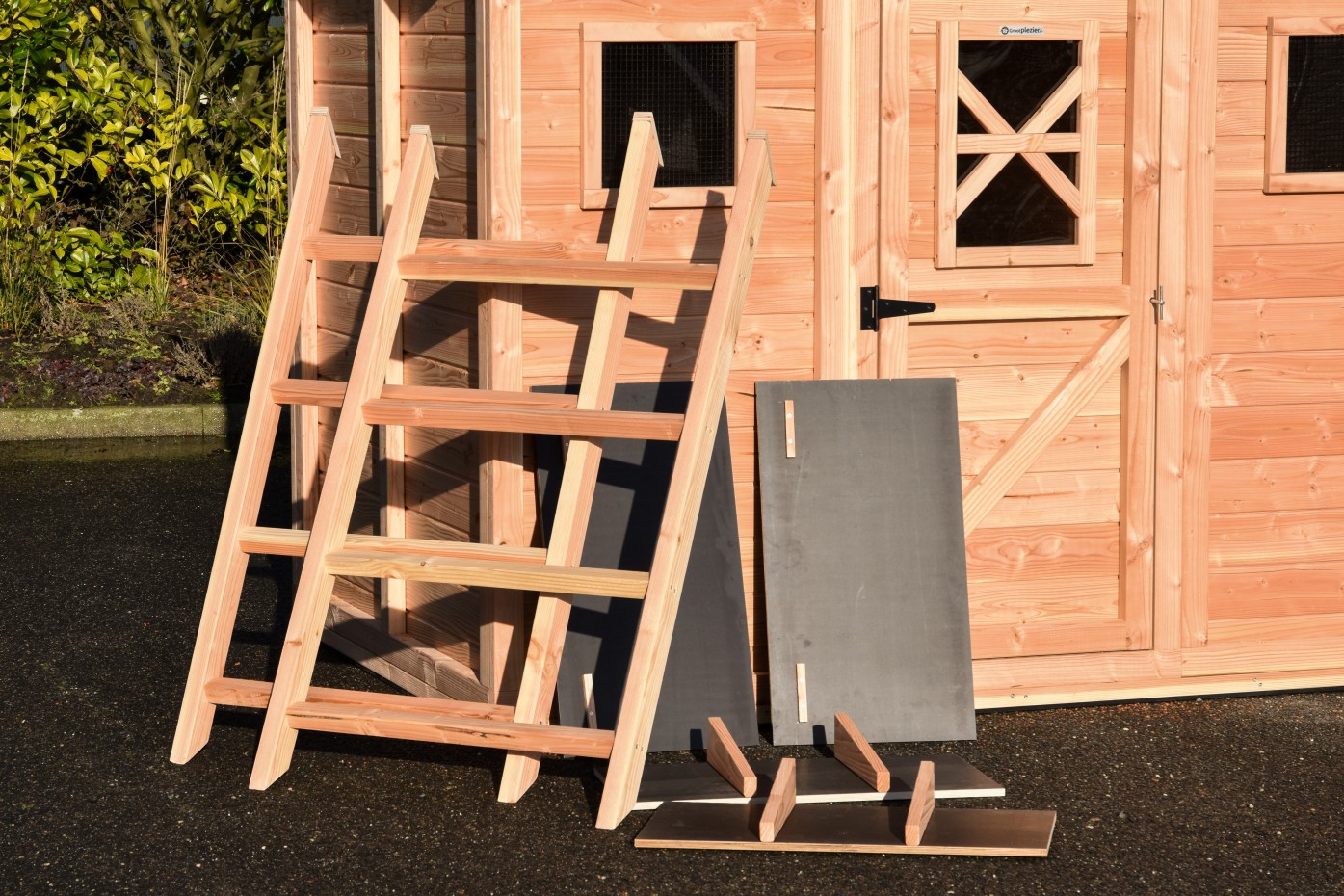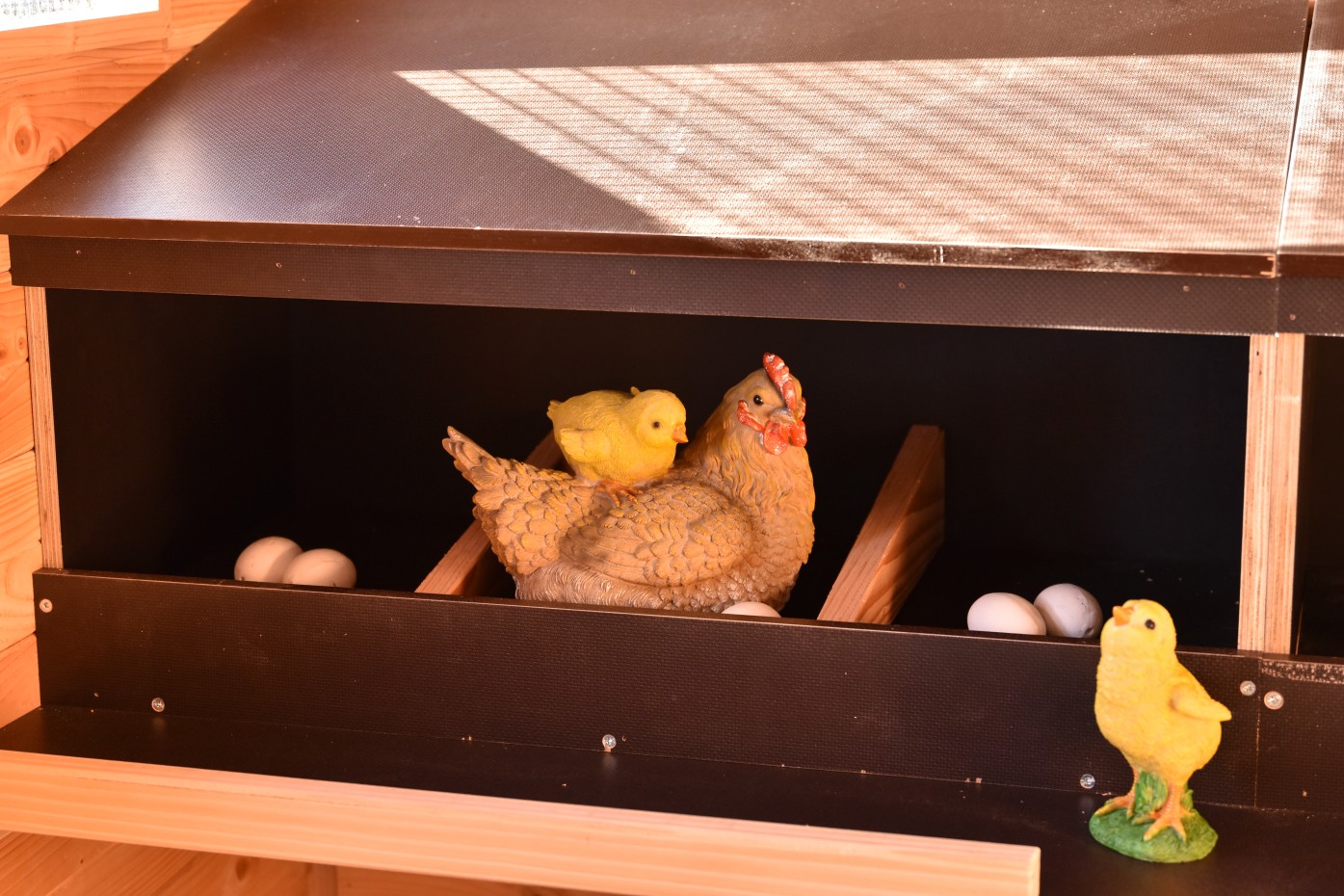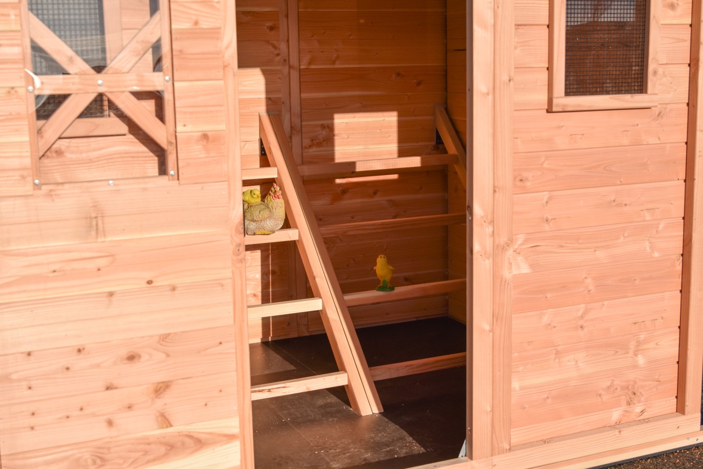 Inside, there are two large nesting boxes that together accommodate up to six chickens at the same time. The roof and floor panels are removable, making cleaning quick and easy. In addition, there are two large roosting ladders that are mounted on the wall and can also be removed effortlessly.