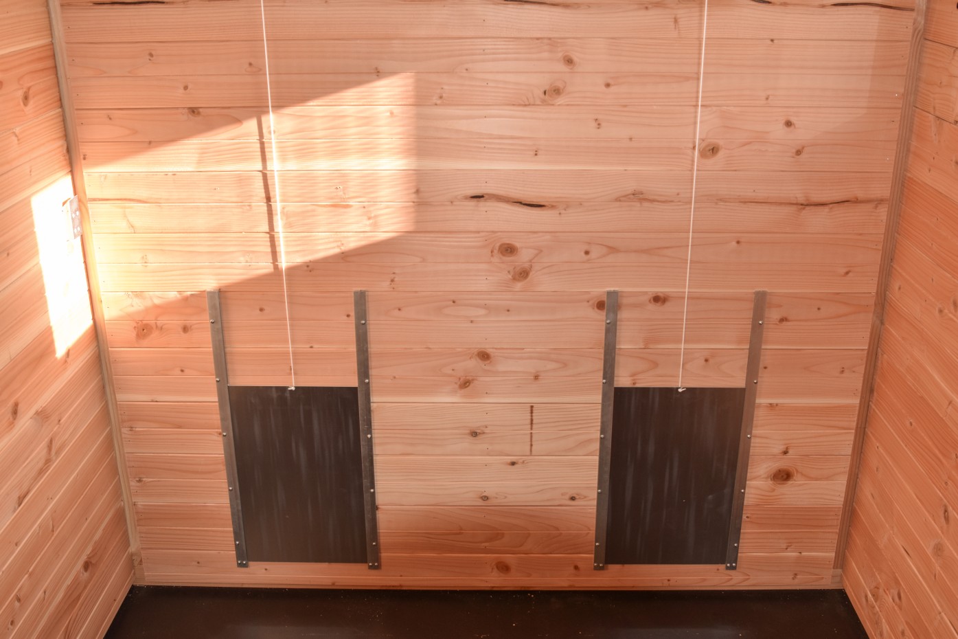 The night shelter can house 24 large chickens, 33 medium-sized chickens, or 48 small chickens. At the front, there is one large door with sturdy black hinges and a practical lock that can be opened using the supplied T-key. The windows provide a clear view inside the coop, while the two outer windows with removable plexiglass allow for extra ventilation.