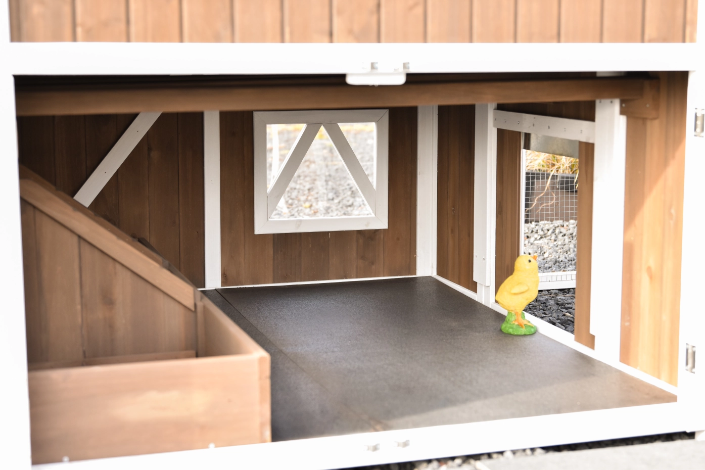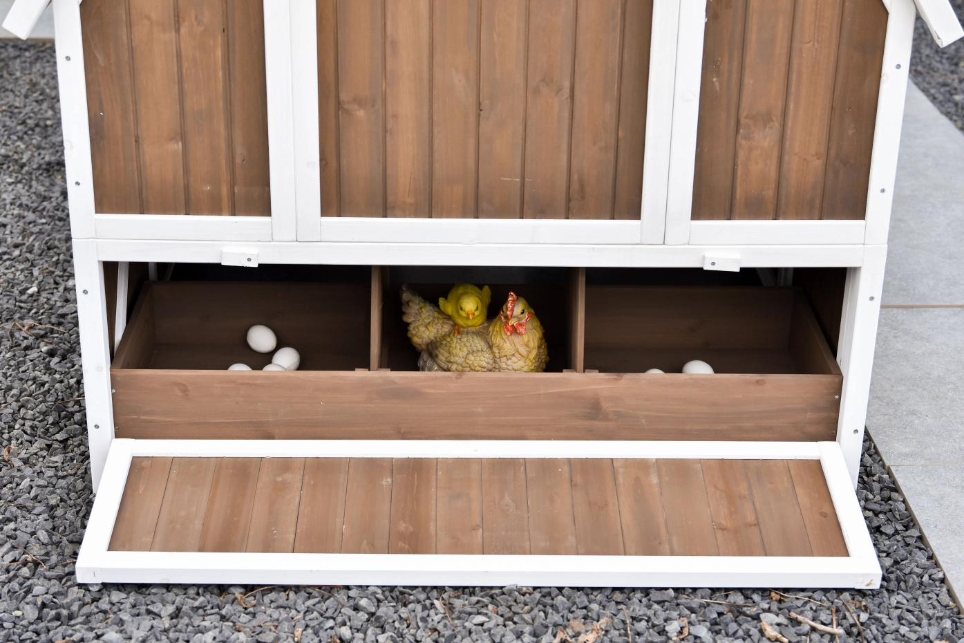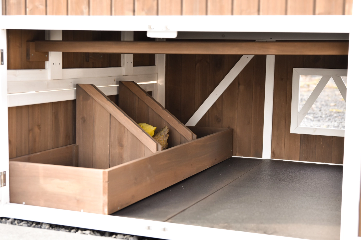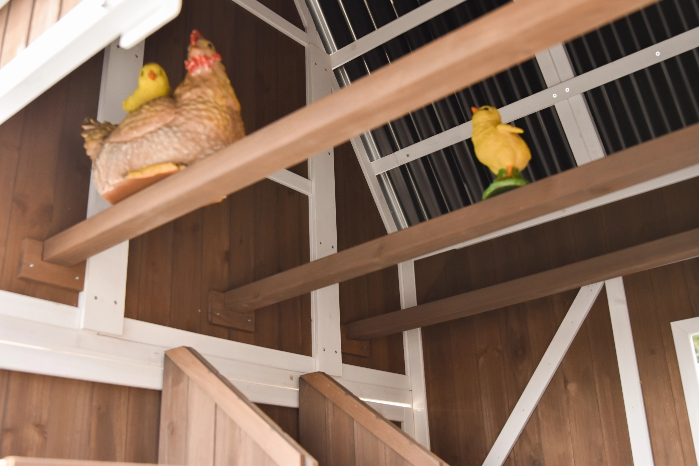 Inside the coop there are three perches that you can screw in at your preferred height, allowing you to adjust the layout to suit your chickens. The spacious nesting box is divided into three compartments and offers plenty of room for undisturbed egg laying. Through the convenient hatch at the back, you can collect the eggs quickly and easily.