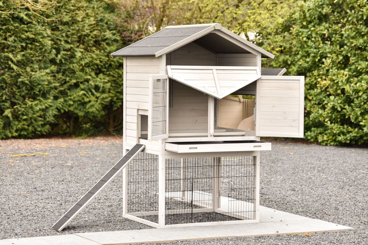 The generous night shelter and convenient nesting box provide comfort and ease of use, while the large doors make maintenance simple