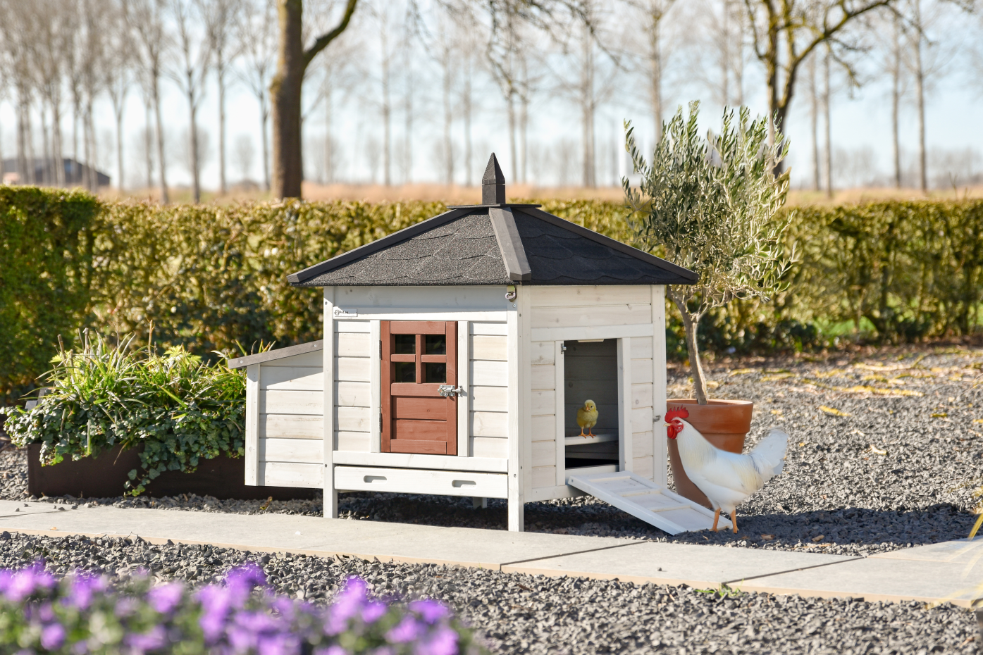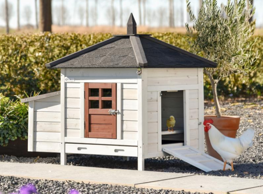 Chicken coop Ambiance Small is a real eye-catcher in the garden and combines an attractive look with practical use. The coop has a plastic pull-out tray, a fully removable roof for easy cleaning and a side door that also serves as a ramp. The coop looks great in a large chicken run but can also be expanded with extension runs made especially for this model. Chicken coop Ambiance Small is suitable for up to 4–8 chickens and has external dimensions of 107x77x99 cm (LxWxH)