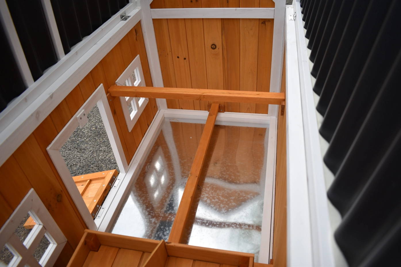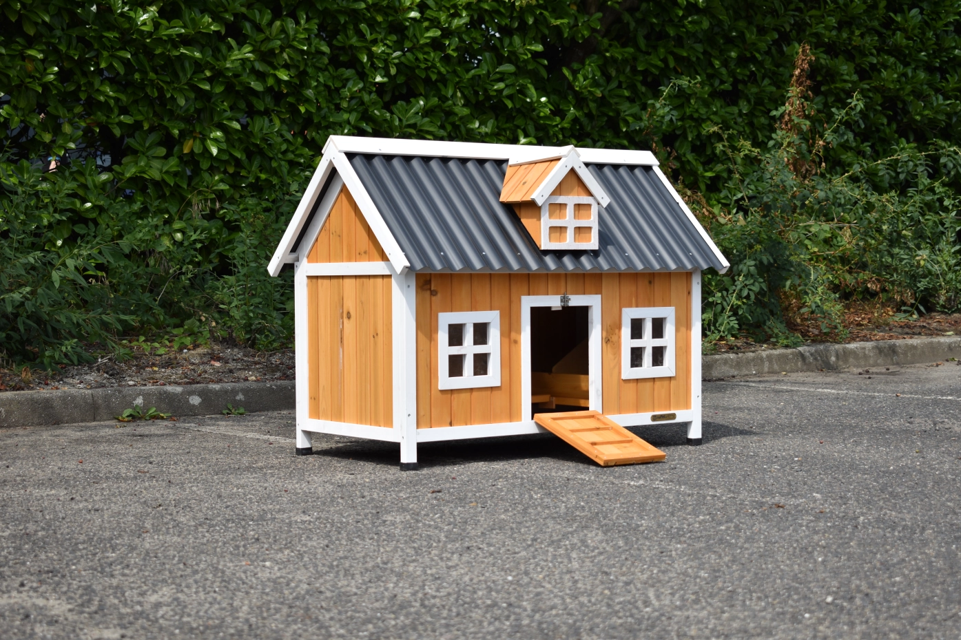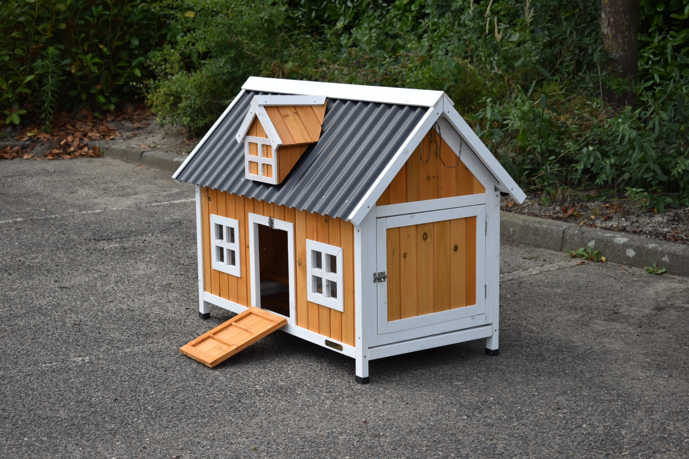The beautiful chickencoop Cozy is suitable for 4 till 8 chickens. The hutch has beautiful colours, so that it is an acquisition for your yard. We will advise you to stain the hutch once again. The hutch is provided with a foldable ramp, 4 perches and a laying box. The hutch has a practical tray and a door in the side panel, so that the hutch can be cleaned very easily.
