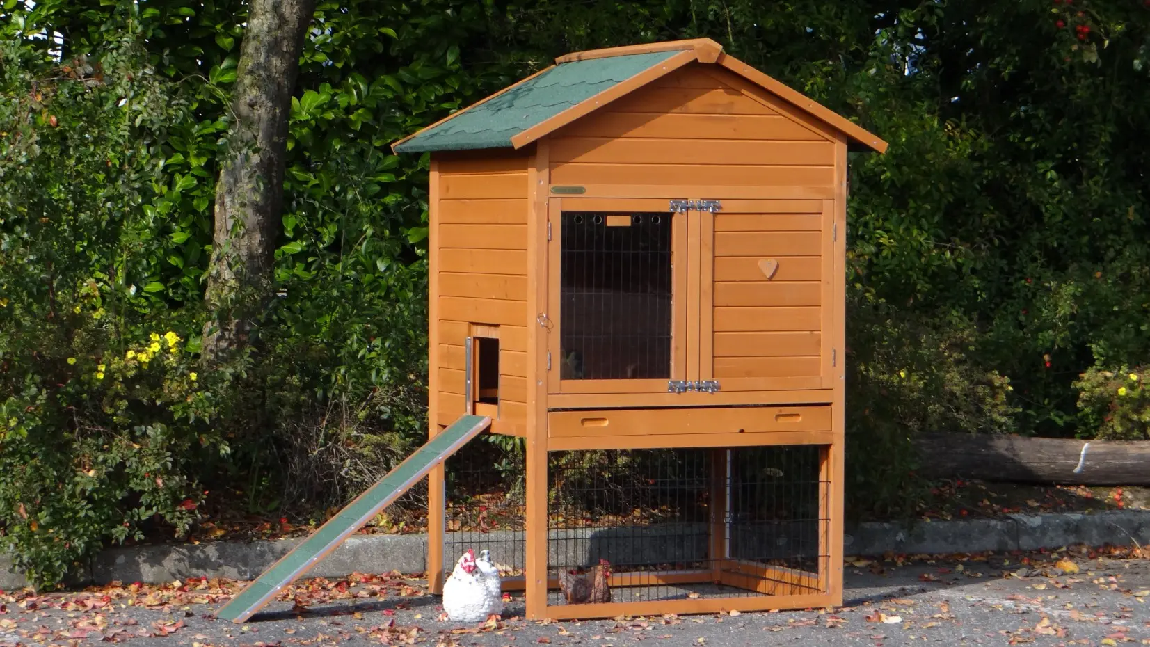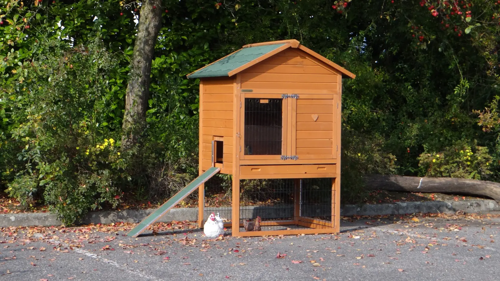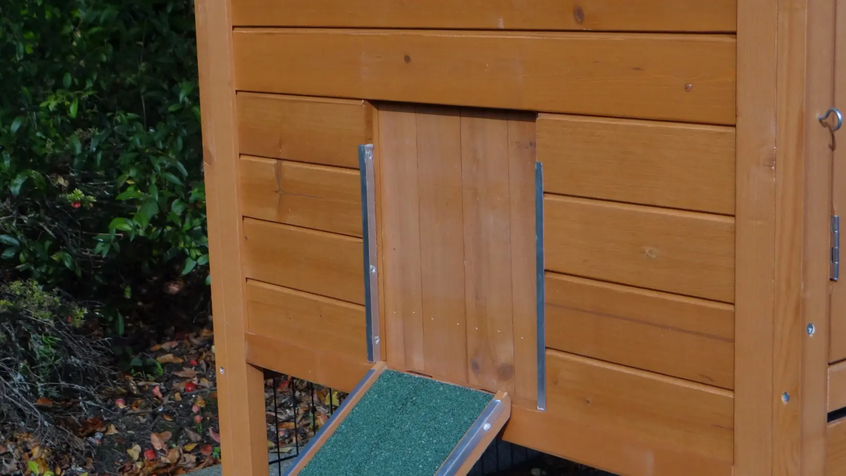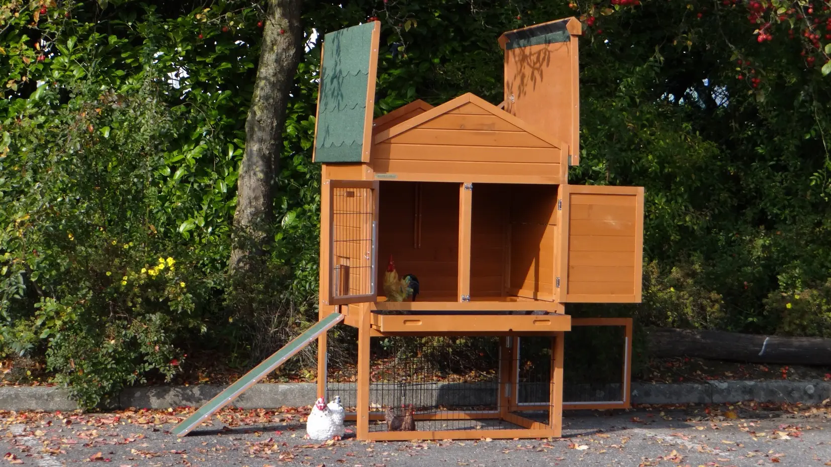 This practical coop is beautifully finished in every detail, featuring spacious doors and a large sleeping area equipped with two perches.