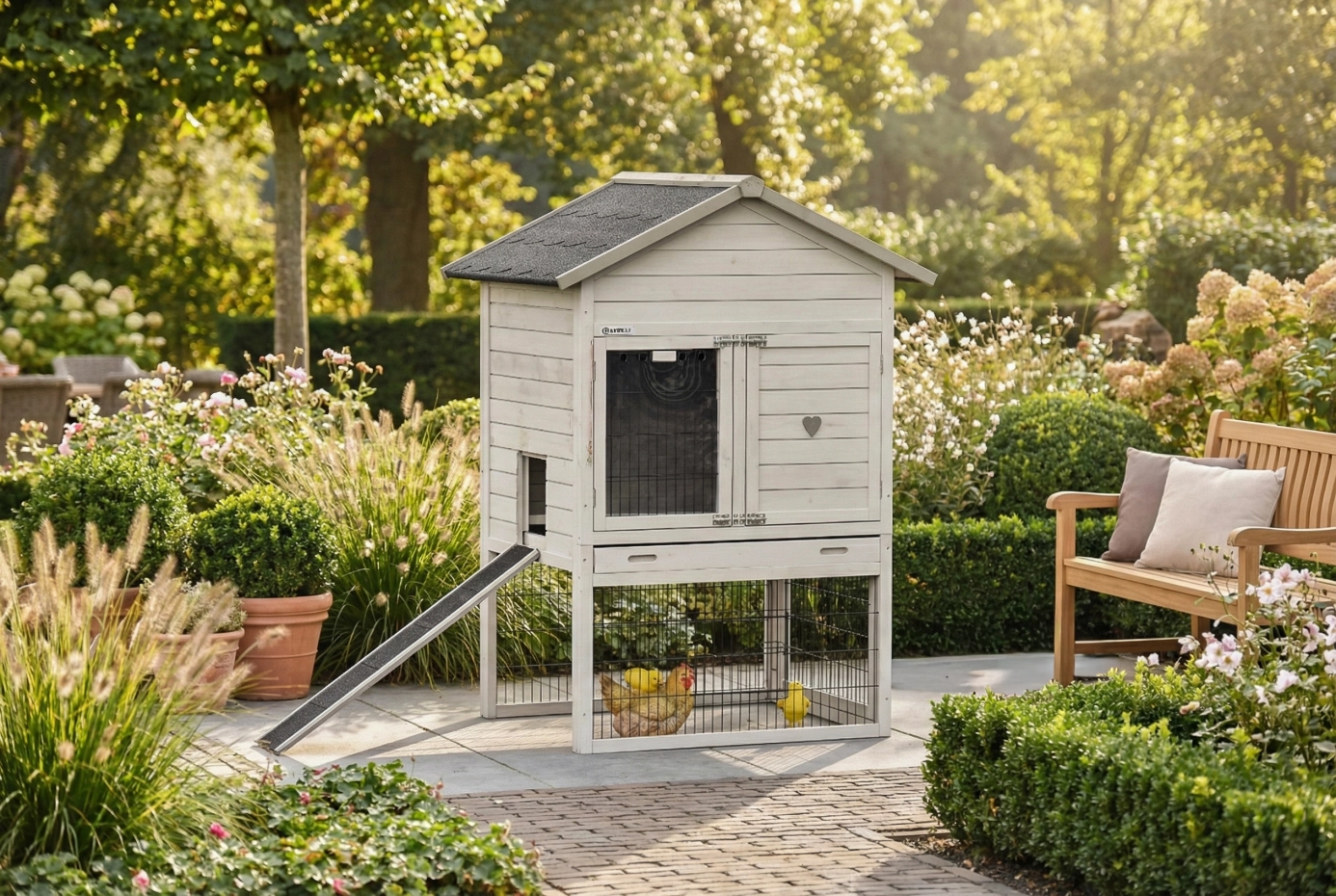 This practical coop is beautifully finished in every detail, featuring spacious doors and a large sleeping area equipped with two perches.