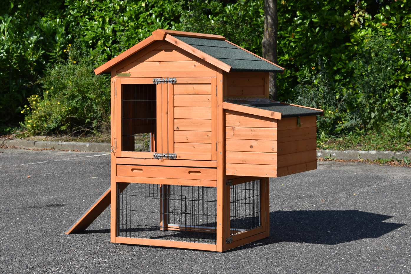 This chicken coop is perfectly finished in every detail, with spacious doors, a handy pull-out tray, and a sleeping area with one perch.