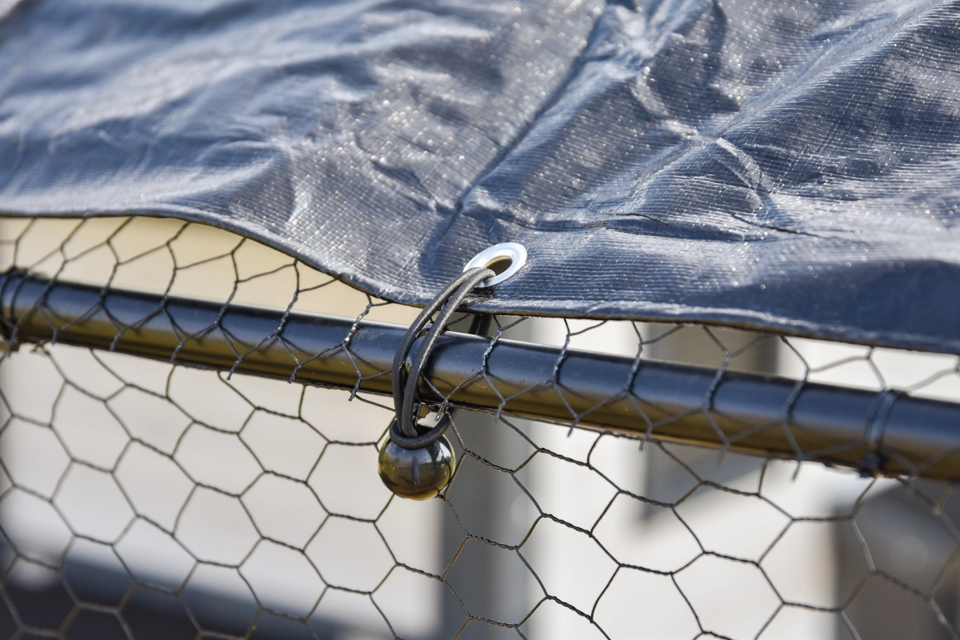 The cover tarp protects the run from rain, wind and sun. This way the chickens stay dry and always have a sheltered spot.