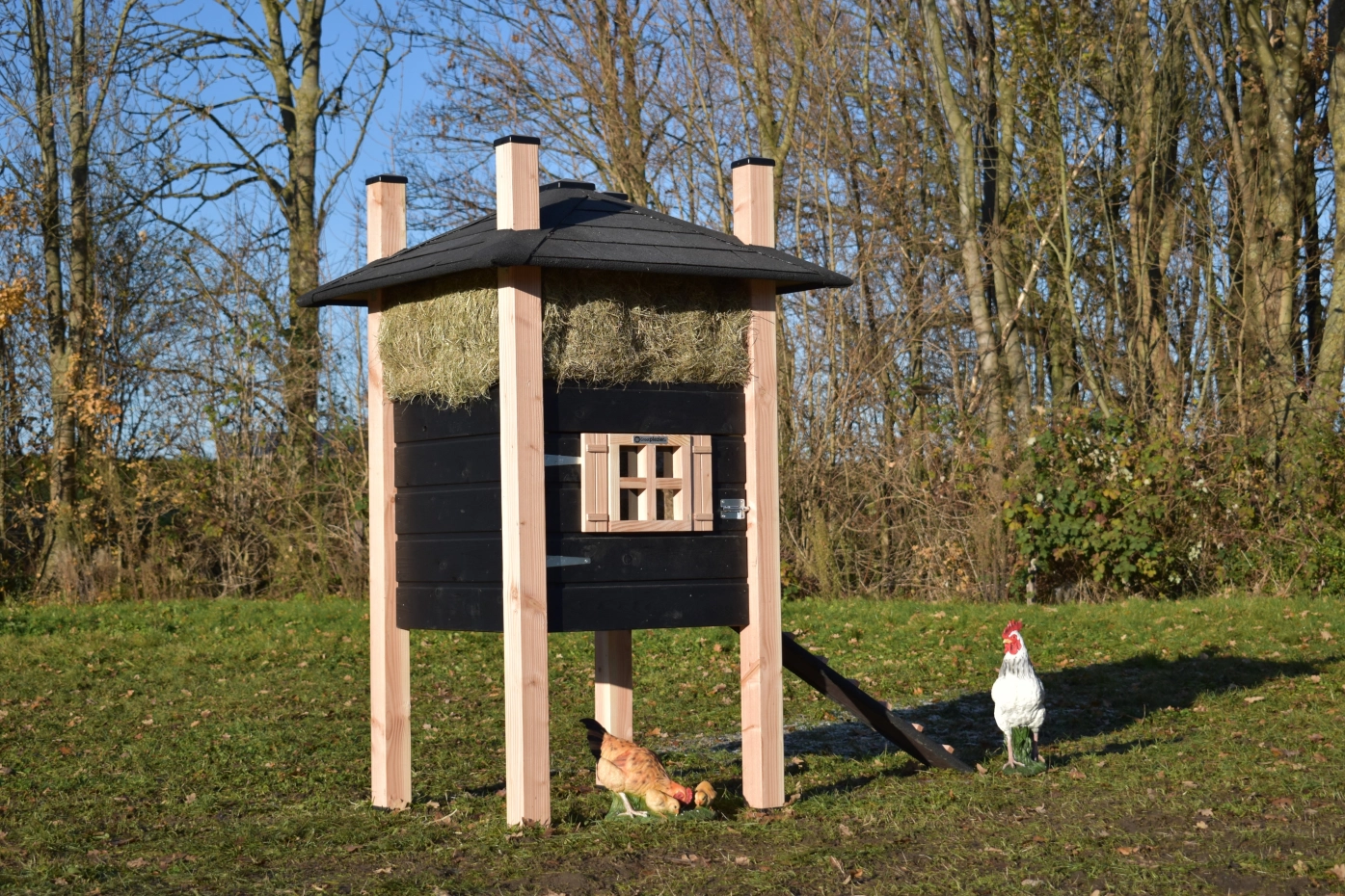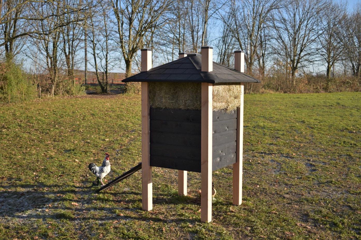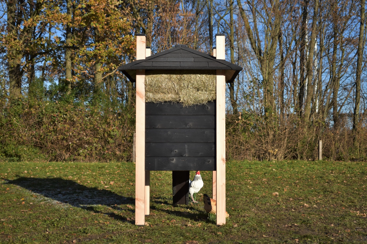 Chickencoop haystack Rosa is provided with poles of Douglaswood and black woodwork. This hutch is an acquisition for your yard. This hutch will be delivered en standard with hay. Because of the large doors you can clean the hutch very easily. To preserve the color of the wood you can treat it with Douglas oil. Without further treatment, the wood will quickly turn grey.