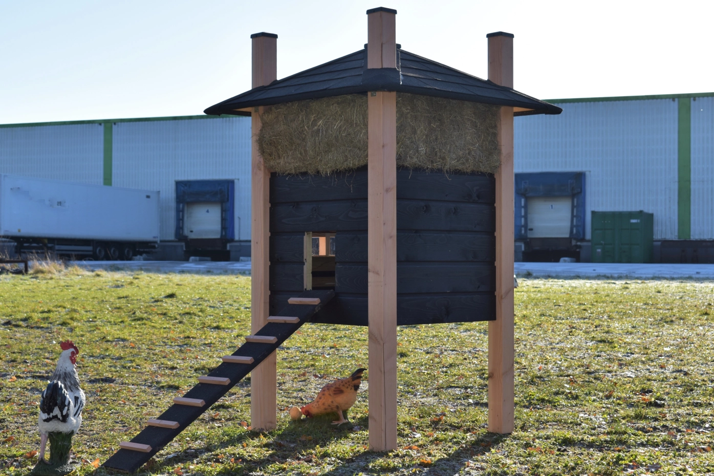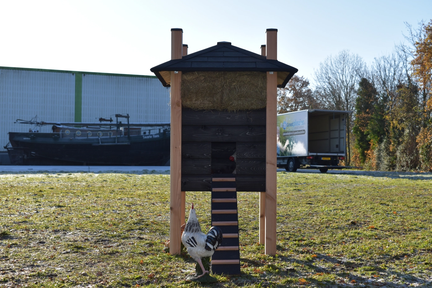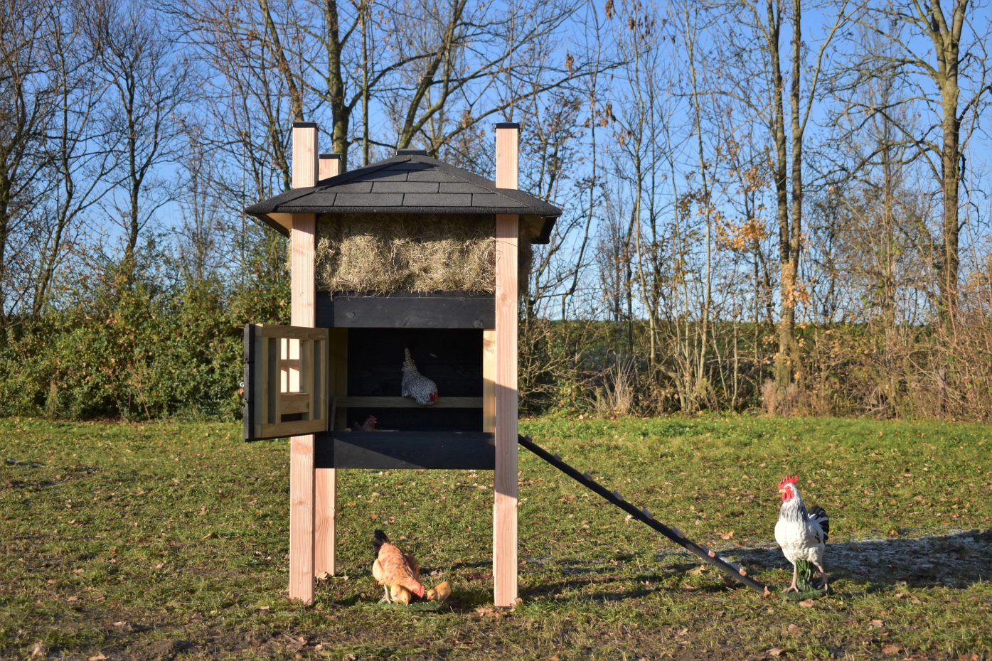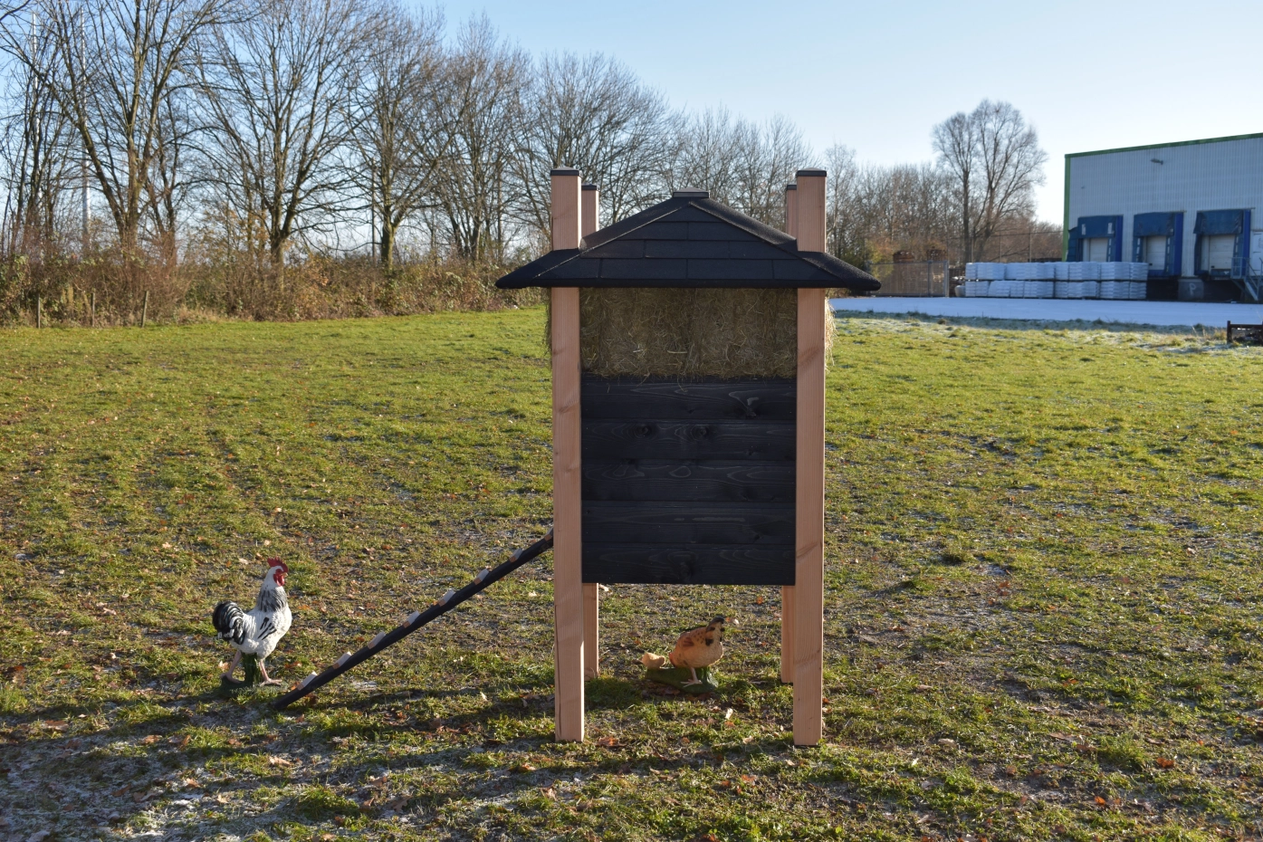 Chickencoop haystack Rosa is provided with poles of Douglaswood and black woodwork. This hutch is an acquisition for your yard. This hutch will be delivered en standard with hay. Because of the large doors you can clean the hutch very easily. To preserve the color of the wood you can treat it with Douglas oil. Without further treatment, the wood will quickly turn grey.