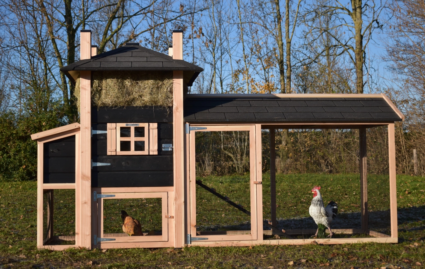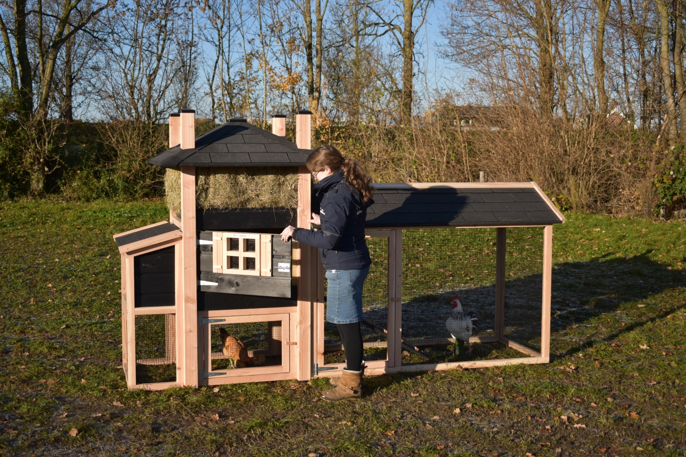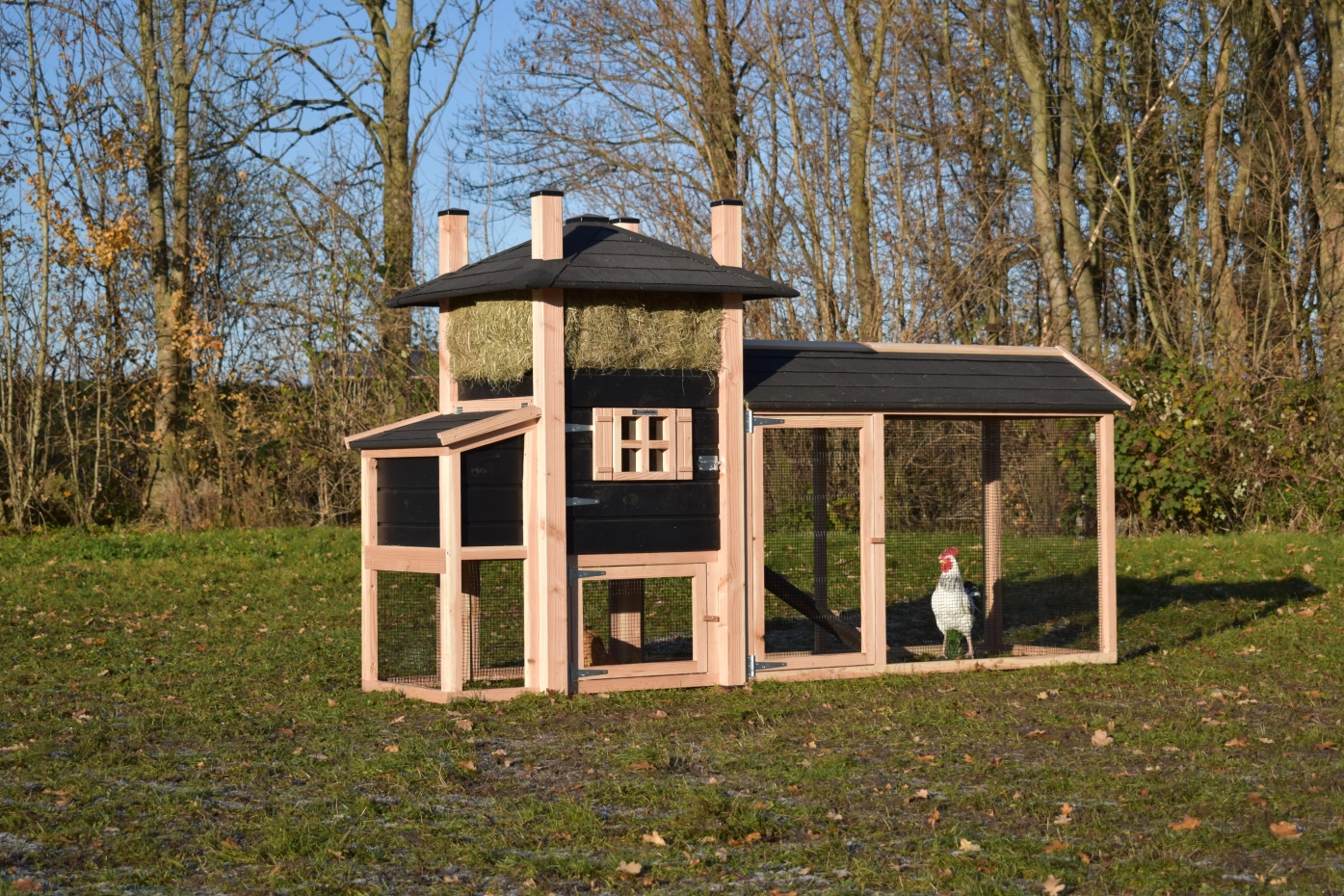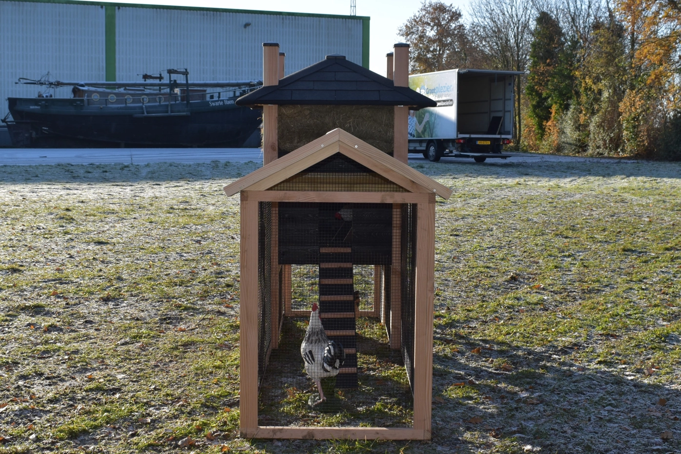 Chickencoop haystack Rosa is extended with a laying nest and a covered run. This hutch is partially made of Douglaswood and partially of black impregnated wood. The roofs are provided with black roofshingles. Because of the large doors you can clean the hutch very easily. The laying nest is provided with a hinged roof, so that you can collect the eggs very easily. The run has black mesh, so that you have a good view on your chickens. This hutch is an acquisition for your yard!