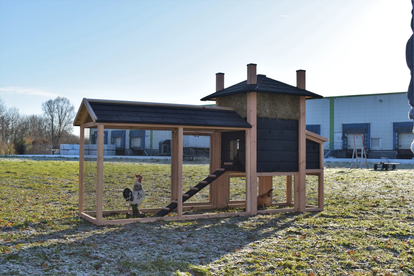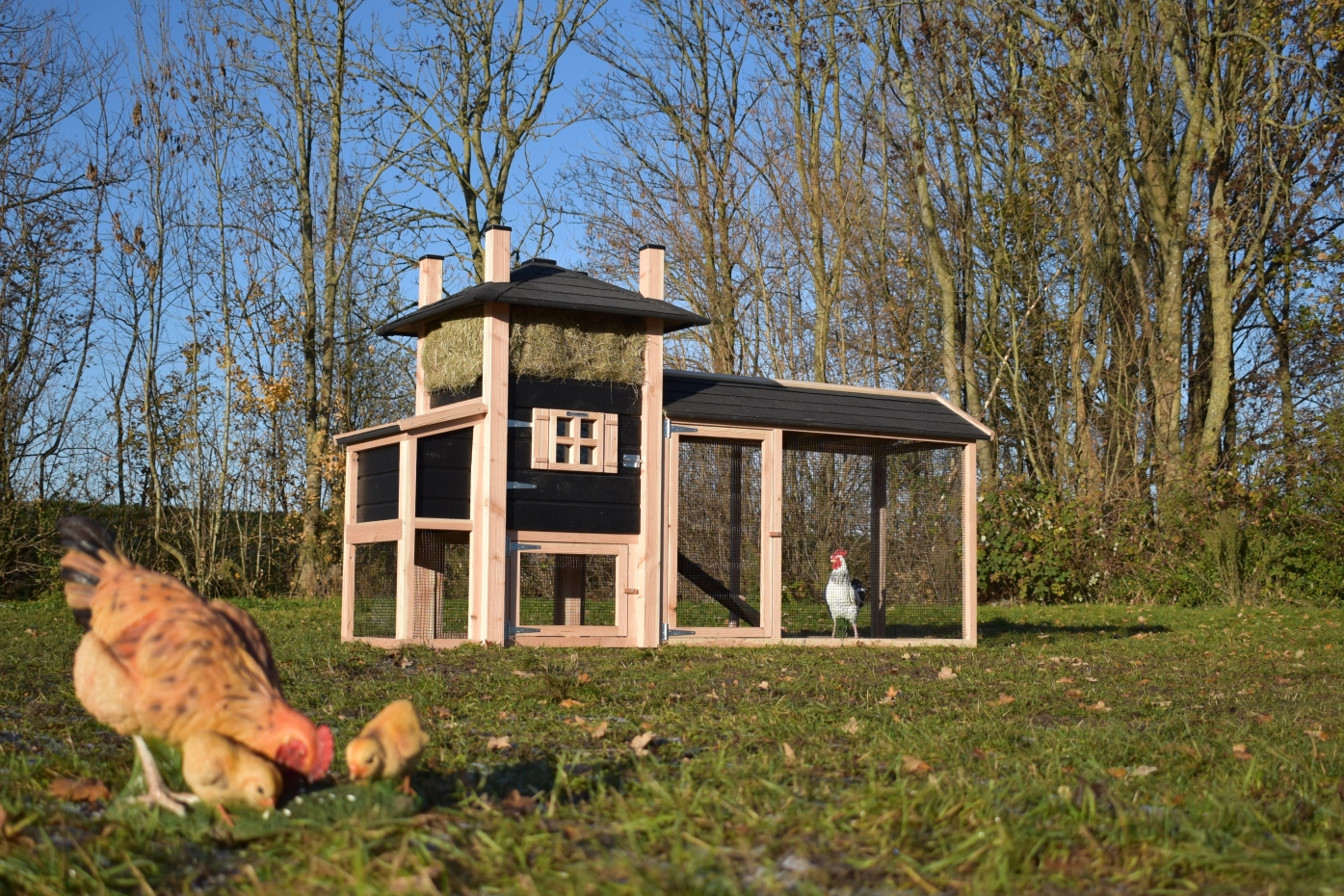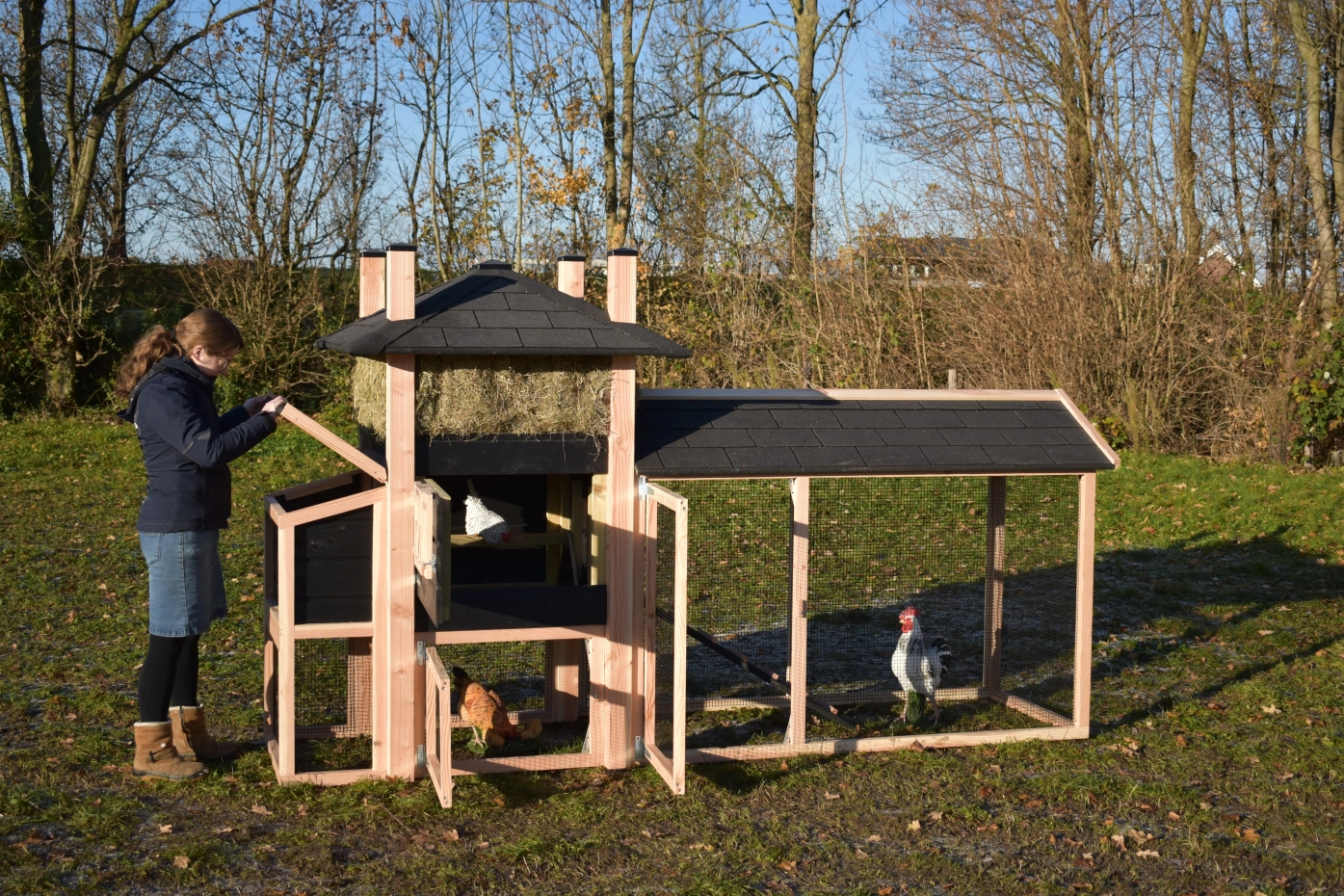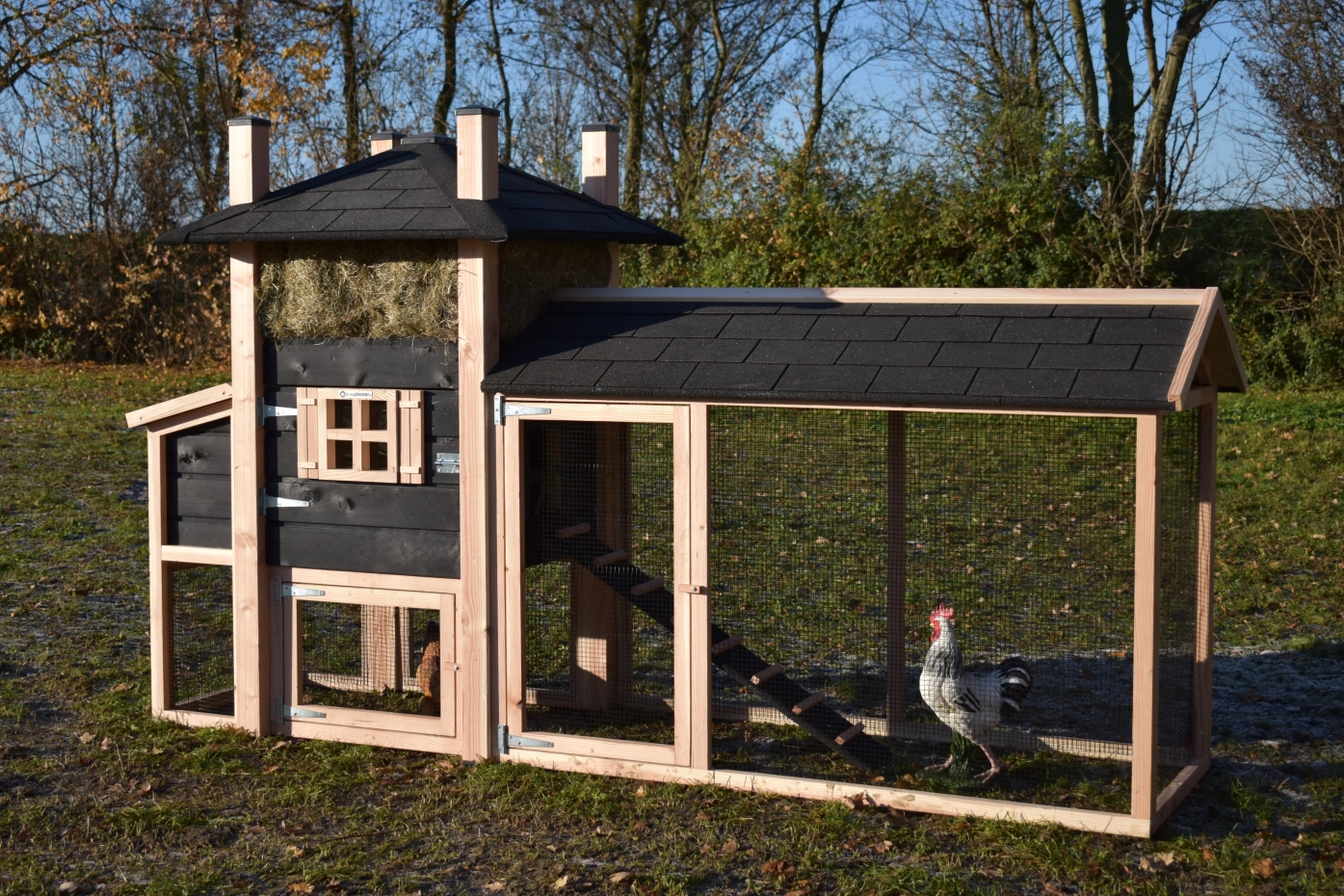Chickencoop haystack Rosa is extended with a laying nest and a covered run. This hutch is partially made of Douglaswood and partially of black impregnated wood. The roofs are provided with black roofshingles. Because of the large doors you can clean the hutch very easily. The laying nest is provided with a hinged roof, so that you can collect the eggs very easily. The run has black mesh, so that you have a good view on your chickens. This hutch is an acquisition for your yard!