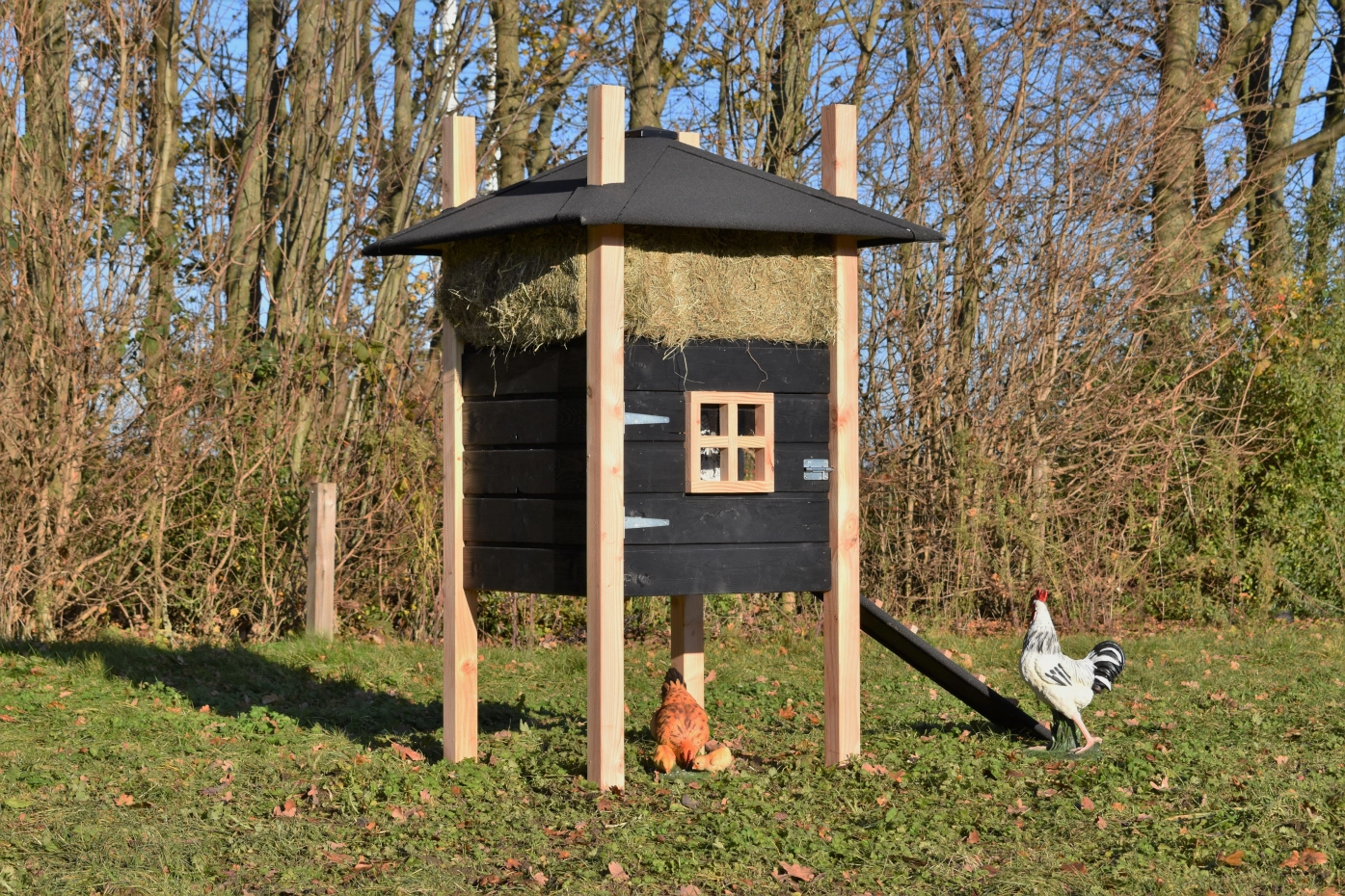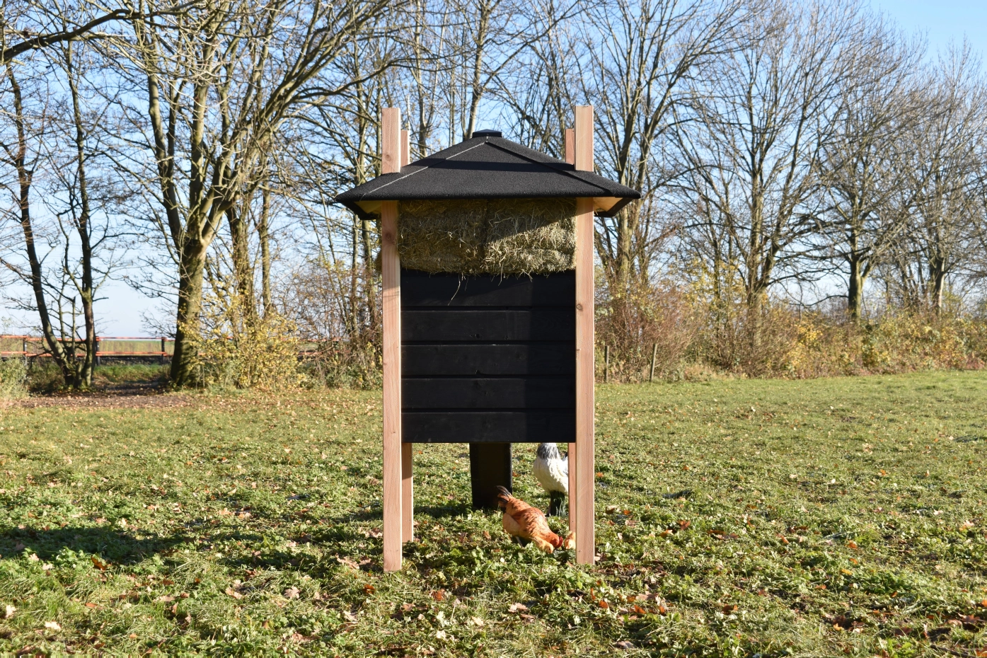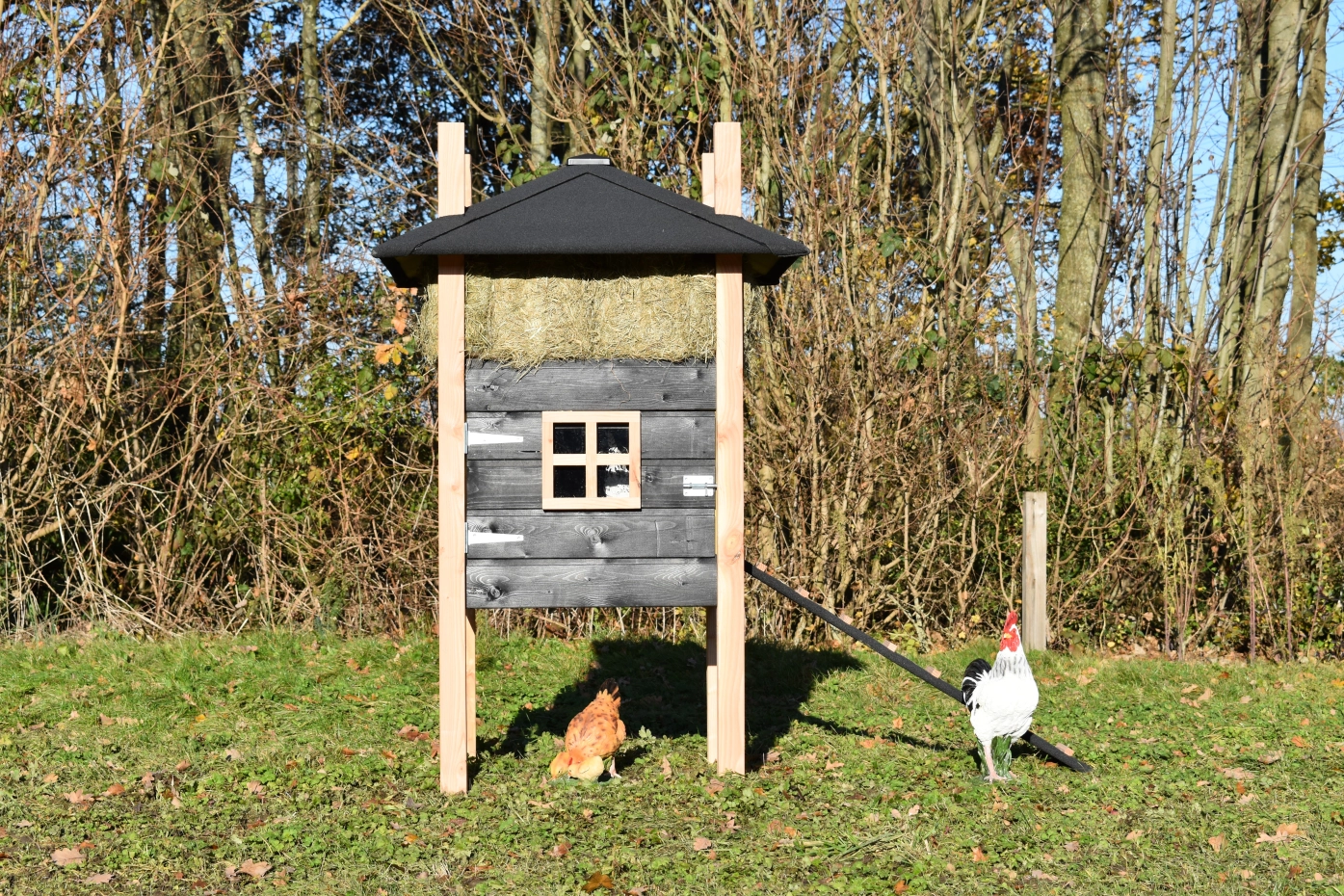Chickencoop haystack Rosalynn is partially made of Douglaswood and partially of black impregnated wood. You can easily order hay with it, so it could be the eye catcher in your garden. Because of the large door you can clean the sleeping compartment very easily. This hutch is suitable for 3 till 5 chickens.