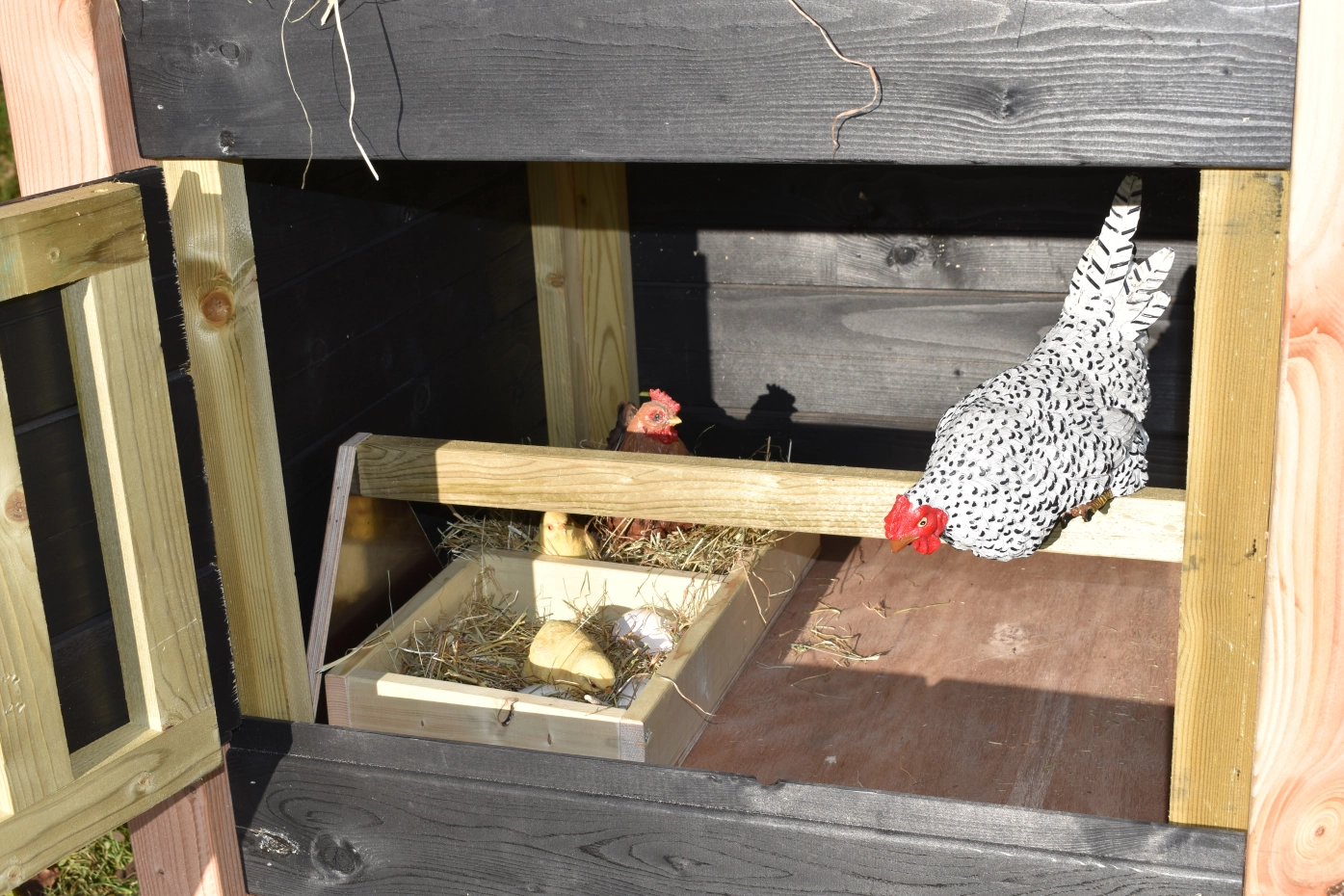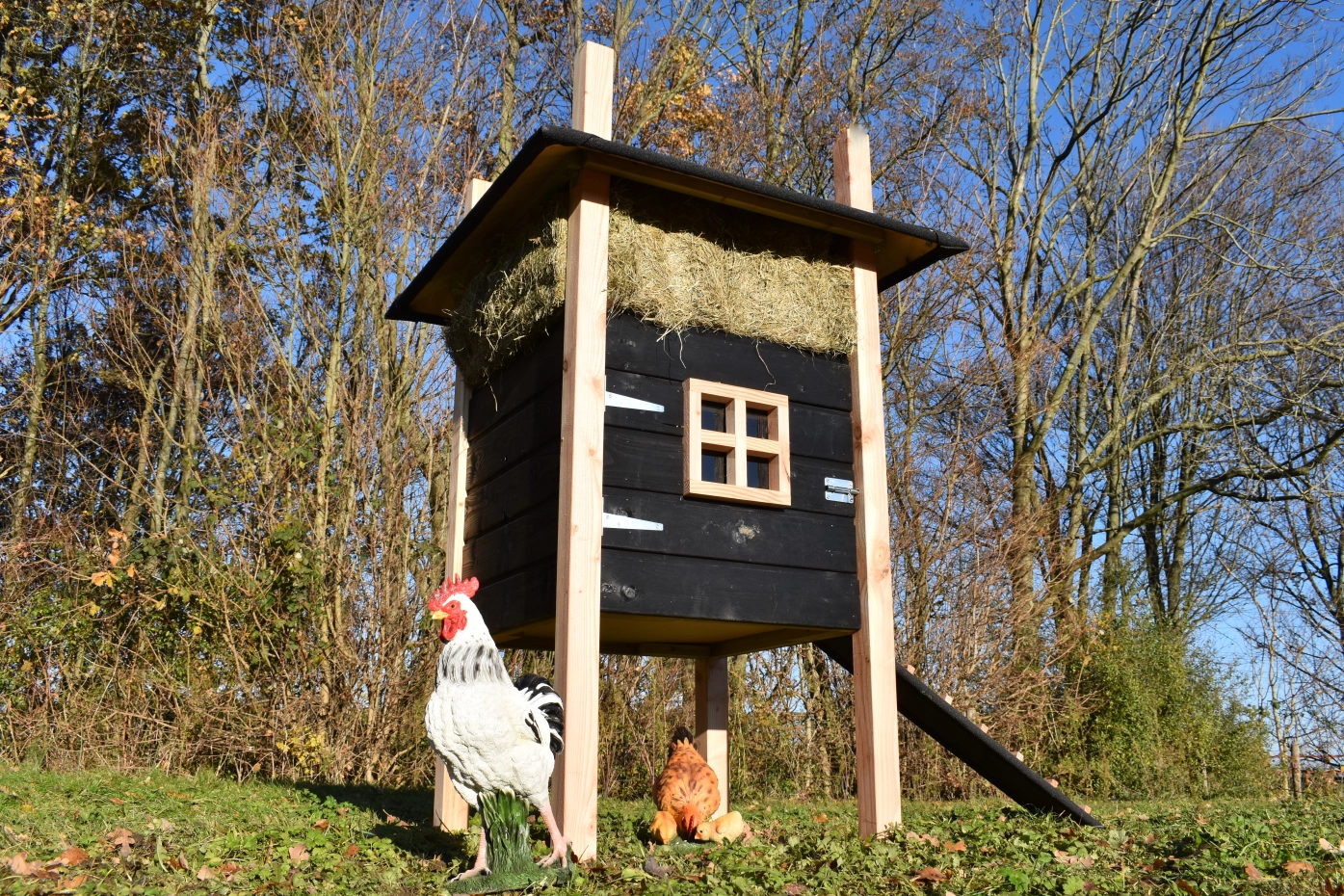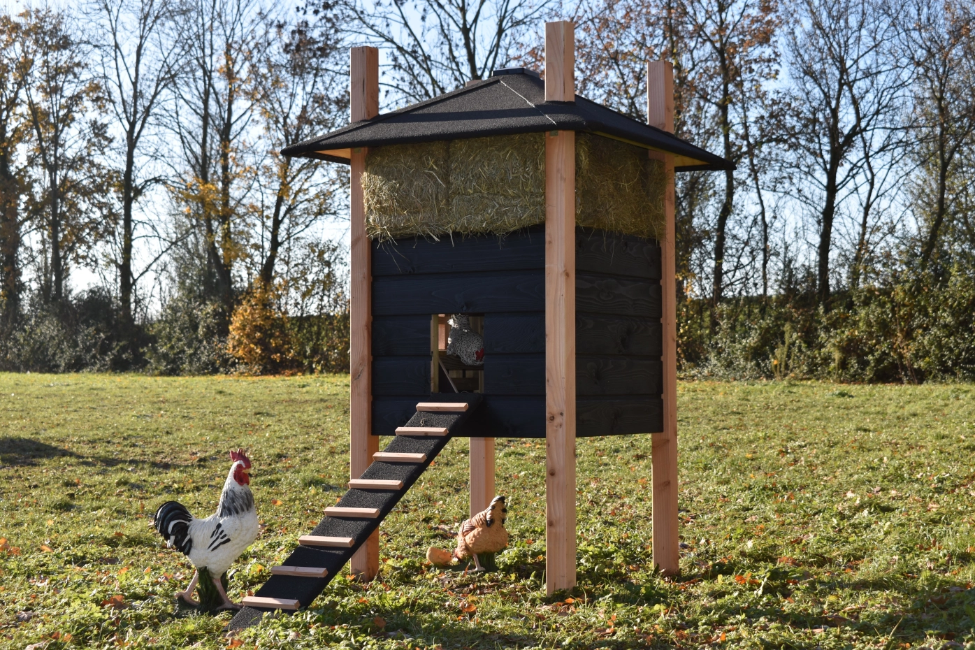 Chickencoop haystack Rosalynn is partially made of Douglaswood and partially of black impregnated wood. You can easily order hay with it, so it could be the eye catcher in your garden. Because of the large door you can clean the sleeping compartment very easily. This hutch is suitable for 3 till 5 chickens.