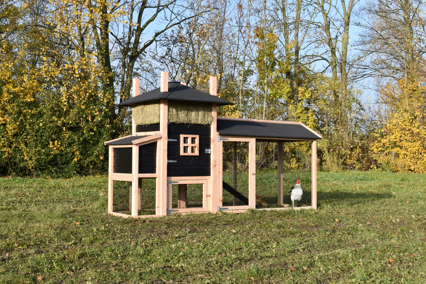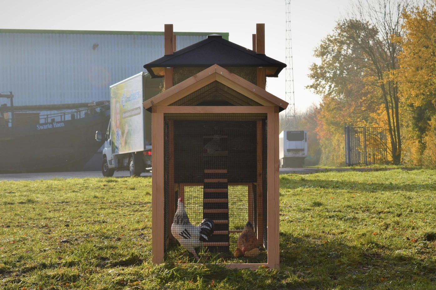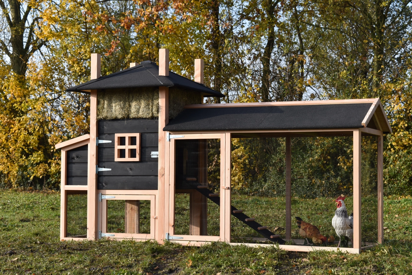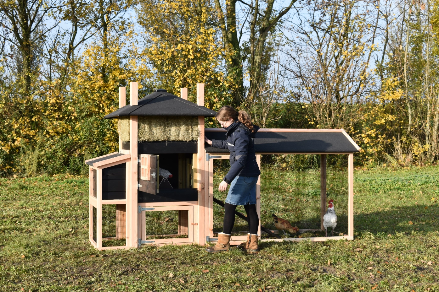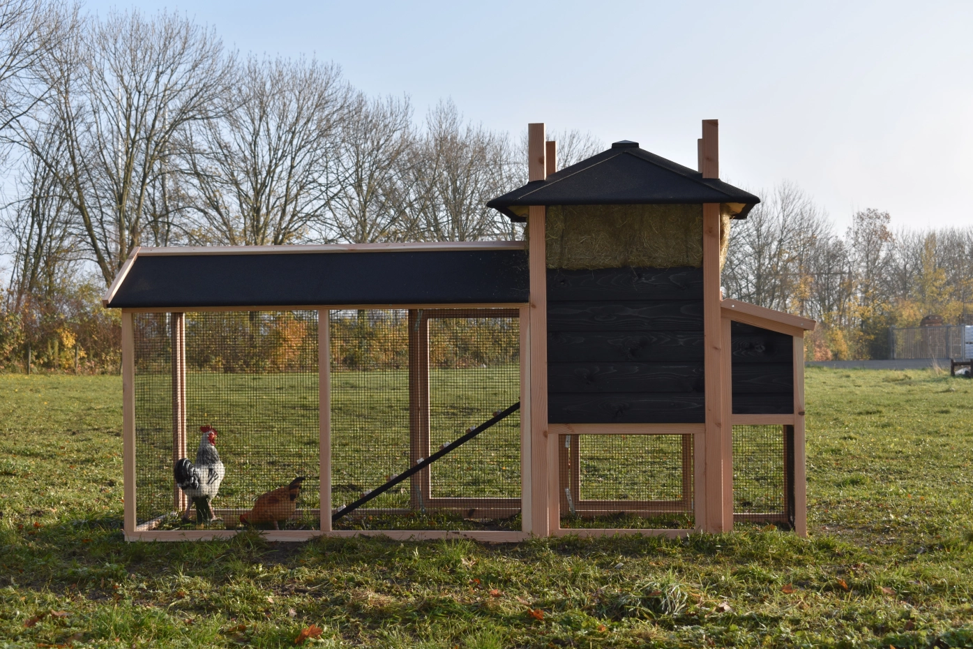 Chickencoop Rosalynn with laying nest and covered run. This haystack has a laying nest and a spacious run. Because the run runs underneath the coop and nest, your chickens have optimal space! The hinged roof of the laying nest allows you to collect eggs without disturbing them. The door of the coop is fitted with a cross window, which gives the coop its rustic style. Combined with the hay, you will have a beautiful picture in your garden! The wide door provides a wide opening. Beautiful and practical hutch, manufactured in impregnated wood for a long life.