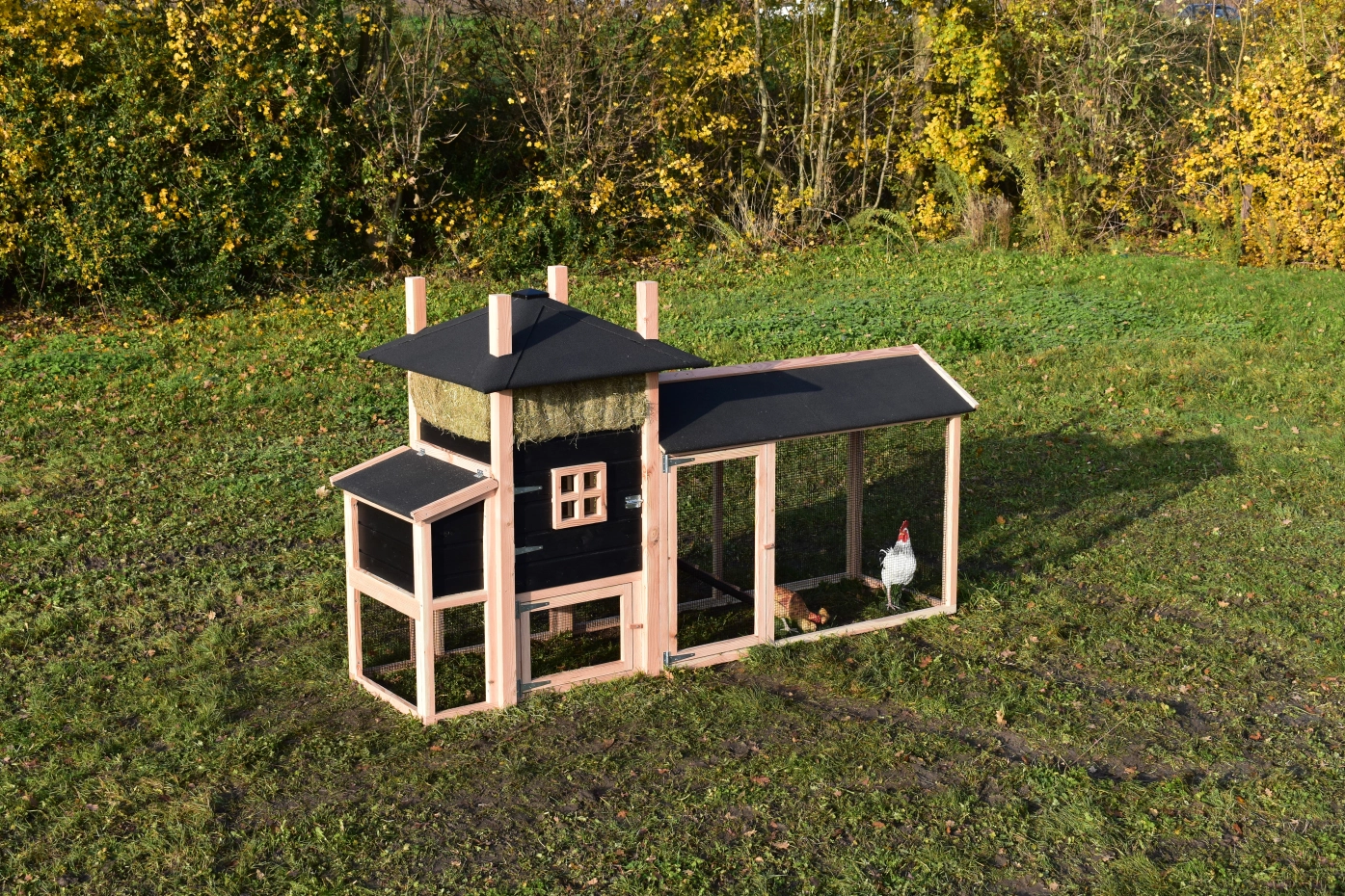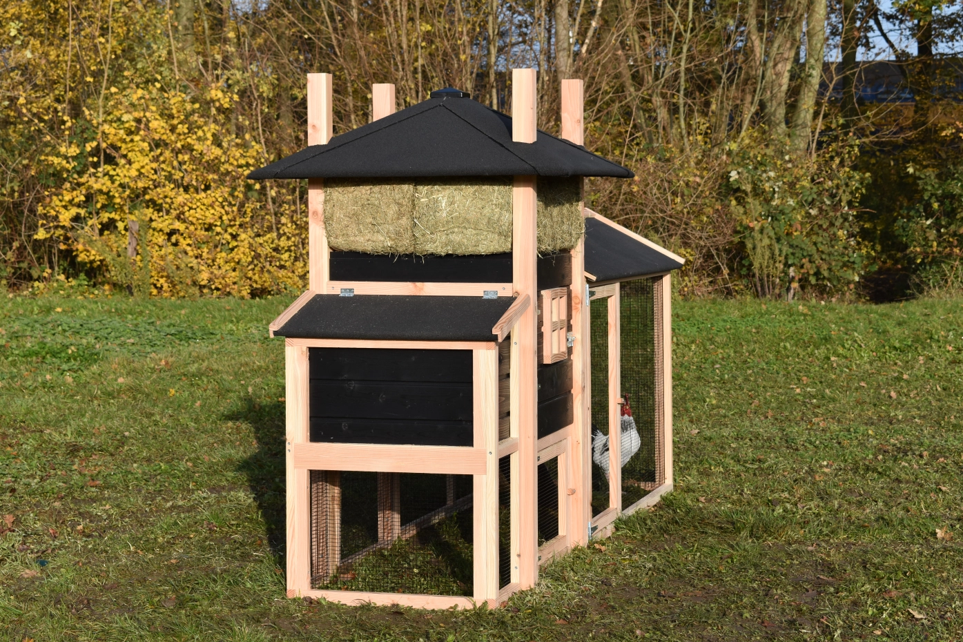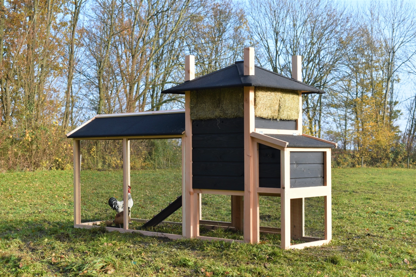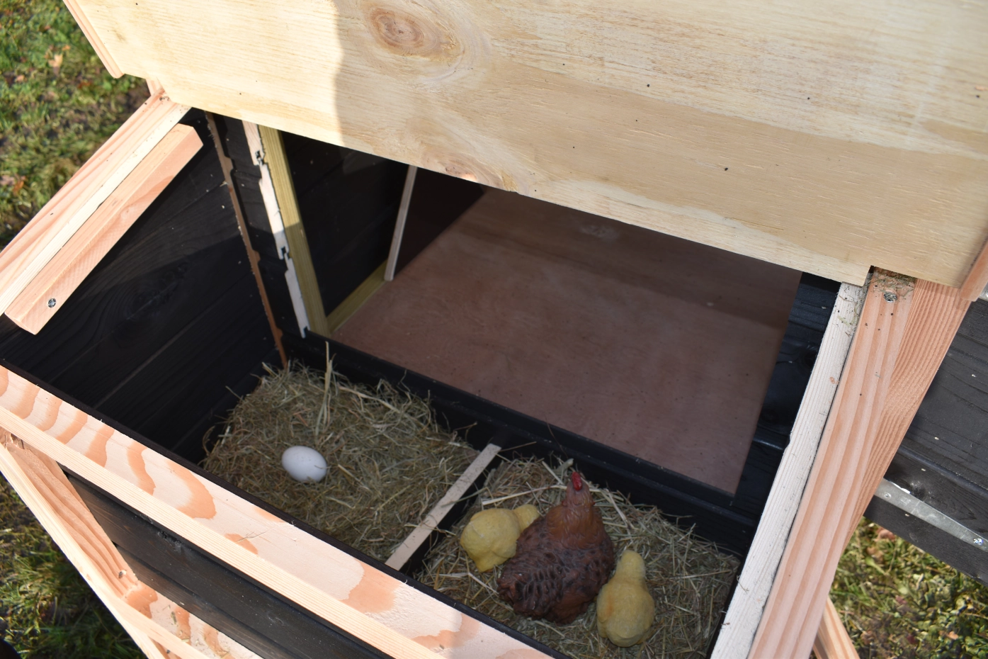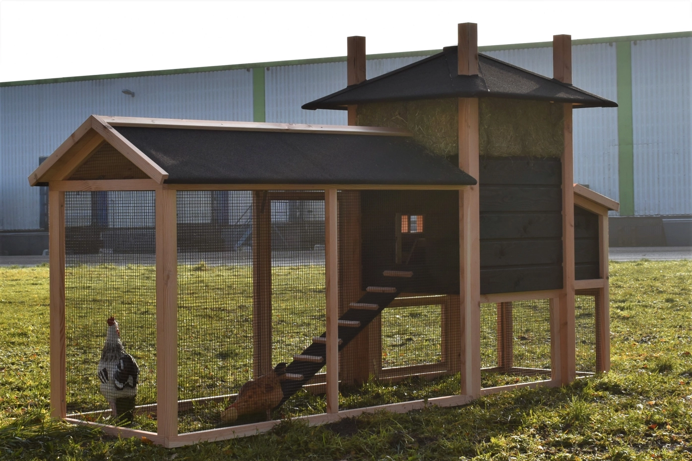 Chickencoop Rosalynn with laying nest and covered run. This haystack has a laying nest and a spacious run. Because the run runs underneath the coop and nest, your chickens have optimal space! The hinged roof of the laying nest allows you to collect eggs without disturbing them. The door of the coop is fitted with a cross window, which gives the coop its rustic style. Combined with the hay, you will have a beautiful picture in your garden! The wide door provides a wide opening. Beautiful and practical hutch, manufactured in impregnated wood for a long life.