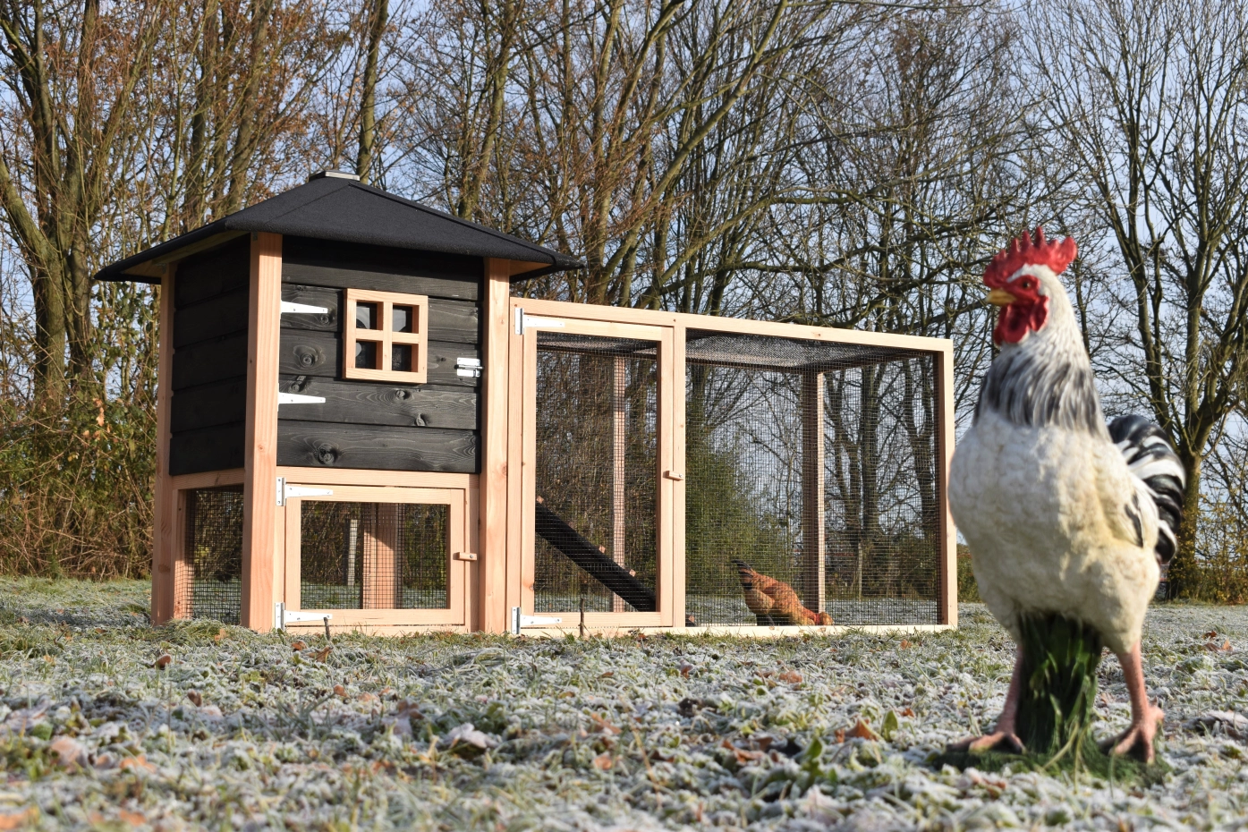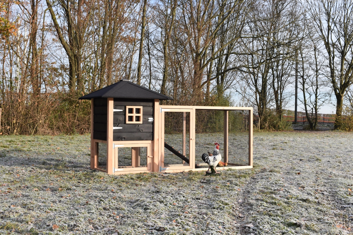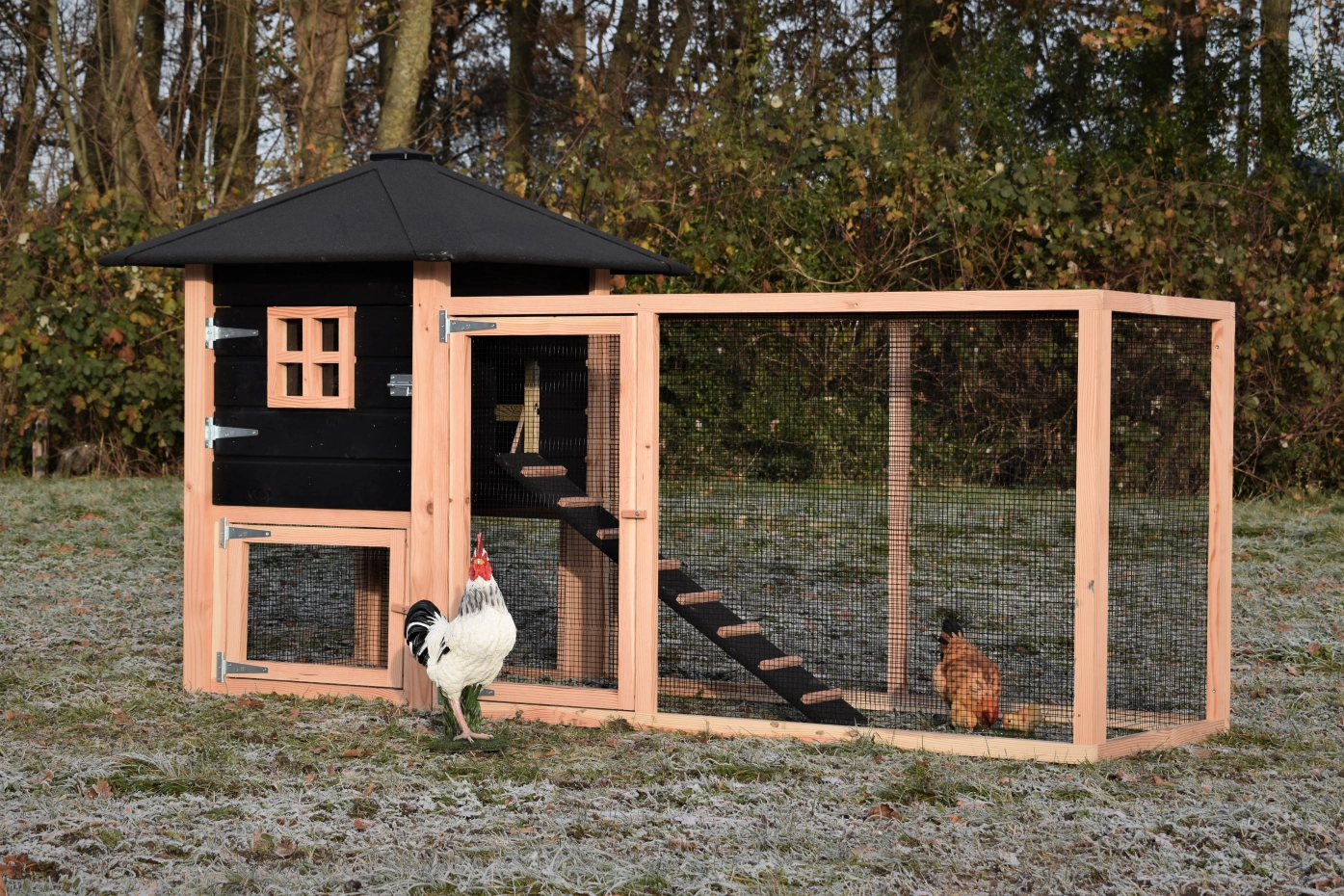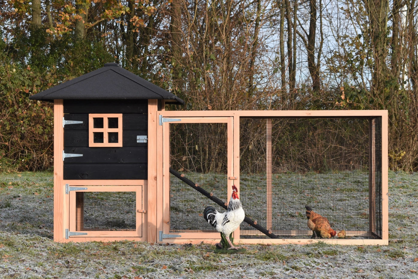 The chickencoop Rosy is extended with an additional run, which offers your chickens a lot of space. The grand run offers you a nice view of your chickens. Because of the large door you can easily clean the sleeping compartment. A beautiful hutch for a low price!