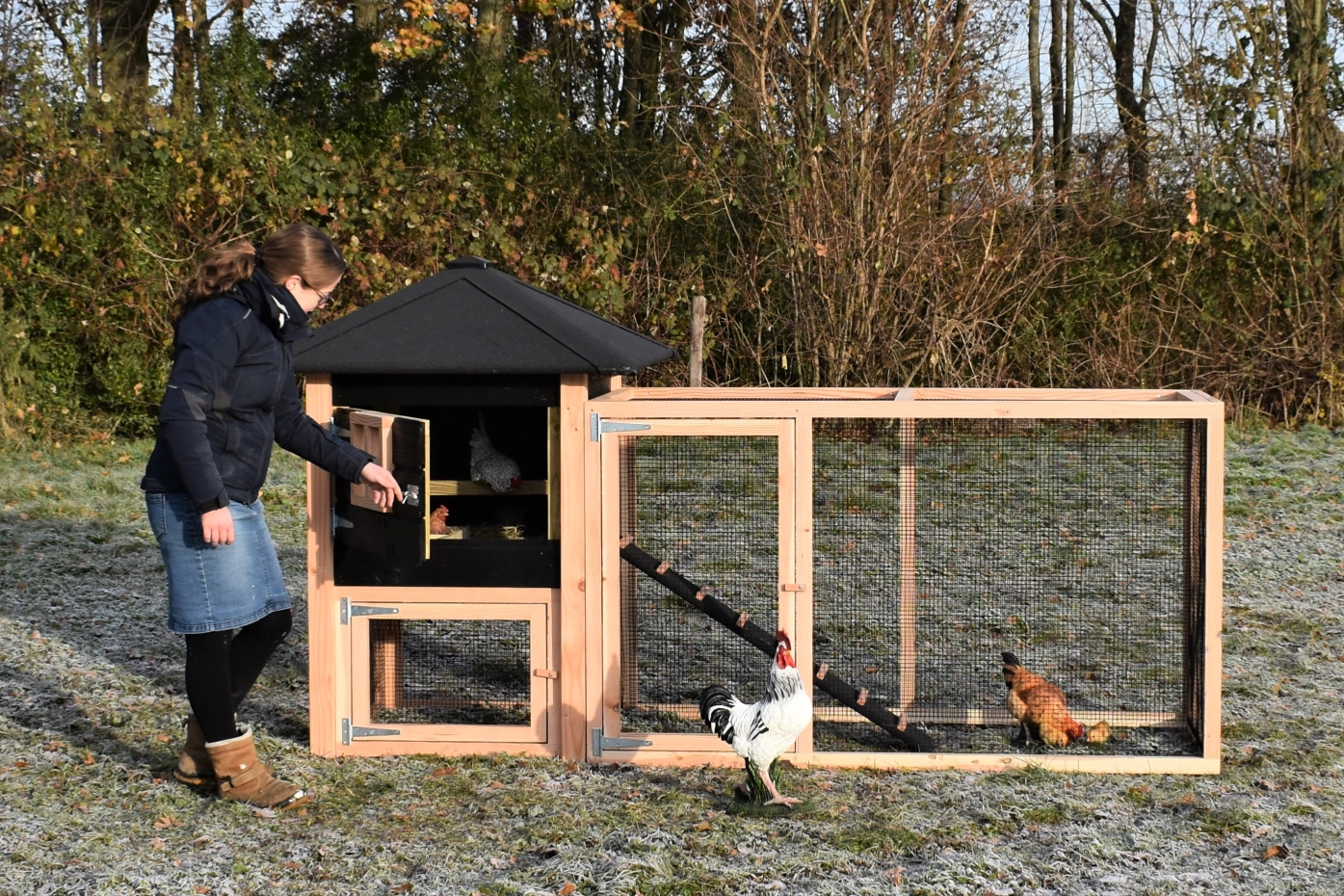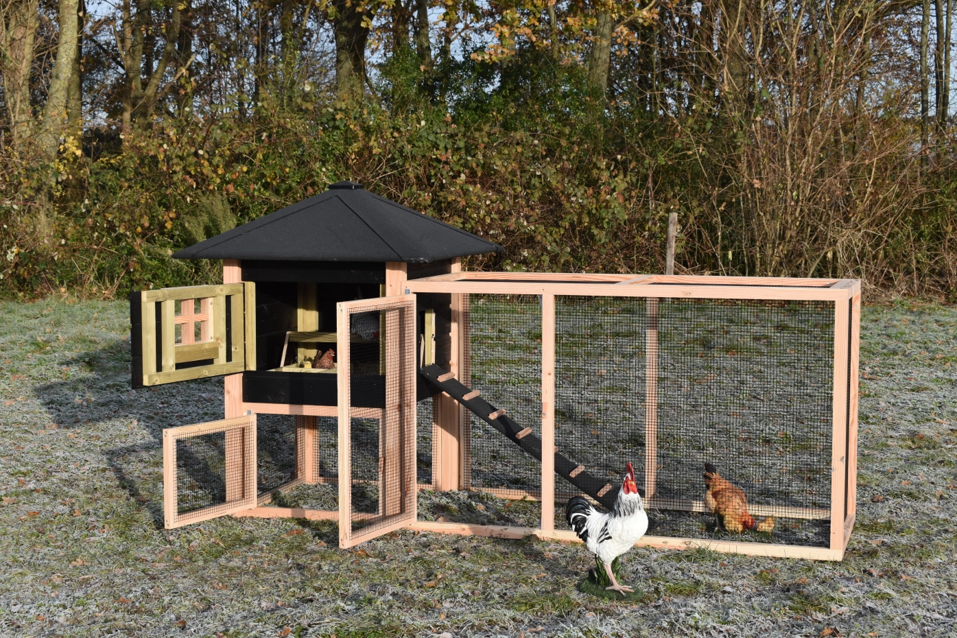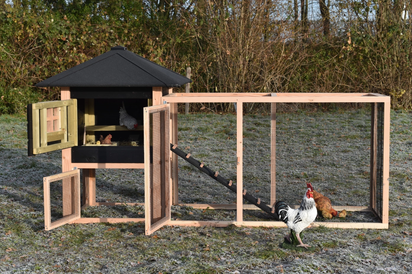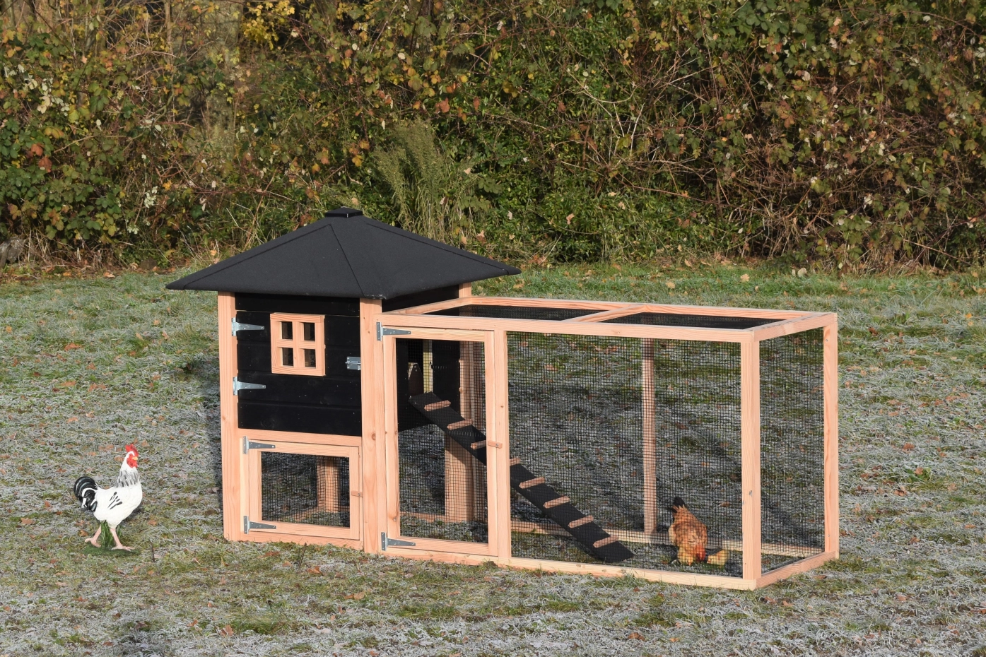 The chickencoop Rosy is extended with an additional run, which offers your chickens a lot of space. The grand run offers you a nice view of your chickens. Because of the large door you can easily clean the sleeping compartment. A beautiful hutch for a low price!