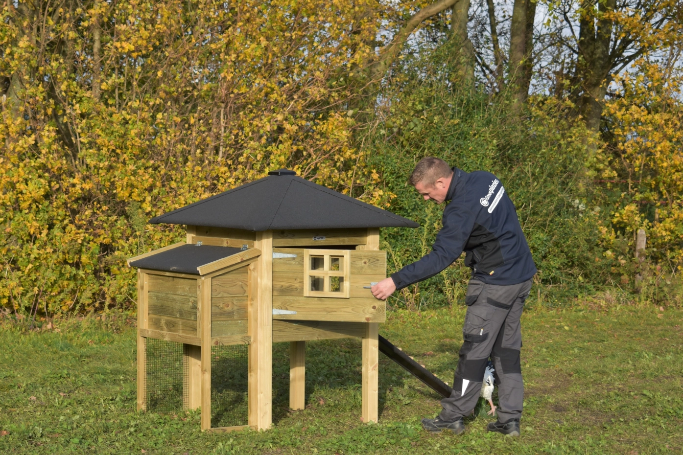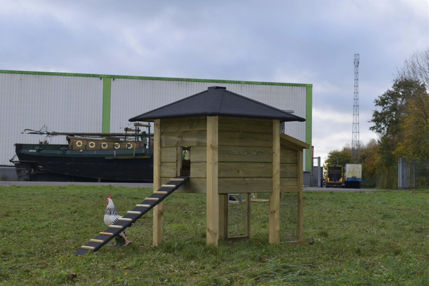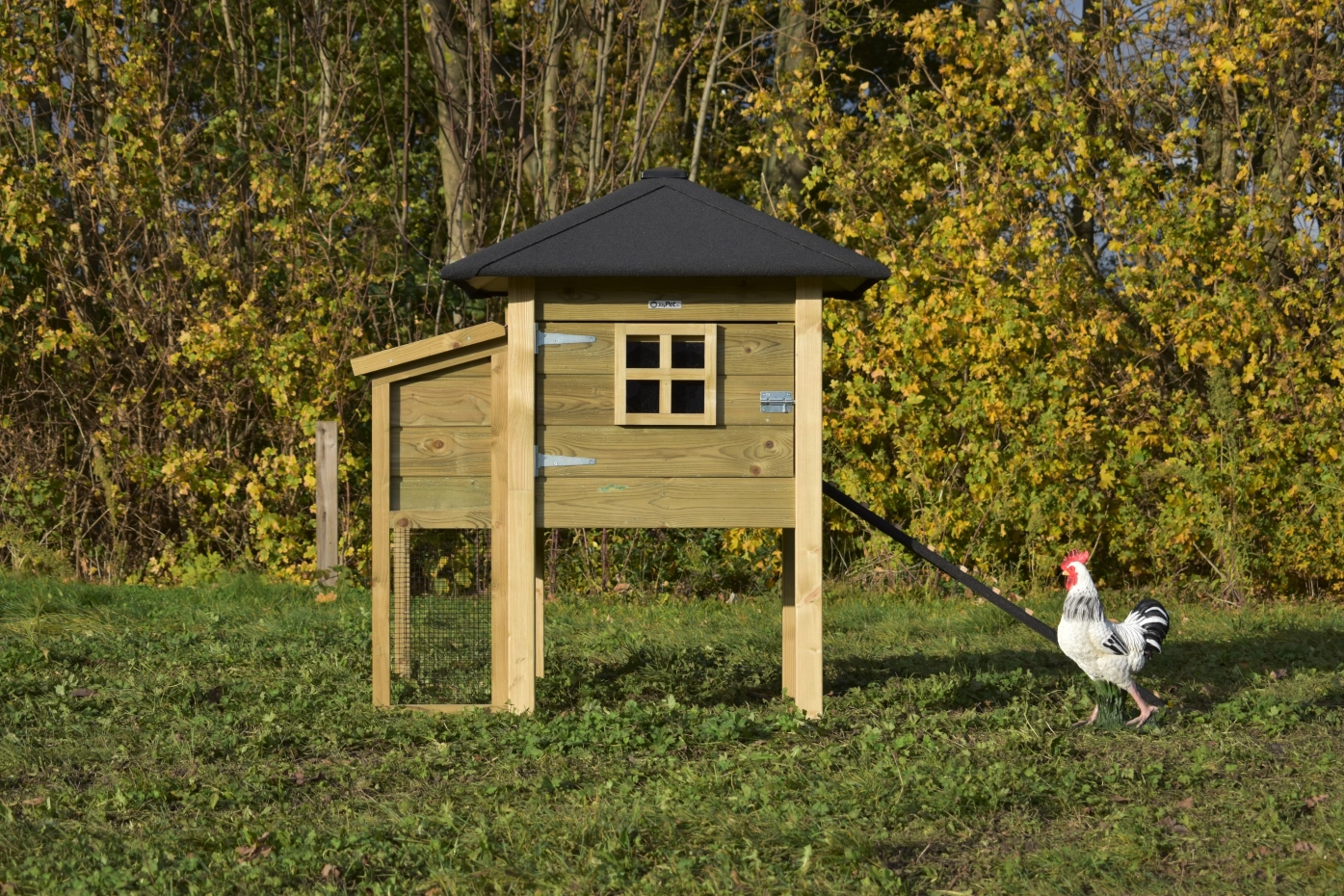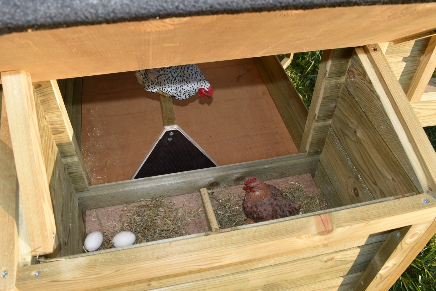 Chickencoop Rosy is extended with a laying nest. The hutch has a large sleeping compartment with a large door, so you can clean the sleeping compartment very easily. The laying nest has a hinged roof, which makes that you can collect the eggs very easily. When it rains, the chickens can find a shelter under the sleeping compartment and the laying nest. The hutch is made of impregnated wood, and is free from maintenance. A good hutch for an even better price!