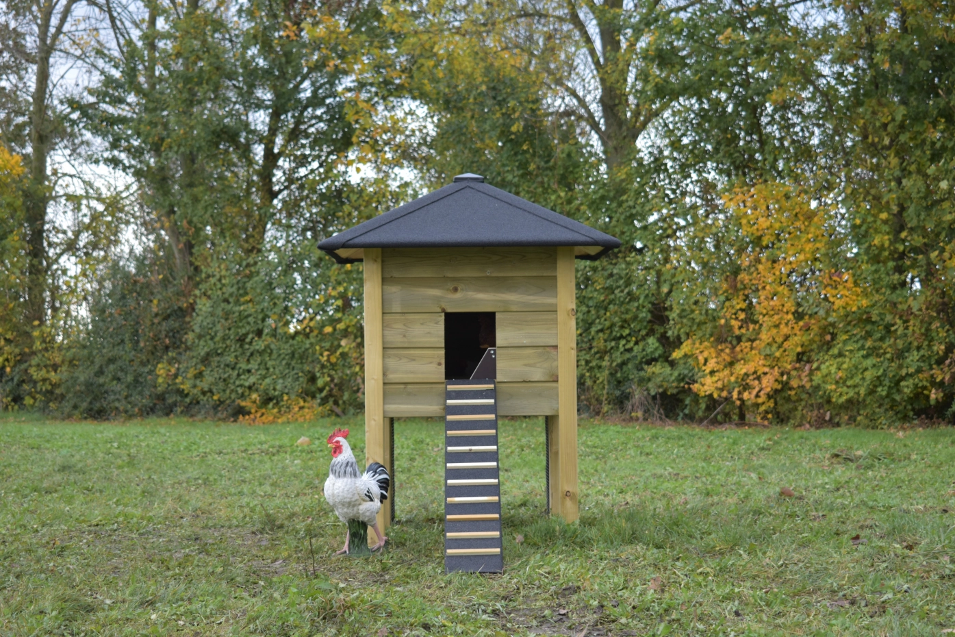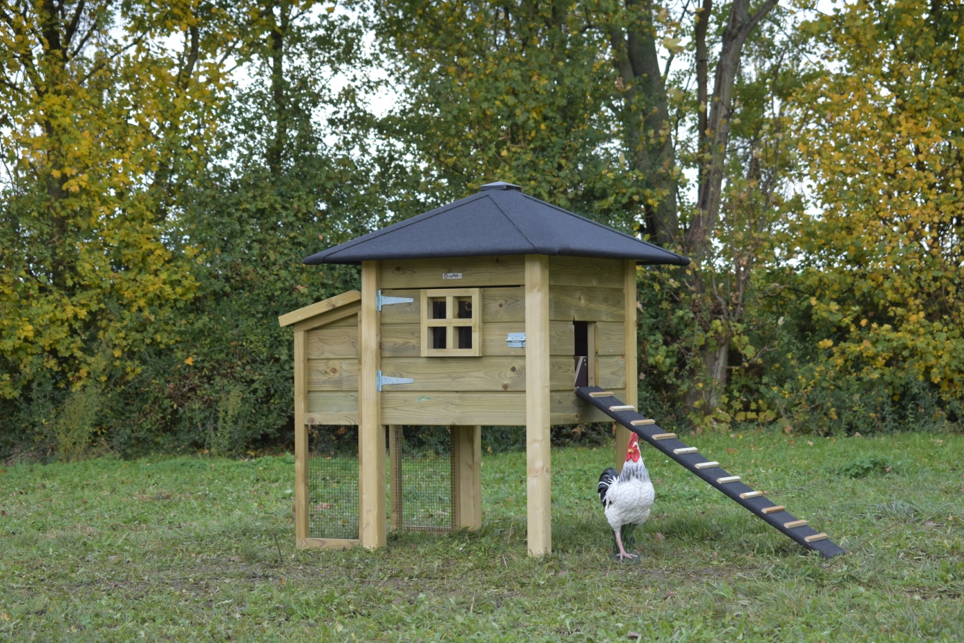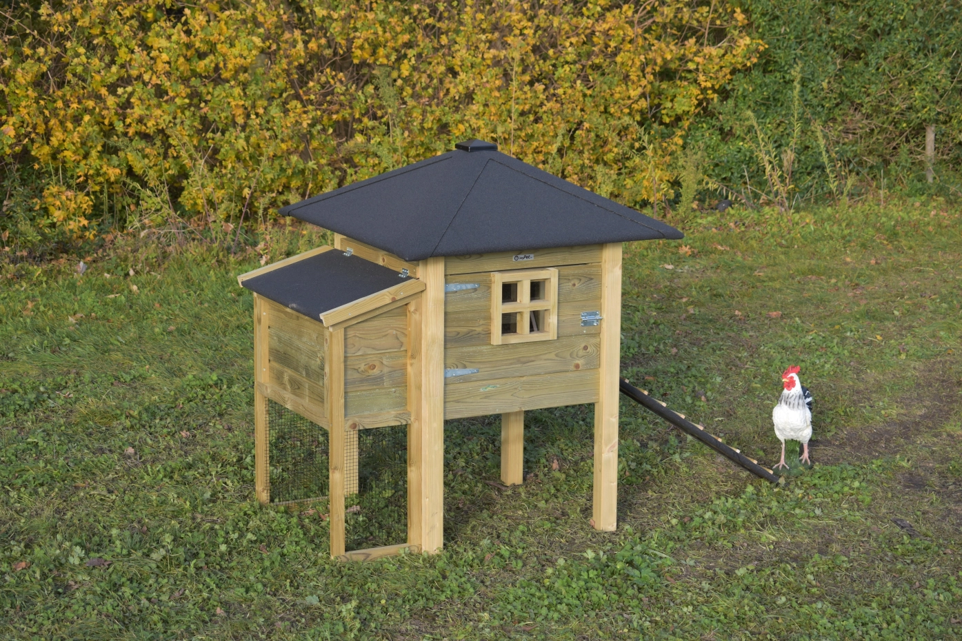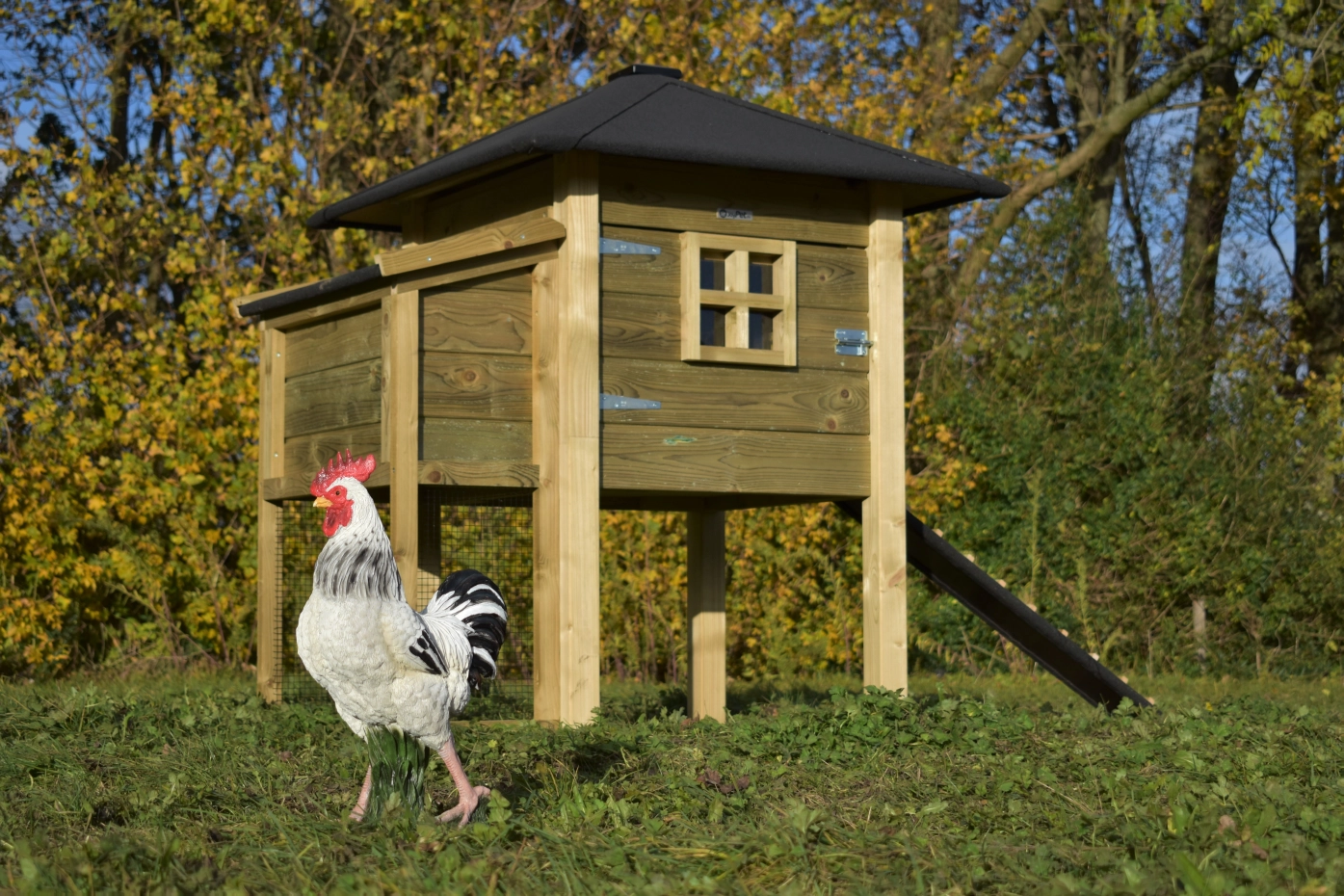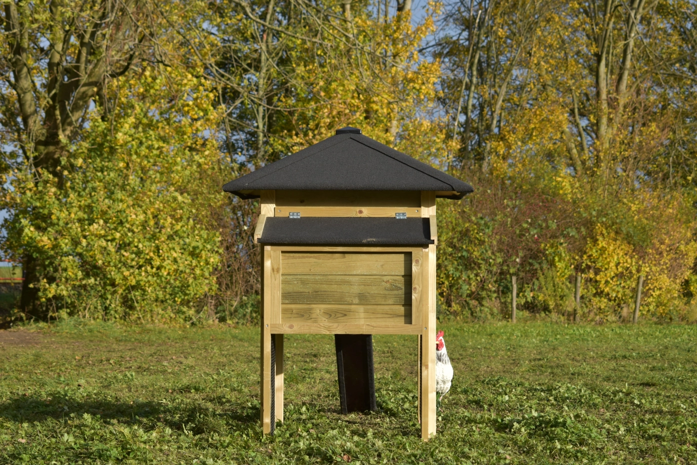 Chickencoop Rosy is extended with a laying nest. The hutch has a large sleeping compartment with a large door, so you can clean the sleeping compartment very easily. The laying nest has a hinged roof, which makes that you can collect the eggs very easily. When it rains, the chickens can find a shelter under the sleeping compartment and the laying nest. The hutch is made of impregnated wood, and is free from maintenance. A good hutch for an even better price!