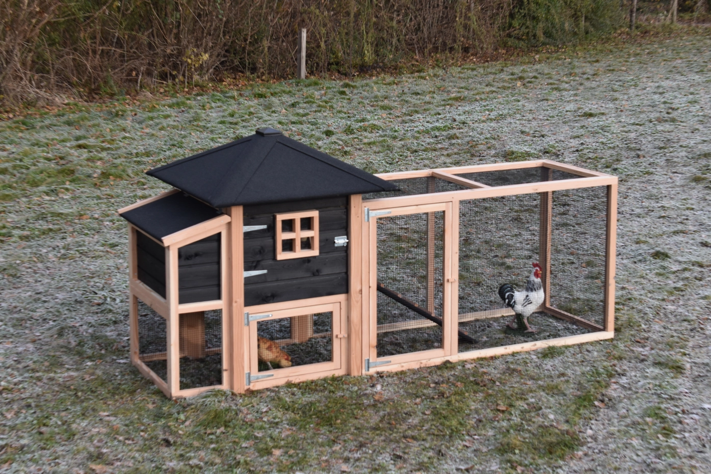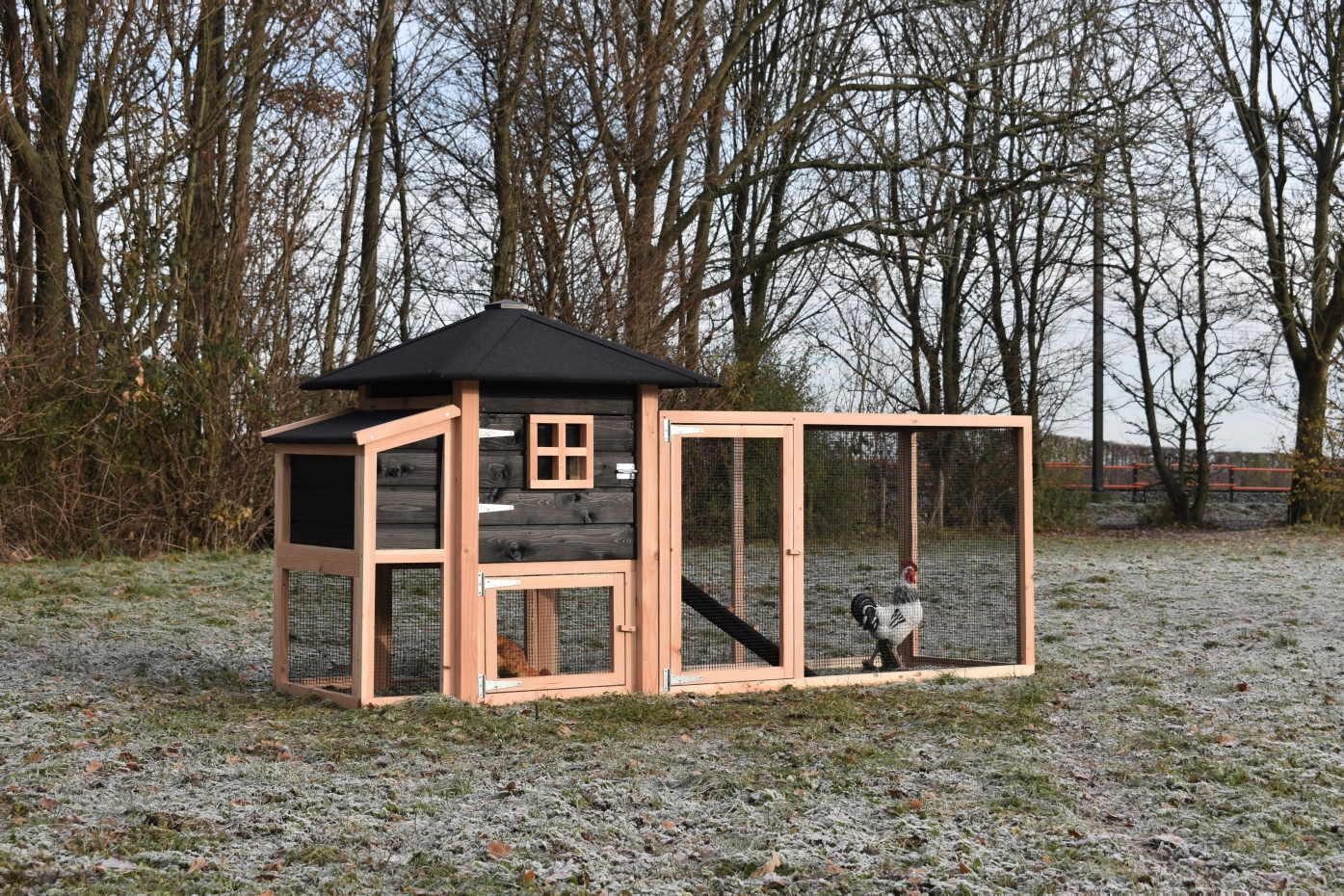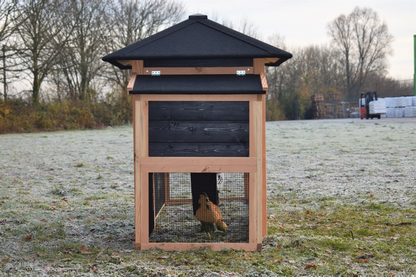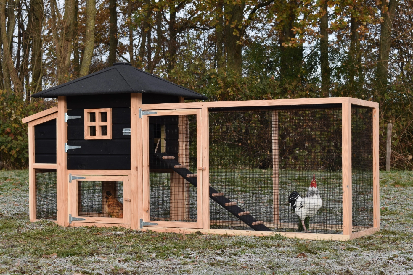 Chickencoop Rosy is extended with a laying nest and a run. The hutch has a large sleeping compartment with a large door, so you can clean the sleeping compartment very easily. The laying nest has a hinged roof, which makes that you can collect the eggs very easily. When it rains, the chickens can find a shelter under the sleeping compartment and the laying nest. The hutch is made of Douglaswood and black impregnated wood, and is free from maintenance. A good hutch for an even better price!