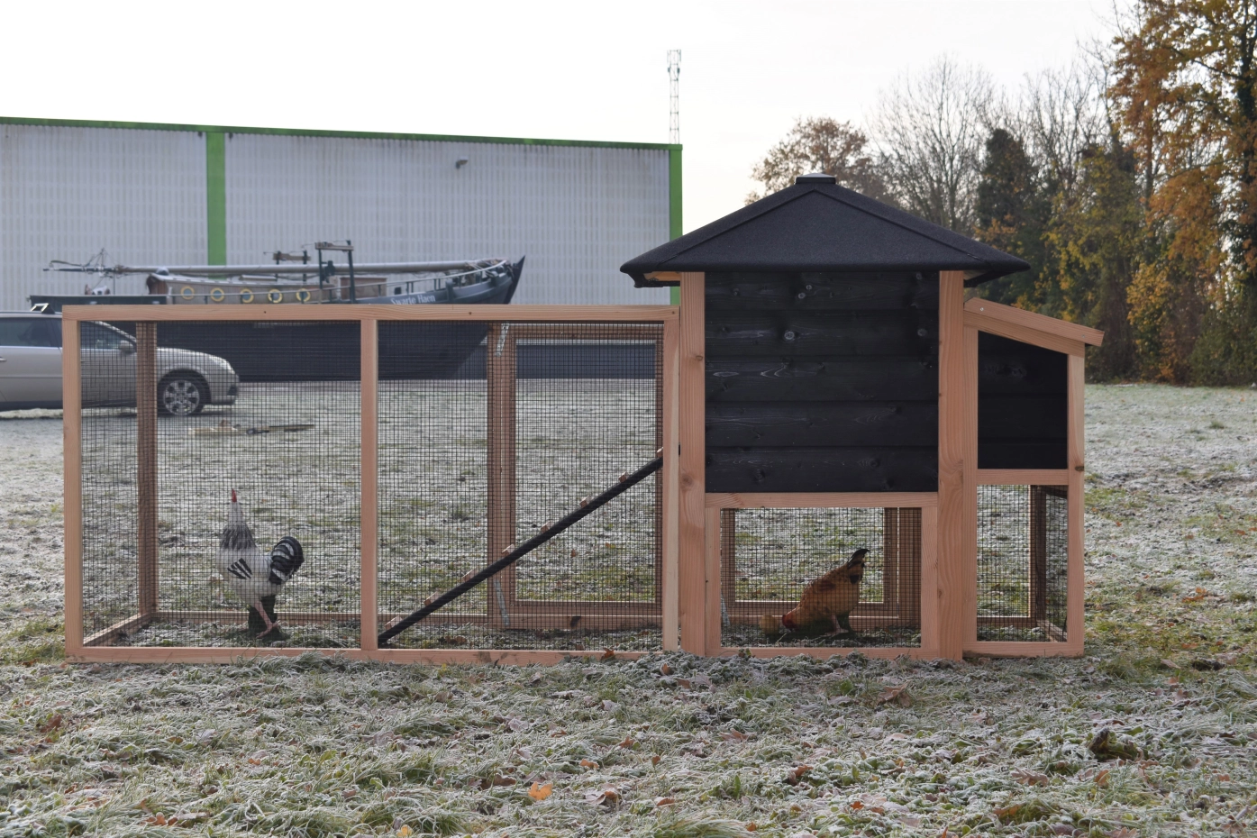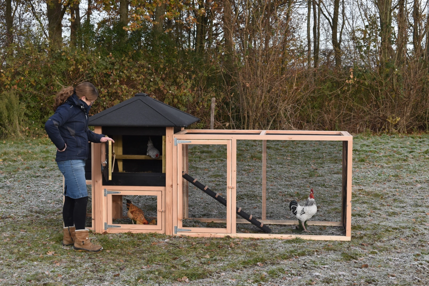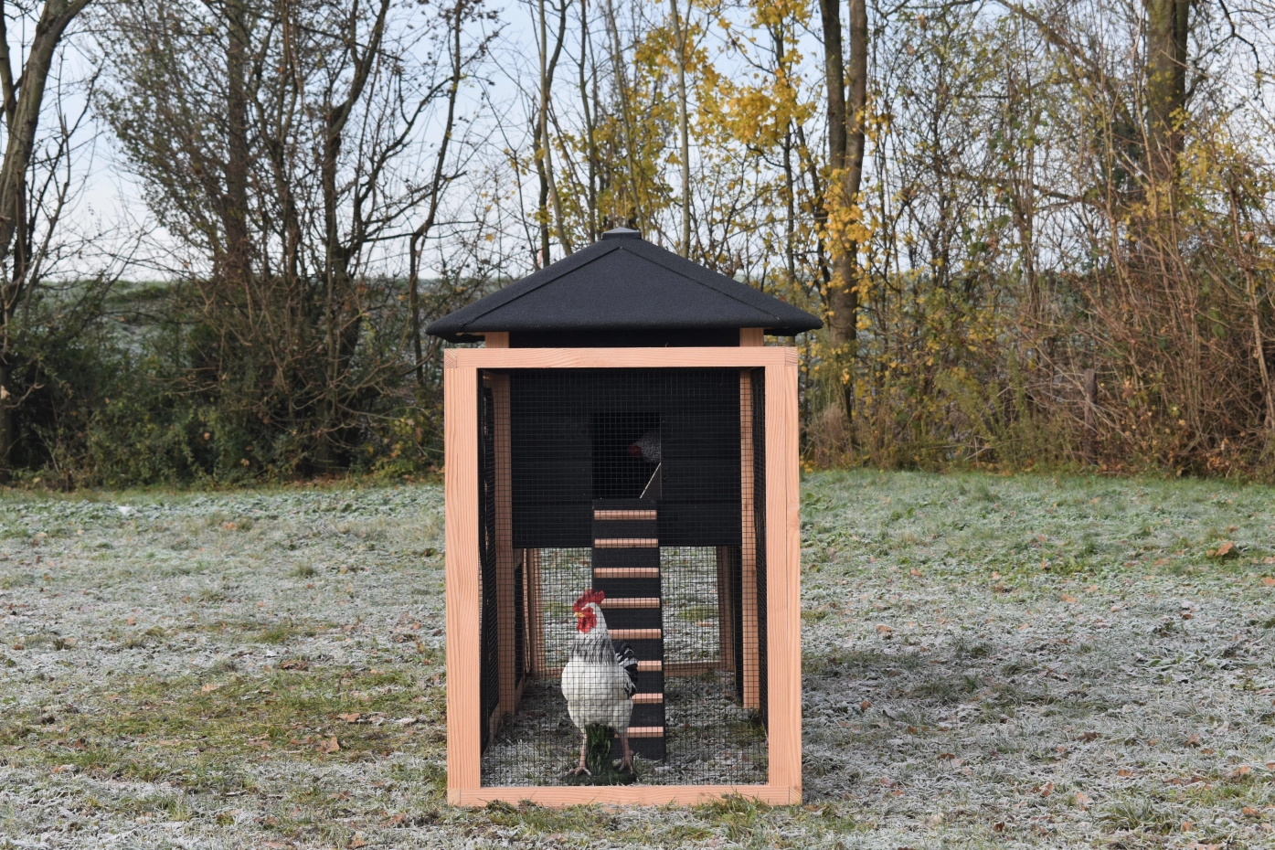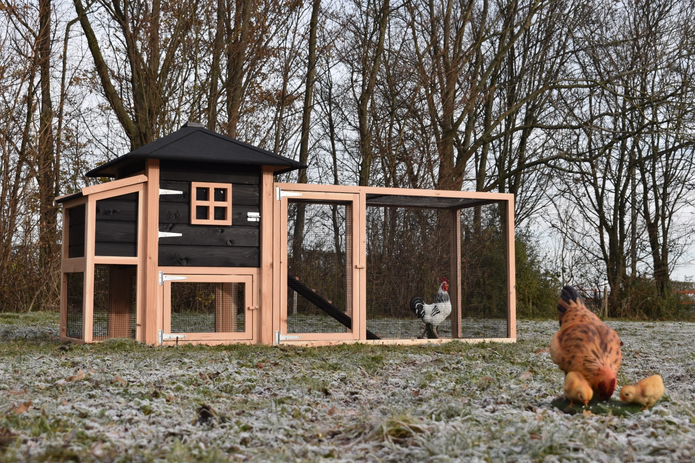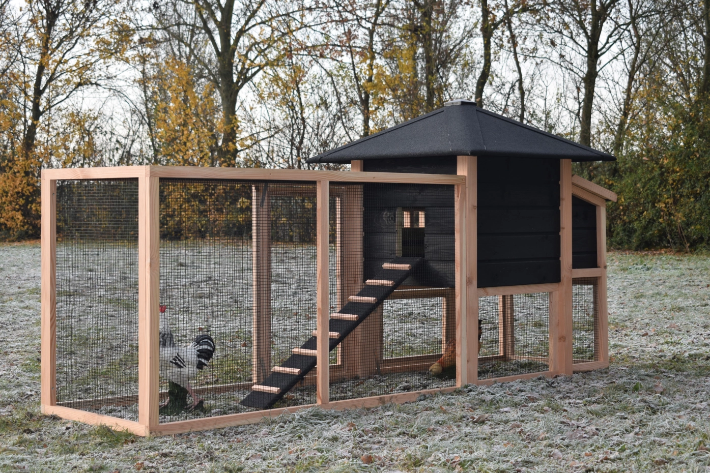 Chickencoop Rosy is extended with a laying nest and a run. The hutch has a large sleeping compartment with a large door, so you can clean the sleeping compartment very easily. The laying nest has a hinged roof, which makes that you can collect the eggs very easily. When it rains, the chickens can find a shelter under the sleeping compartment and the laying nest. The hutch is made of Douglaswood and black impregnated wood, and is free from maintenance. A good hutch for an even better price!