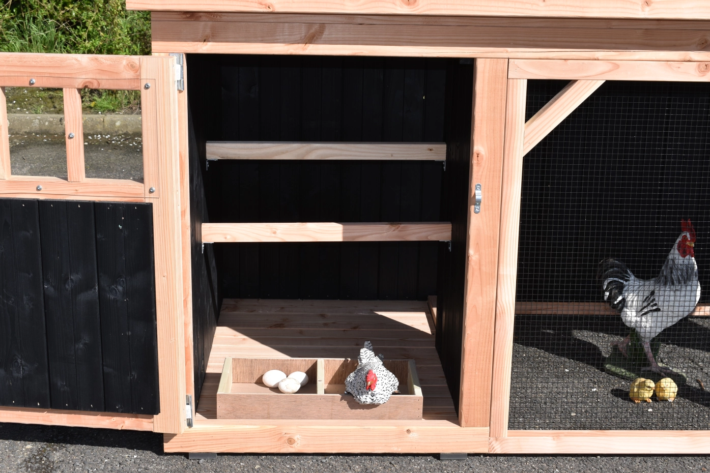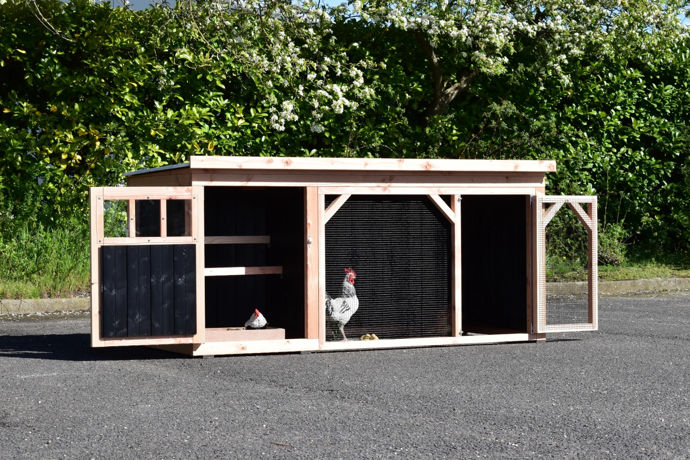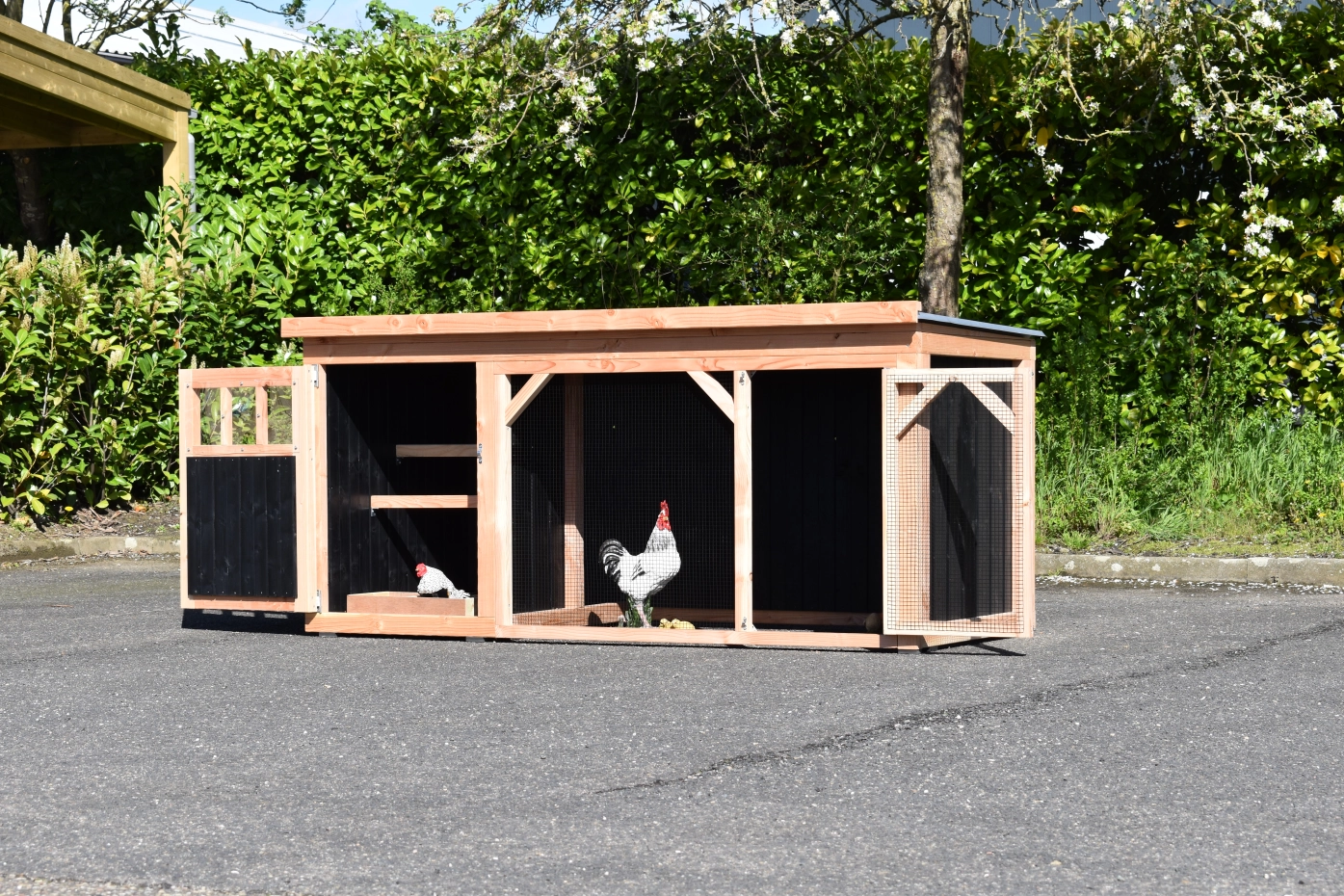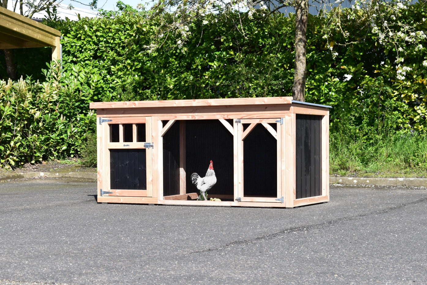 Chickencoop Belle 1 is a beautiful hutch with a covered run. The sleeping compartment is provided with a laying box, perches and a floor of douglaswood. We make this chickencoop by ourselves in our shop. Because we use high-quality materials, this hutch is almost free from maintenance.