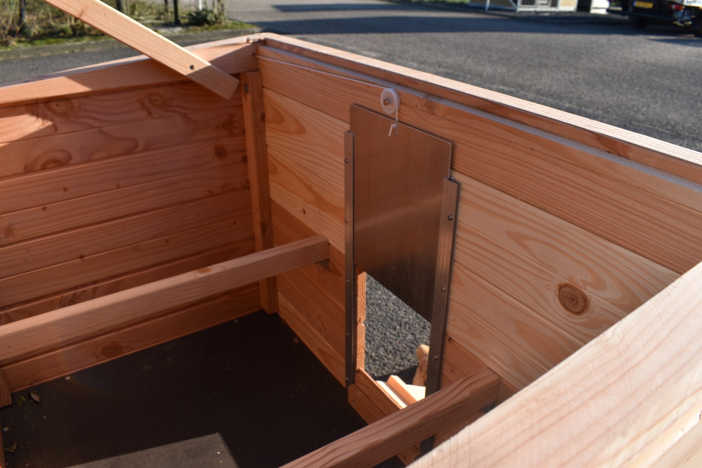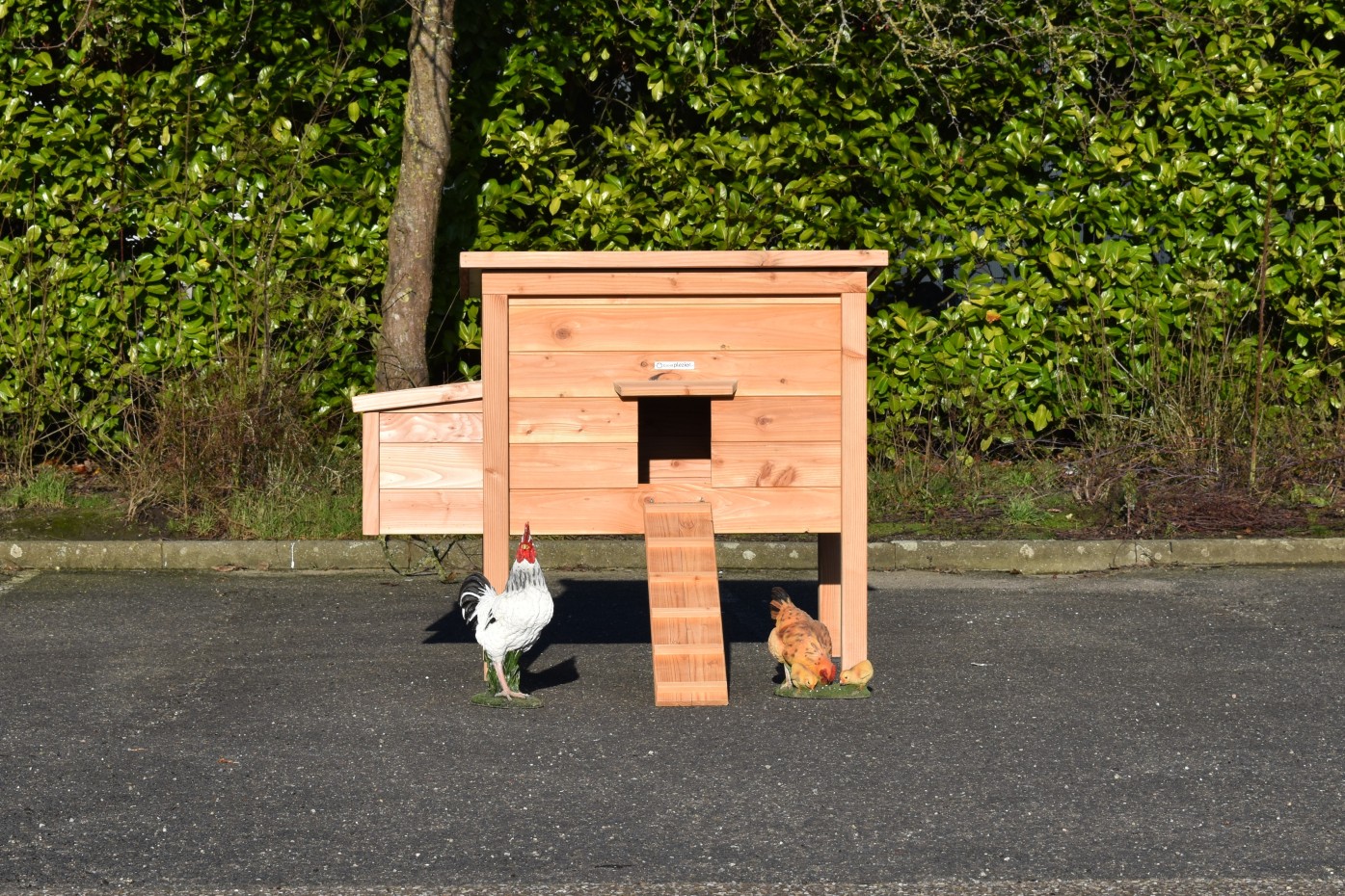 Because the coop stands on high legs, the chickens can take shelter underneath – or you can place the feeder there.