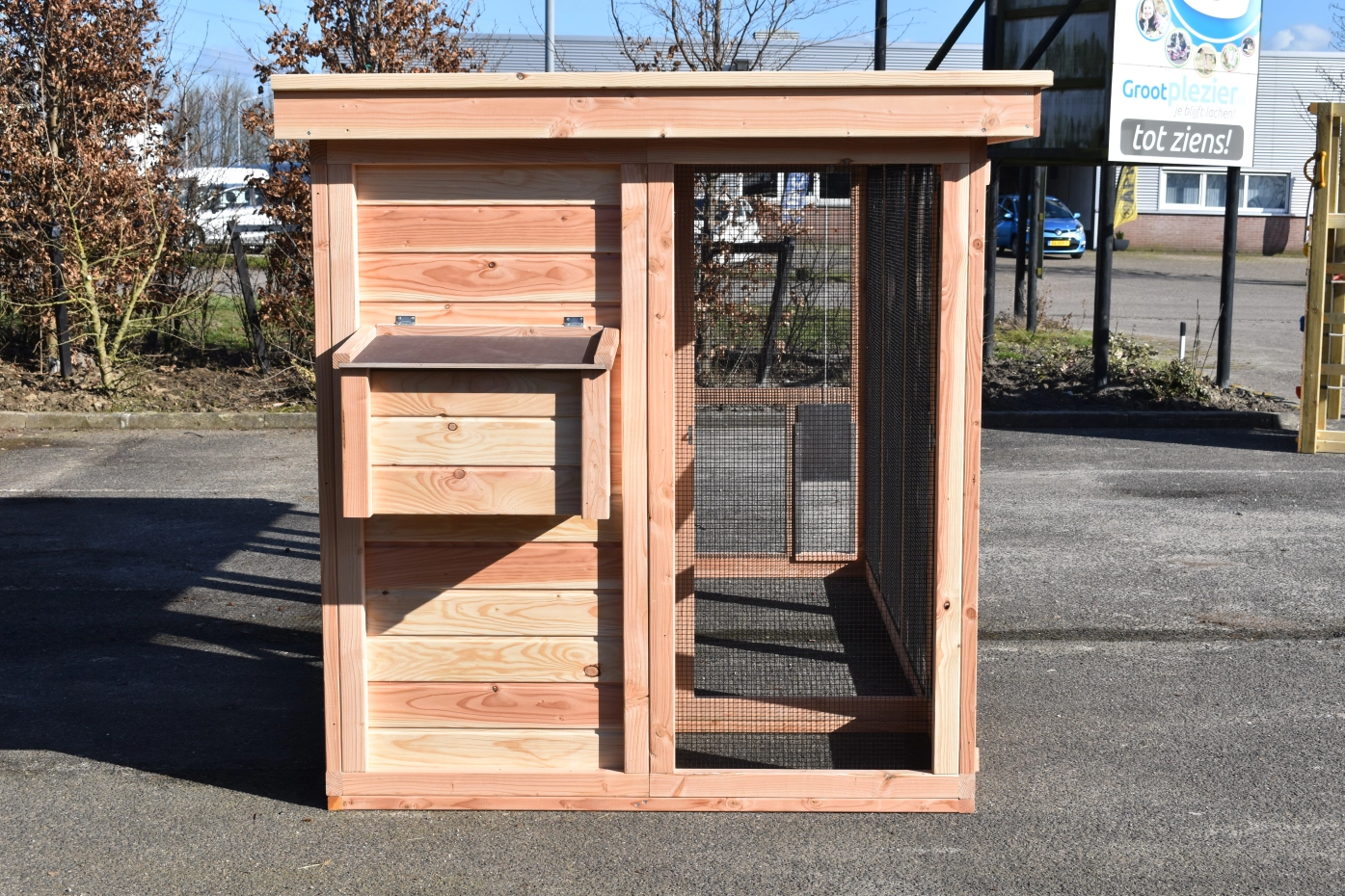 Chickencoop Flex 4.2 is a large chickencoop. Because there is used a lot of mesh, you can easily watch the chickens. In the sleeping compartment are perches and it is provided with an laying nest. There is an large door towards the run. In the run is also a little door for the chickens. There is also a practical tray, to clean the sleeping compartment.