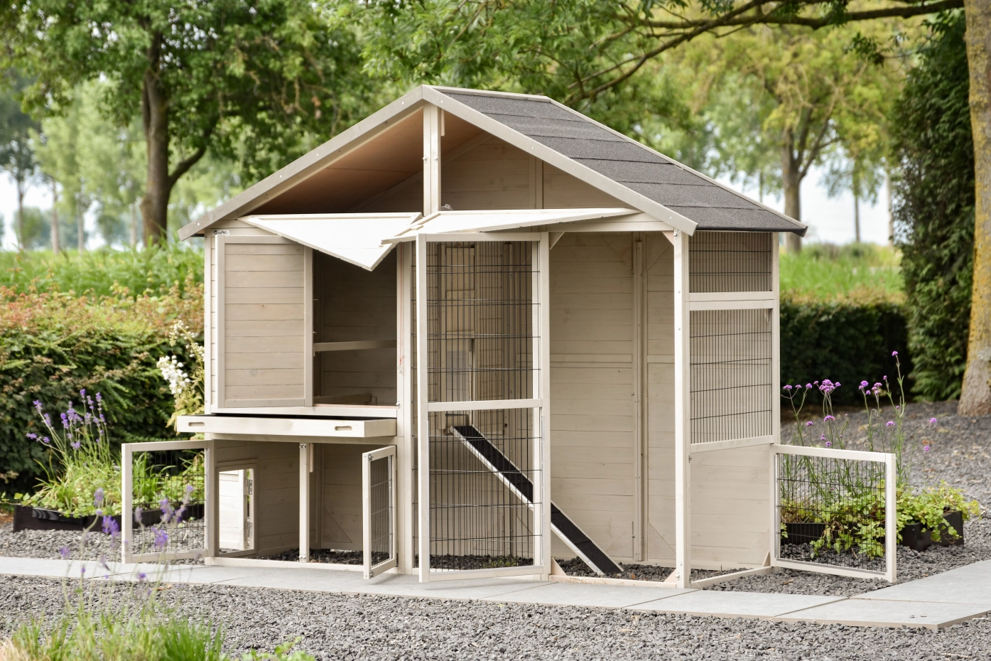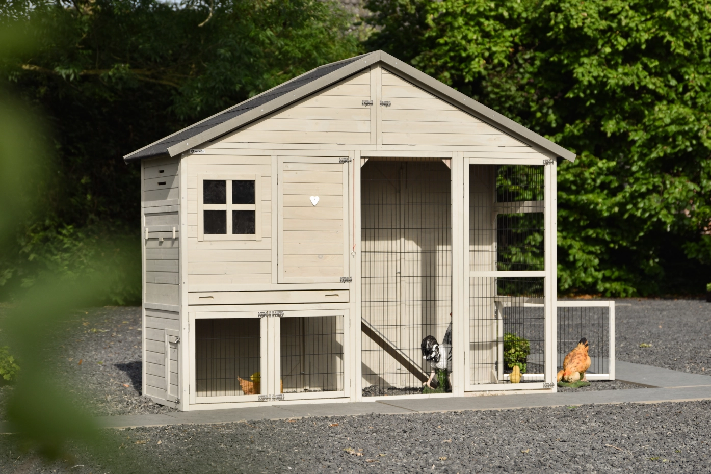 The coop also includes a run and a sleeping area with two perches. Beneath the roof is a spacious loft for storage, accessible from the front. The Holiday Large chicken coop is truly a fantastic coop, with generously sized doors throughout. It is suitable for housing approximately 6–10 chickens. The wooden door comes with a standard white heart, but it can be replaced with a cute animal figure.